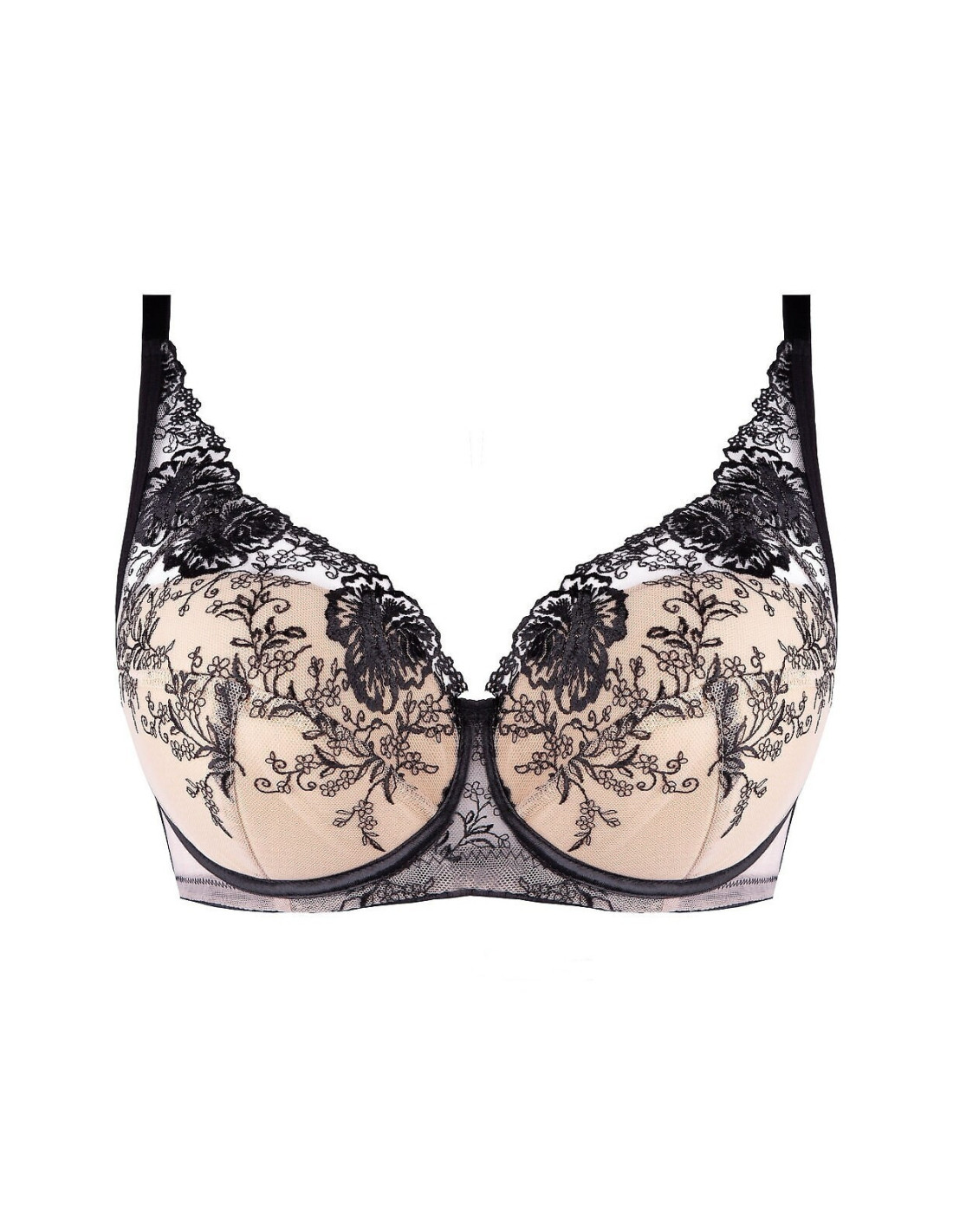 - miseczki i ramiączka z beżowej siateczki zdobione czarnym haftem