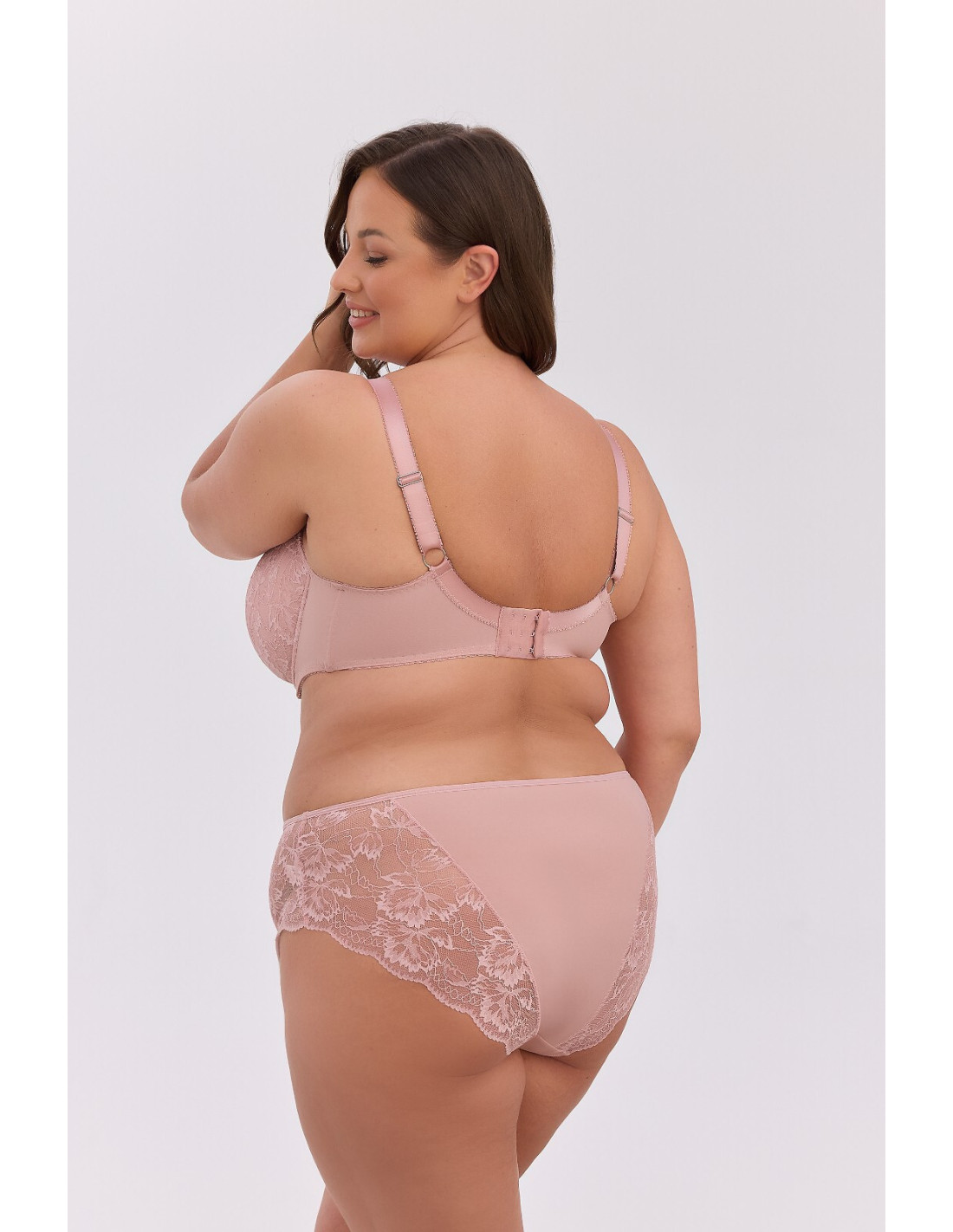 Biustonosz semi soft z fiszbinami - dla Pań z większym, pełnym biustem - miseczki z koronki o kwiatowym motywie - w górnej linii transparentna, podwójna siateczka - od wewnętrznej strony podszyte bawełną - regulowane, nieodpinane ramiączka - obwód z gładkiej mikrofibry, z pionową fiszbiną - zapinany na dwie lub trzy haftki z trzystopniową regulacją - model efektownie eksponuje biust - konstrukcja SS10