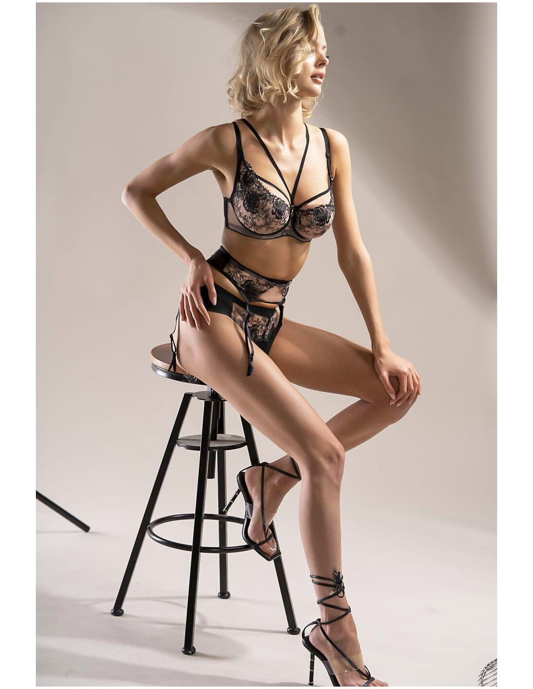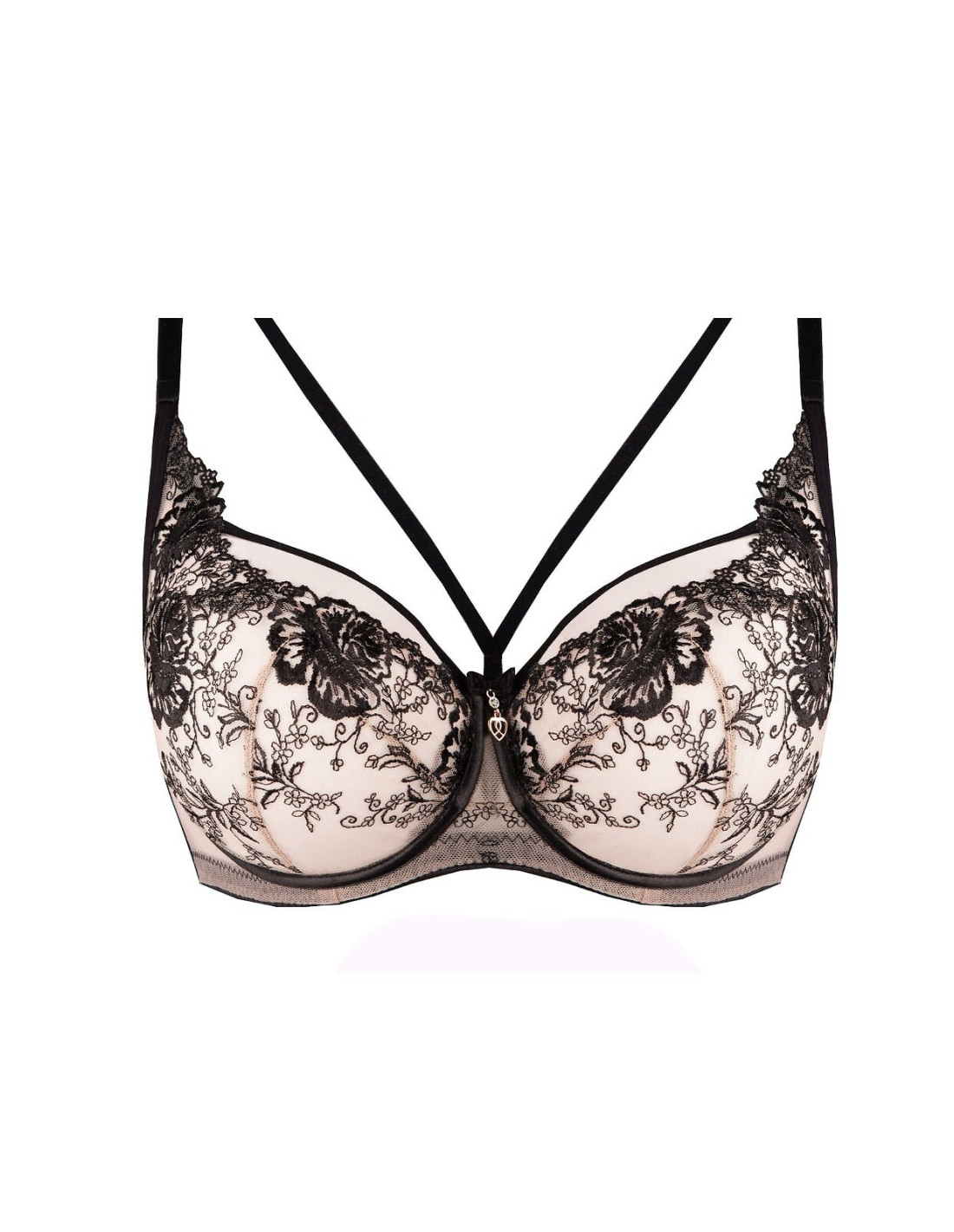 - podwójna beżowa siateczka z czarnym haftem