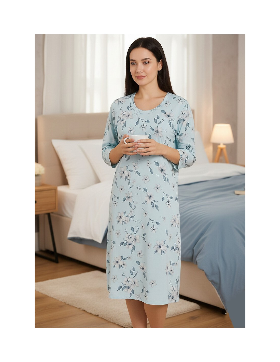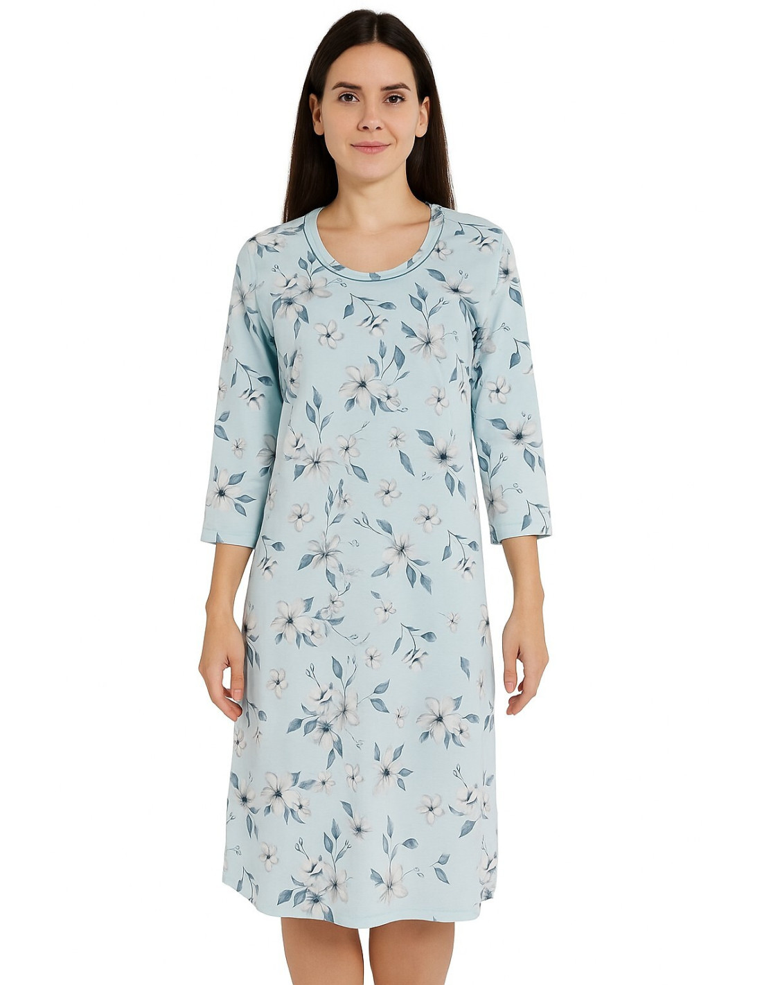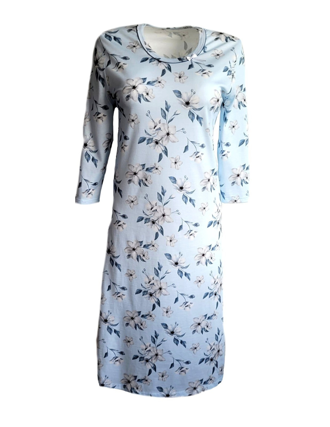 moteriški marškinėliai - aukštos kokybės medvilnė - gėlių raštas - 3/4 rankovės - apvali iškirptė su dekoratyviniu atlasiniu lankeliu - tiesus, klasikinis kirpimas - kelio ilgis