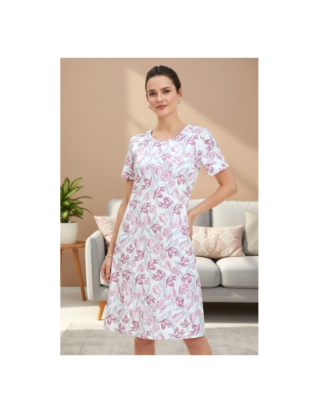 Moteriški marškinėliai, dekoruoti spalvingu raštu - aukštos kokybės medvilnė - trumpomis rankovėmis - apvali iškirptė - tiesus, klasikinis kirpimas - ilgis iki kelių - kišenės ant klubų