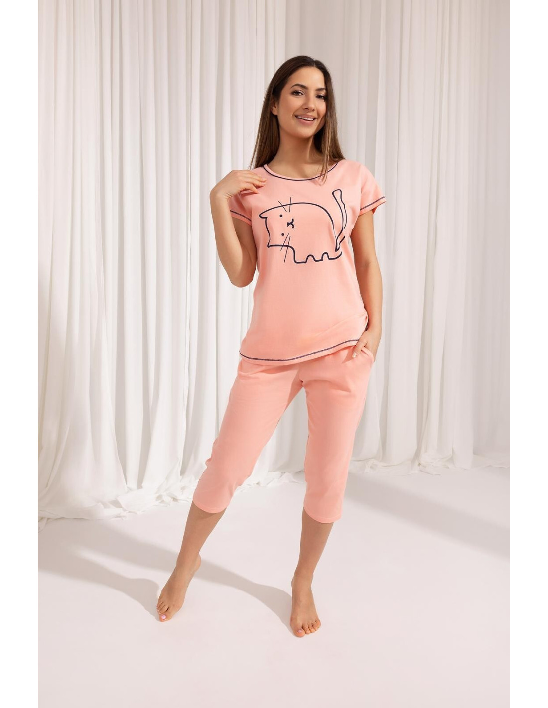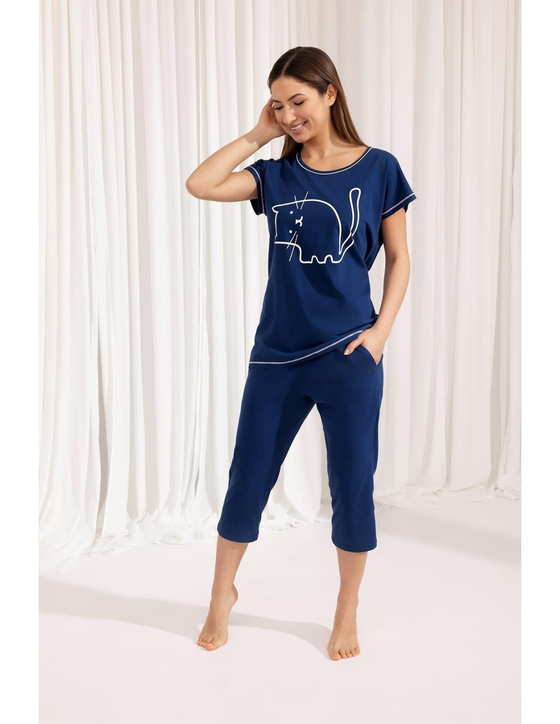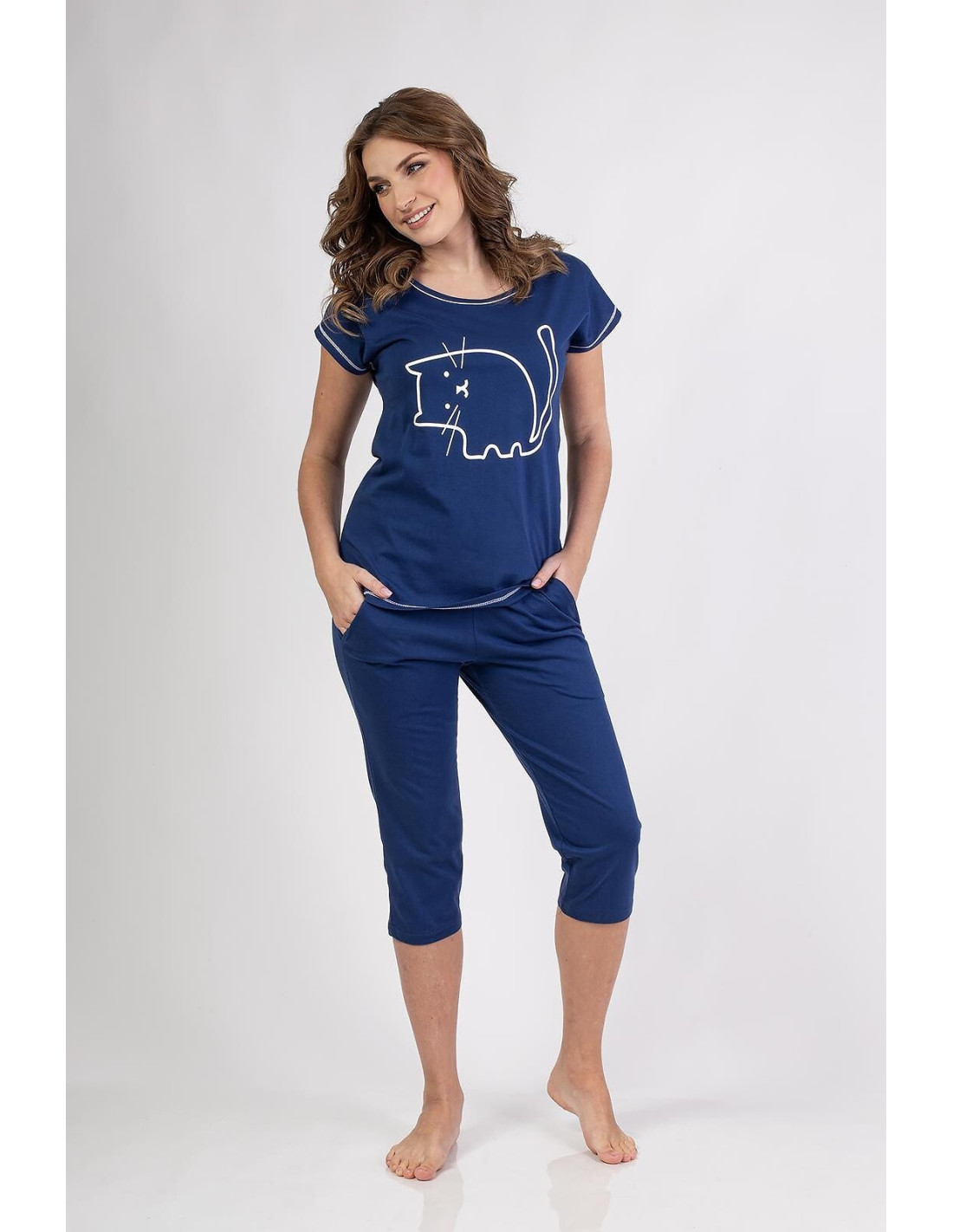 Moteriškos pižamos - aukštos kokybės medvilnė - marškinėliai trumpomis rankovėmis - apvali iškirptė - raštas ant krūtinės - tinklinio tipo kelnės - juosmuo su elastine juosta, apsiūta medvilne - kišenės ant klubų