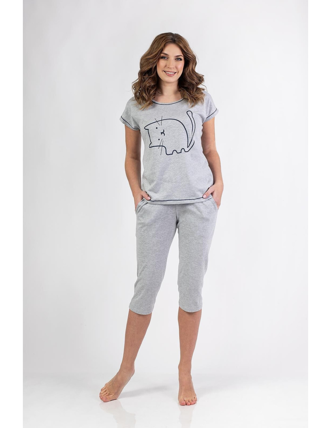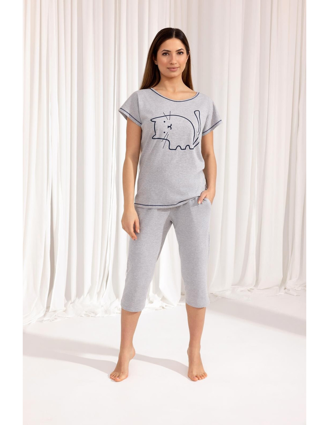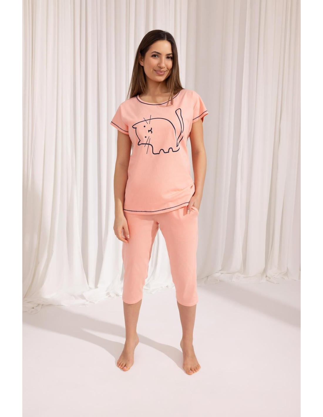 Moteriškos pižamos - aukštos kokybės medvilnė - marškinėliai trumpomis rankovėmis - apvali iškirptė - raštas ant krūtinės - tinklinio tipo kelnės - juosmuo su elastine juosta, apsiūta medvilne - kišenės ant klubų