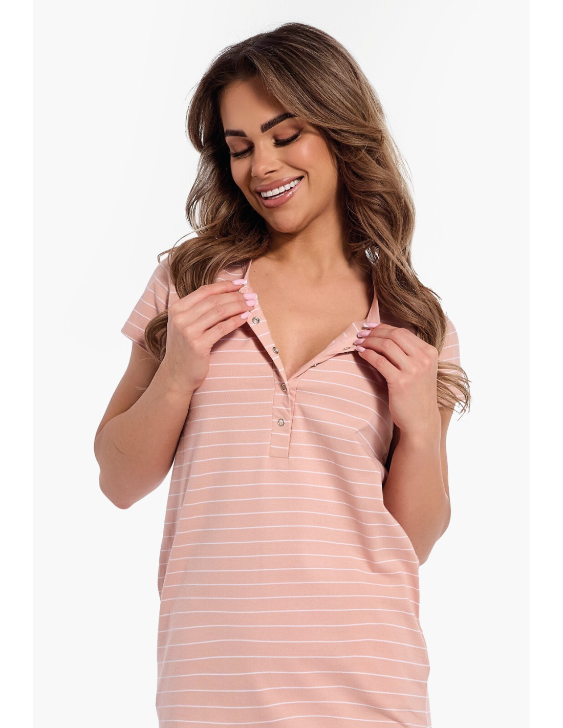 Moteriški naktiniai marškiniai - aukštos kokybės medvilnė su dryžiais - trumpomis rankovėmis - iškirptė su spaudėmis - iki kelių - šiek tiek suapvalintas apačios kraštas - patogios kišenės ant klubų