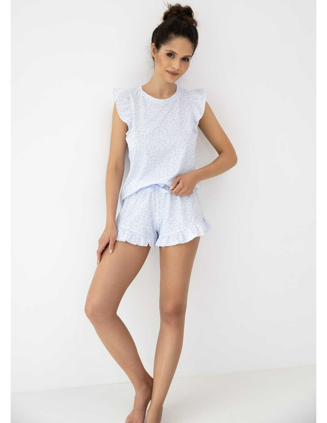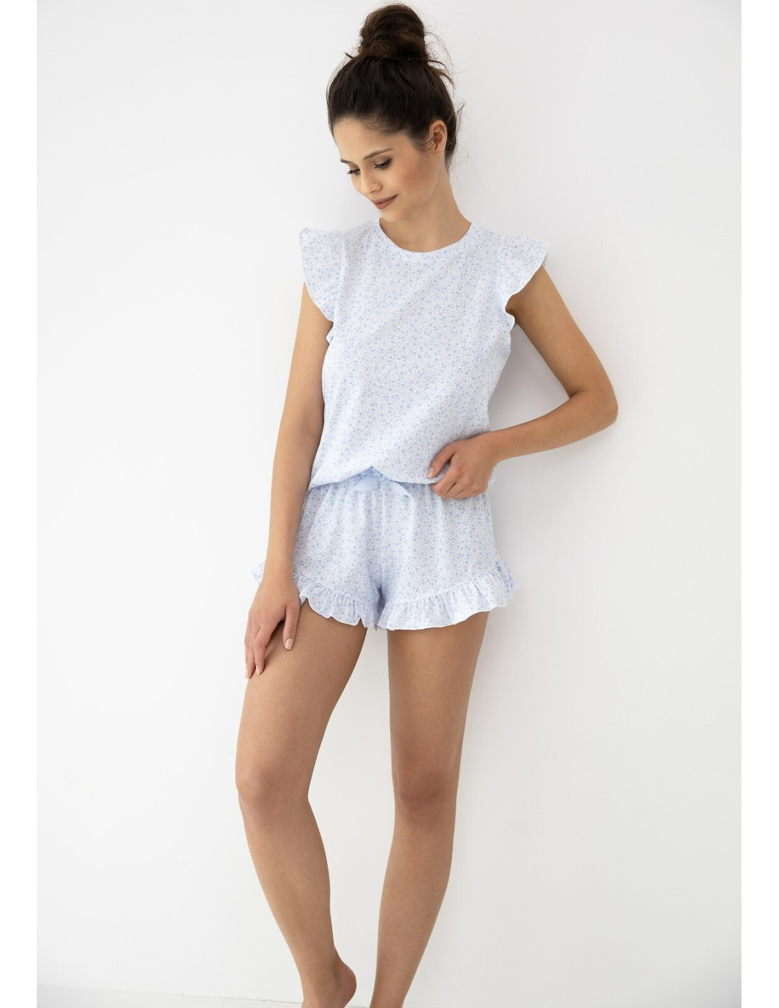 Letnia piżama damska - delikatna bawełna w kwiatuszki - koszulka z rękawem tipo motylek - półokrągły dekolt - spodenki krótkie - w pasie gumka i satynowa kokardka - nogawki zakończone falbanką