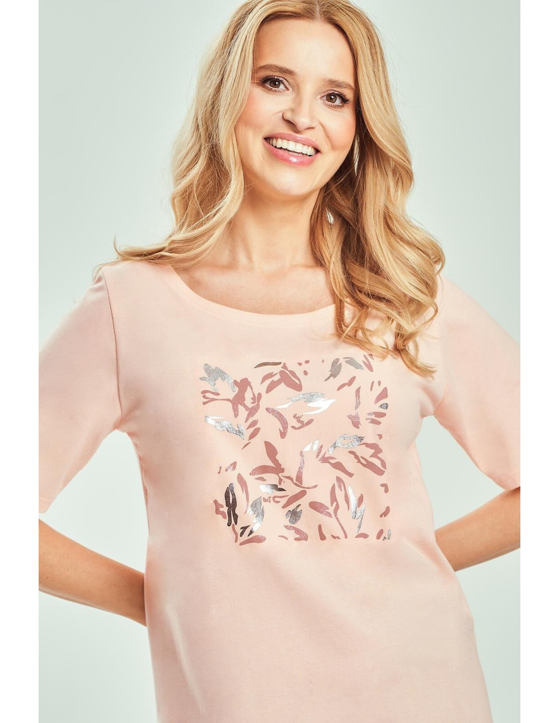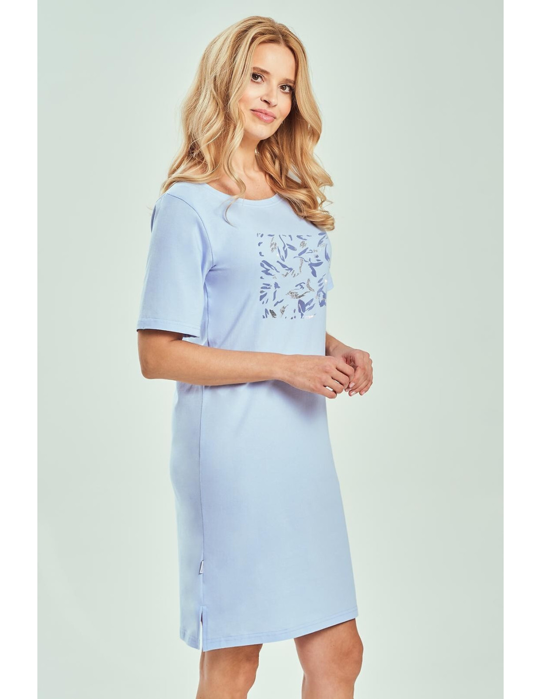 Bawełniana koszula damska - z przodu ozdobny nadruk - okrągły dekolt - krótki rękaw - długość do kolan - u dołu małe rozporki - pakowana w foliowy woreczek