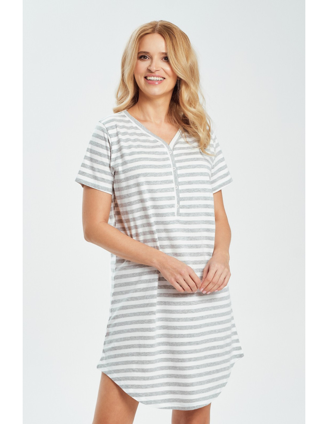 Koszula damska - wysokiej kokybės bawełna w paski - dekolt w szpic, zapinany na zatrzaski - krótki rękaw - długość przed kolano - model idealny dla mamy karmiąącej - pakowana w foliowy worek