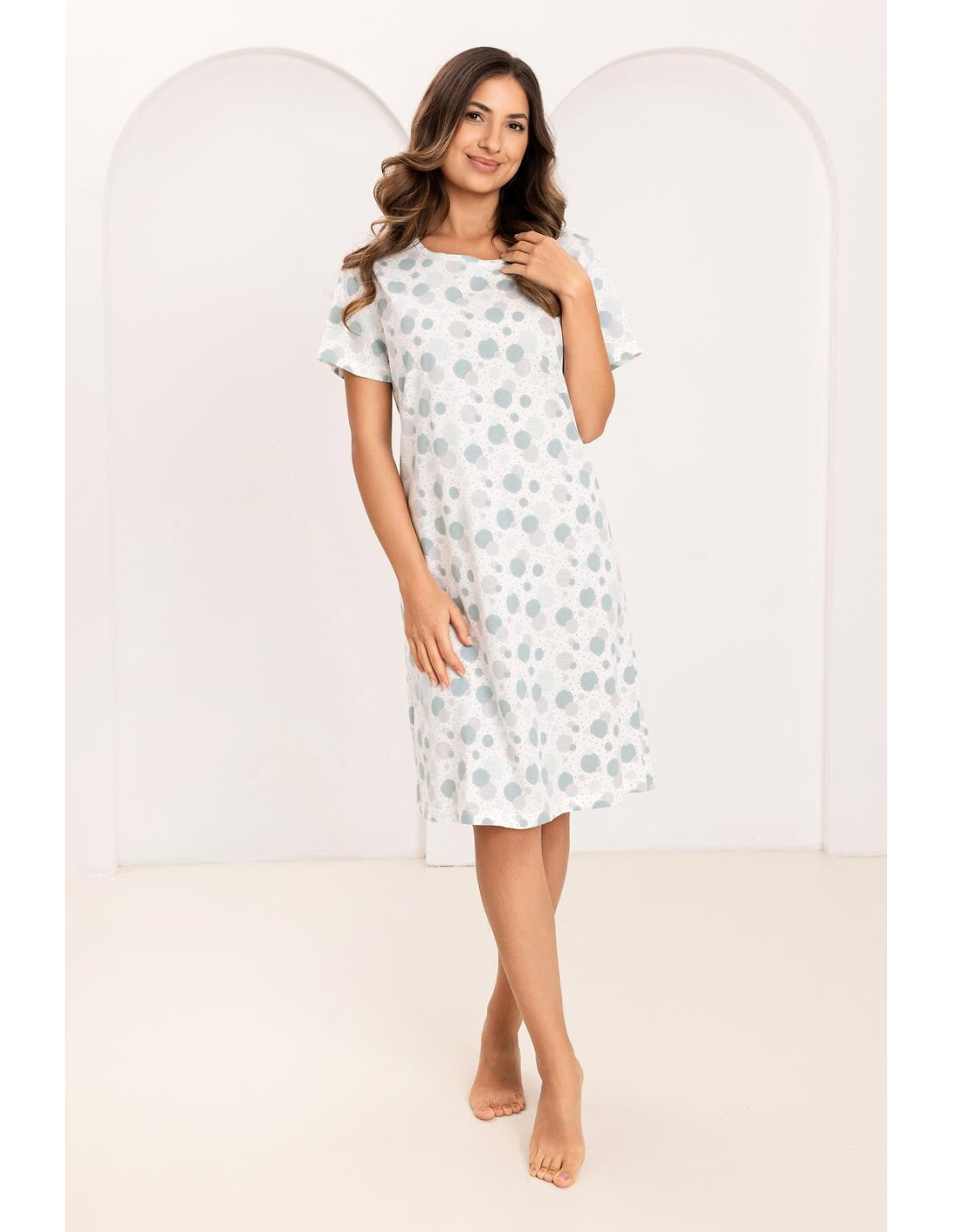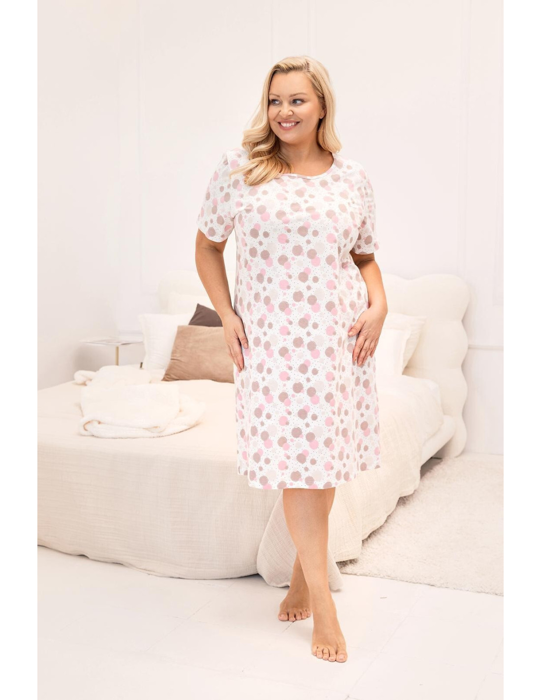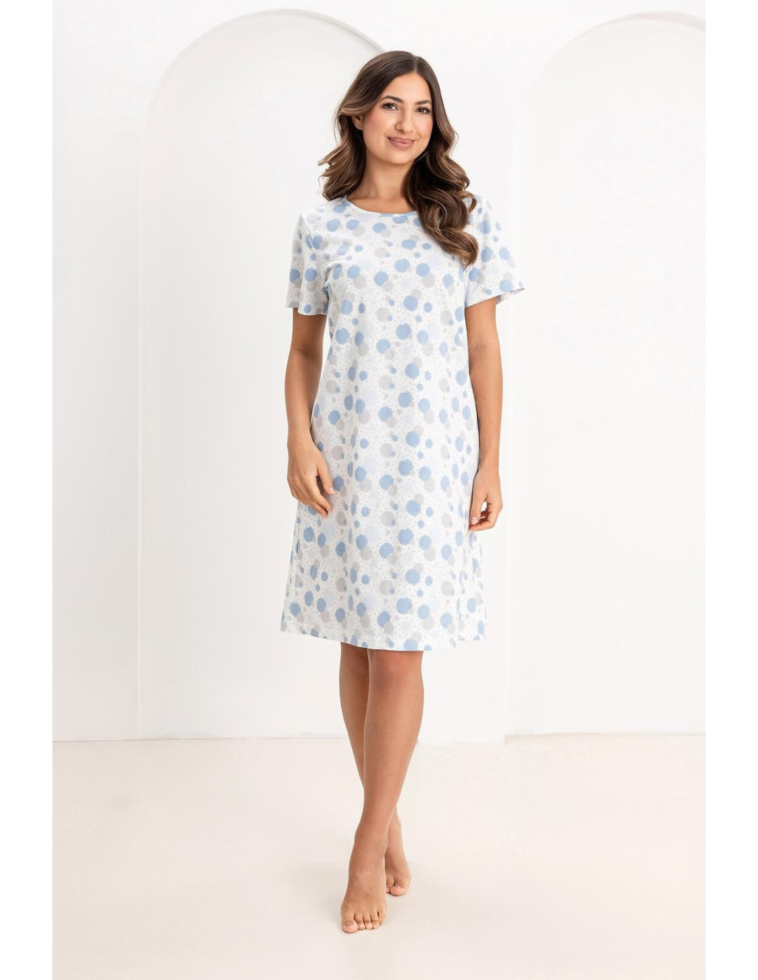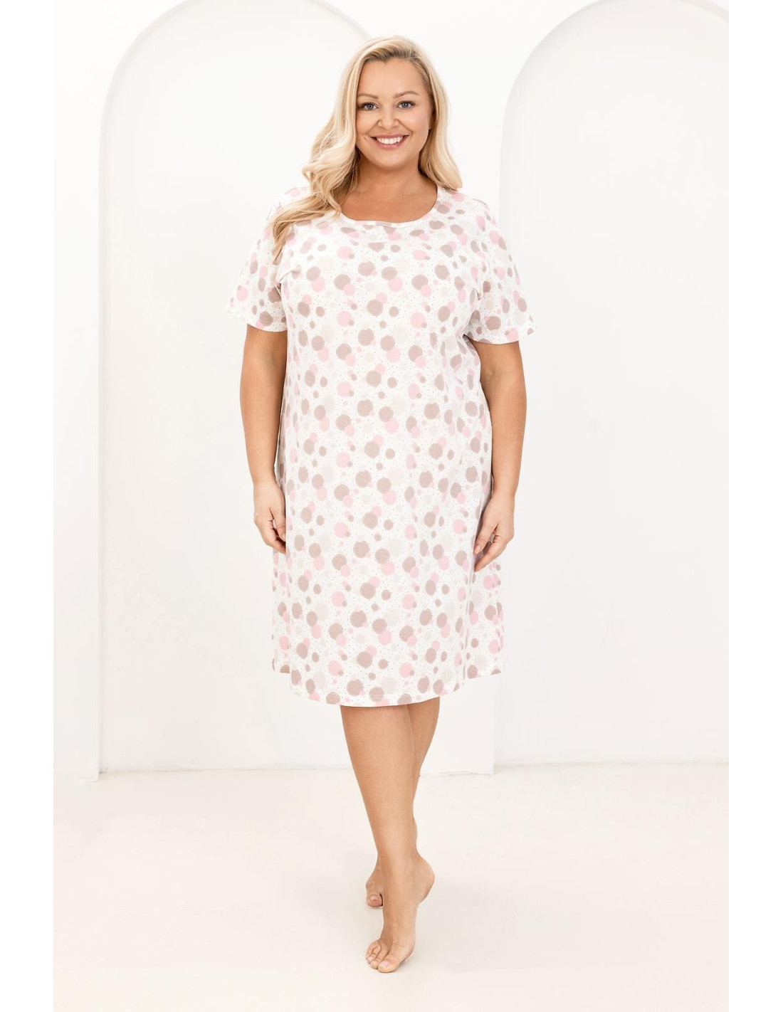 Bawełniana koszula damska - print w kółka i drobne kropki - dekolt półokrągły - krótki rękaw - długość przed kolana