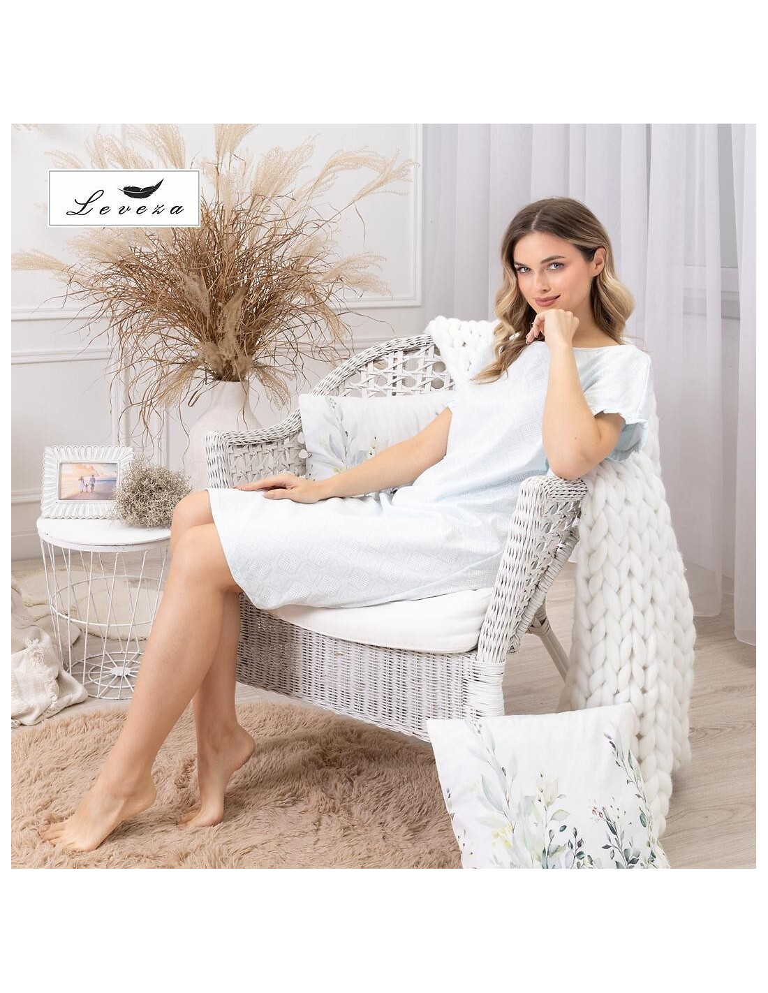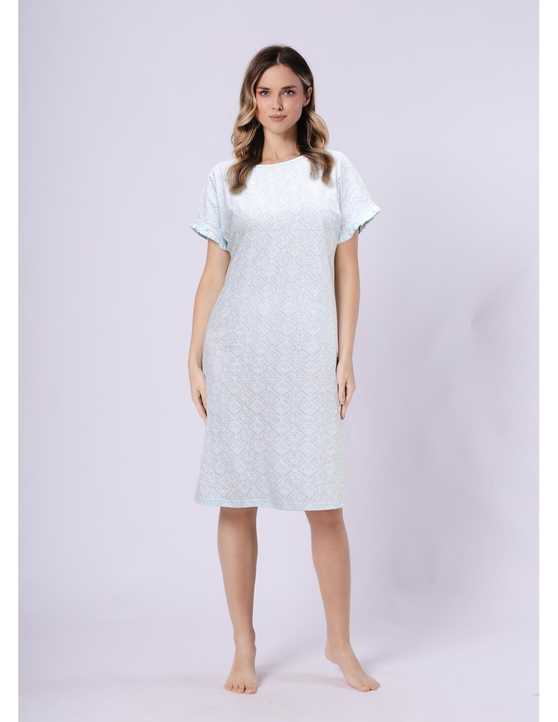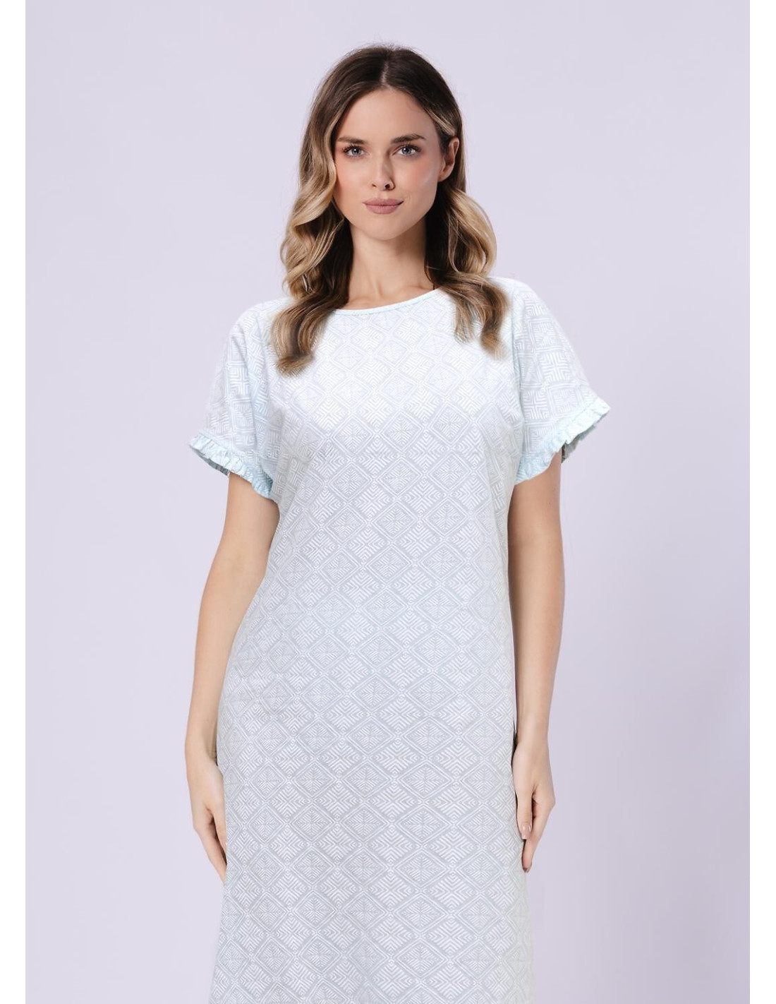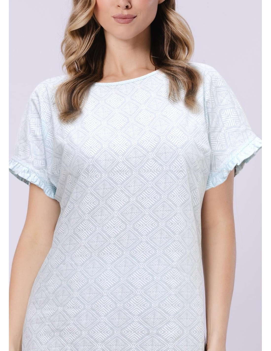 Bawełniana koszula damska - krótki rękaw, obszyty falbanką - dekolt półokrągły - ozdobiona orientalnym printem - długość przed kolano