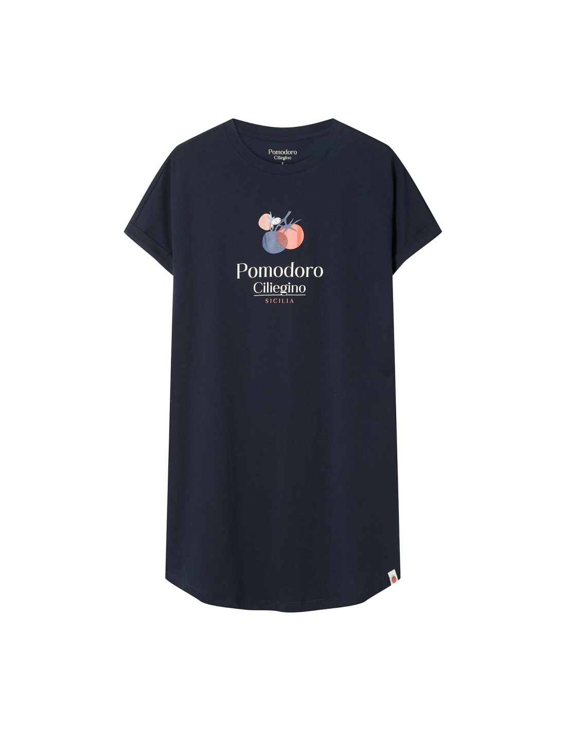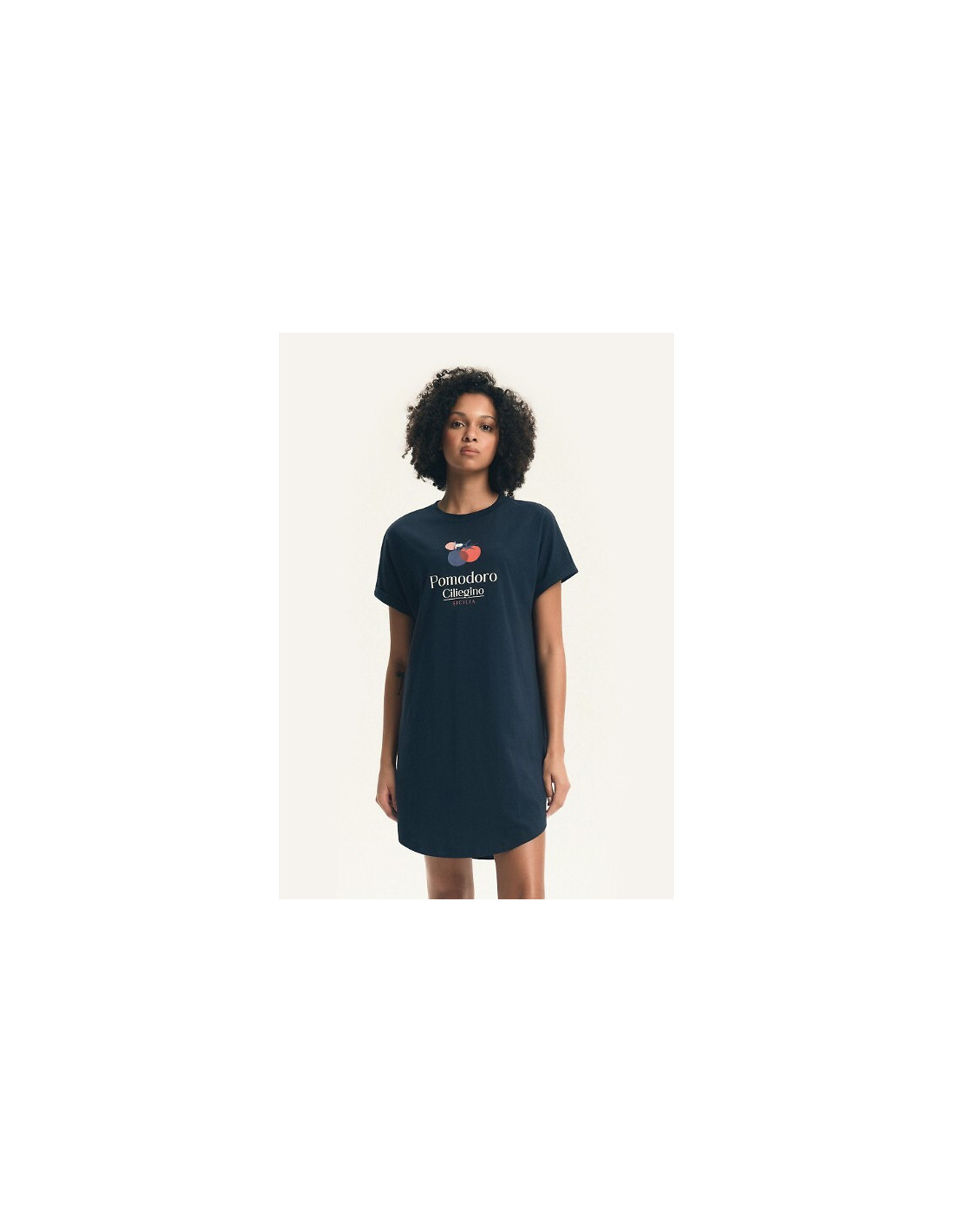 Bawełniana koszula damska - przód ozdobiony printem z pomidorem - krótki rękaw - dekolt półokrągły - luźny, swobodny fason - długość przed kolano - pakowana w foliowy worek
