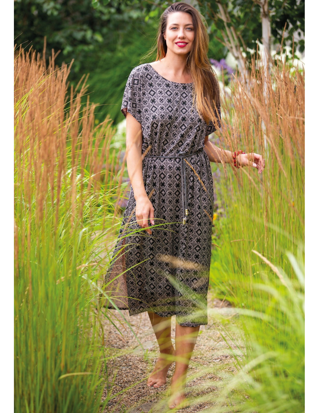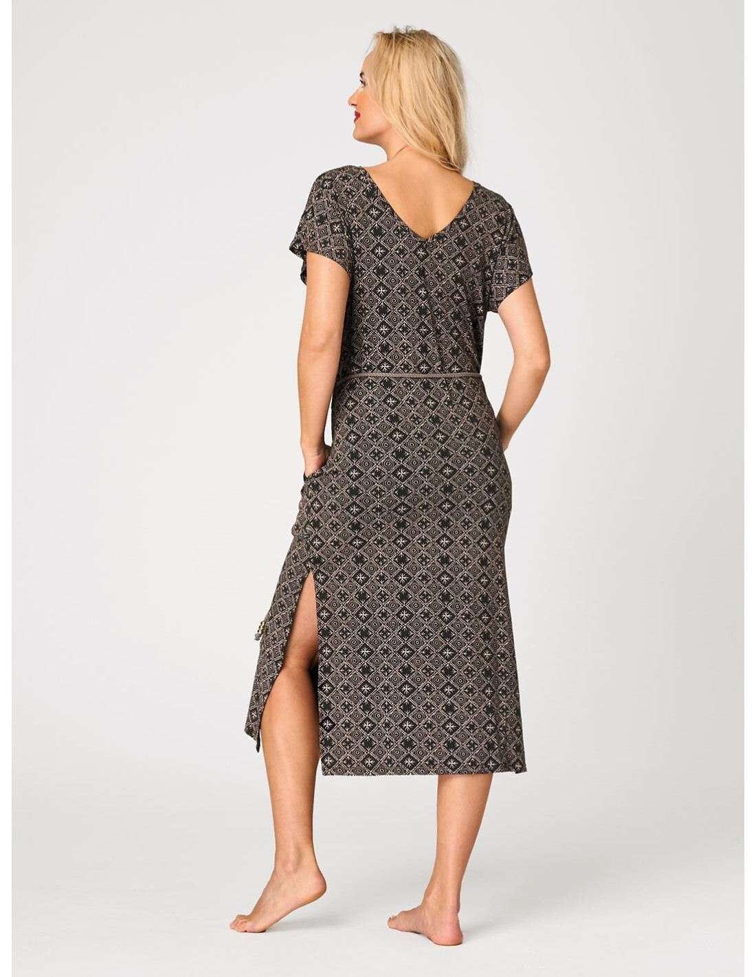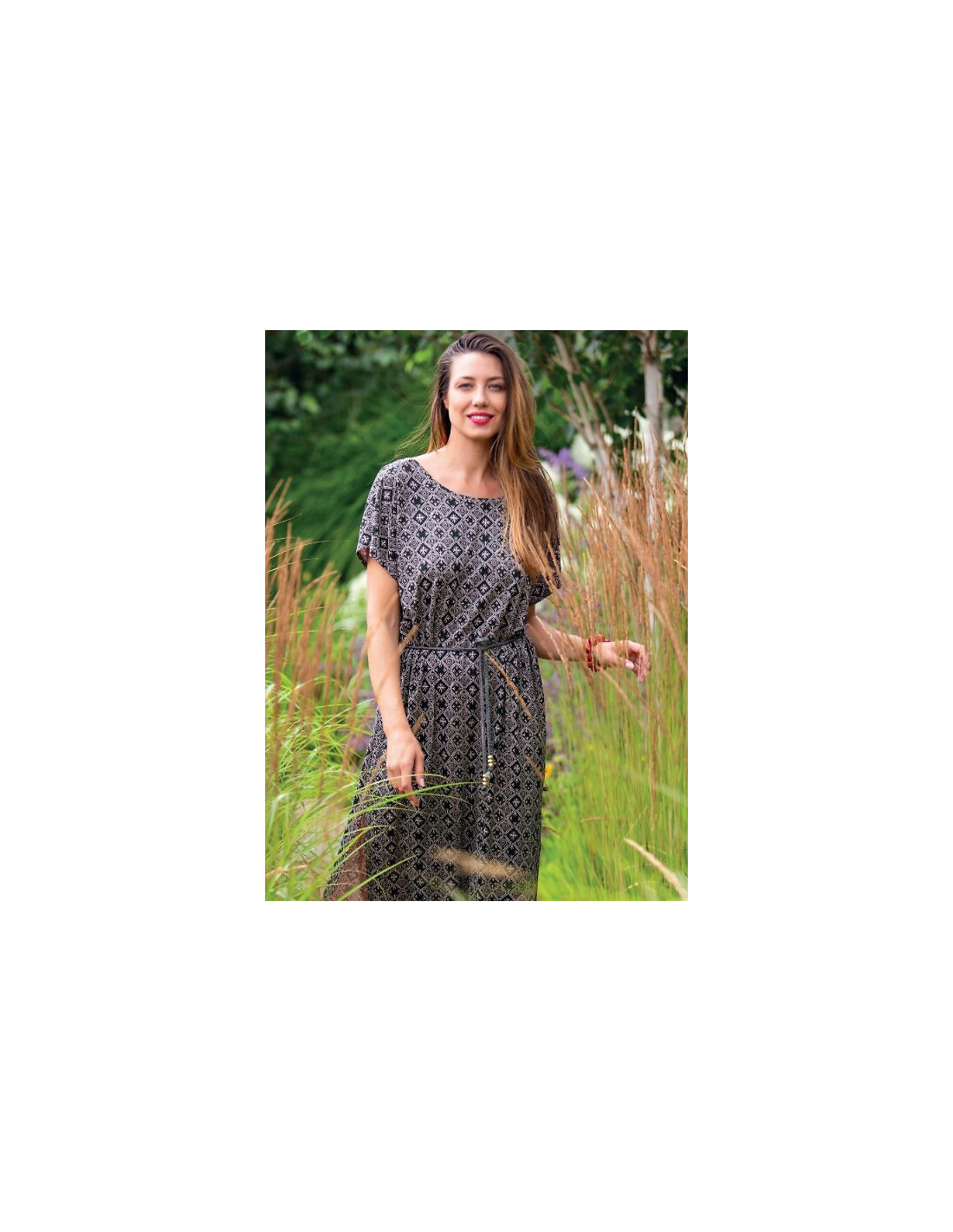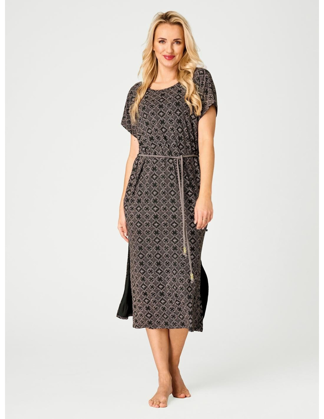 Letnia sukienka damska - delikatna wiskoza - geometryczny print - krótki rękaw - dekolt okrągły - plecy w kształcie litery "V" - wiązana w talii plecionym sznureczkiem zakończonym złotymi koralikami - u dołu efektowne rozcięcia - length za kolano