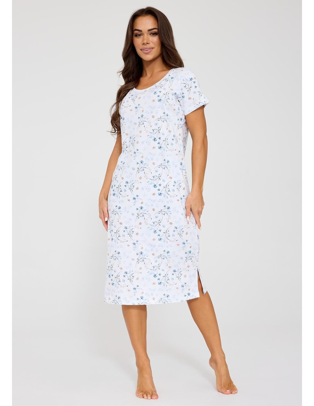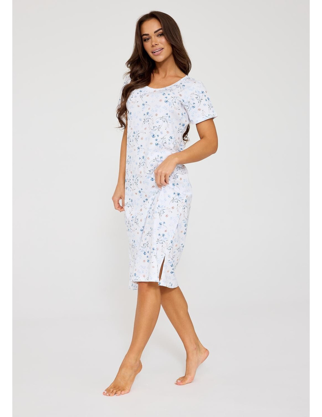 Bawełniana koszula nocna - roślinny print - krótki rękaw - półokrągły dekolt - długość za kolano - boki z rozcięciami