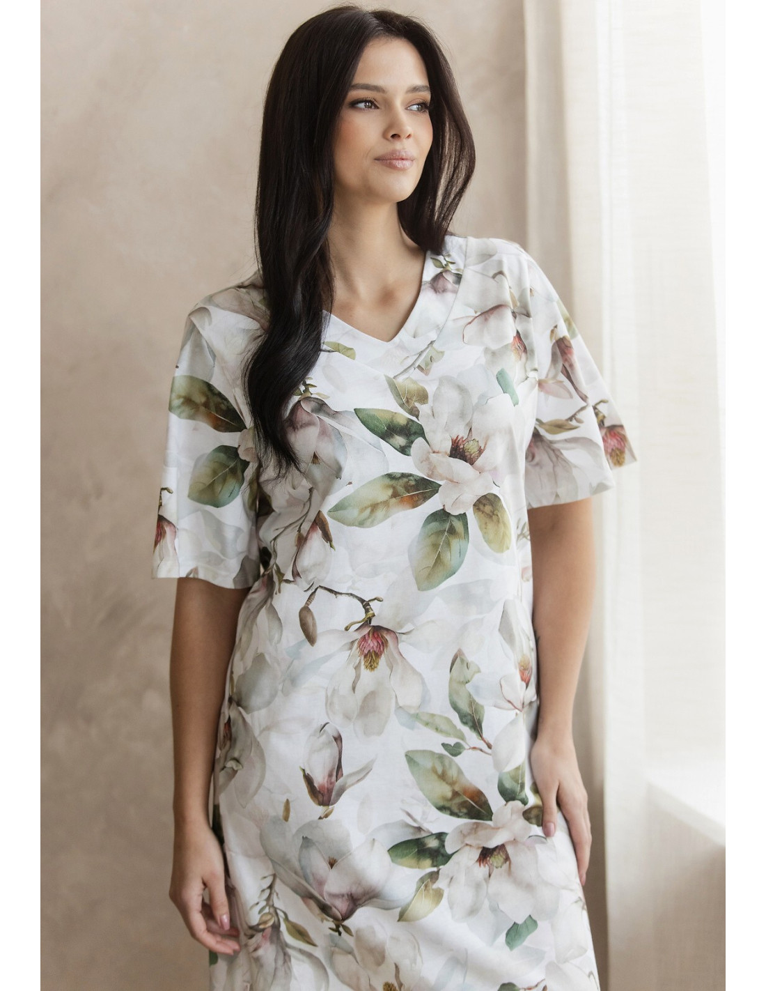 Bawełniana koszula damska - roślinny print - dekolt w szpic - krótki rękaw - długość do kolan - u dołu małe rozporki - pakowana w foliowy woreczek