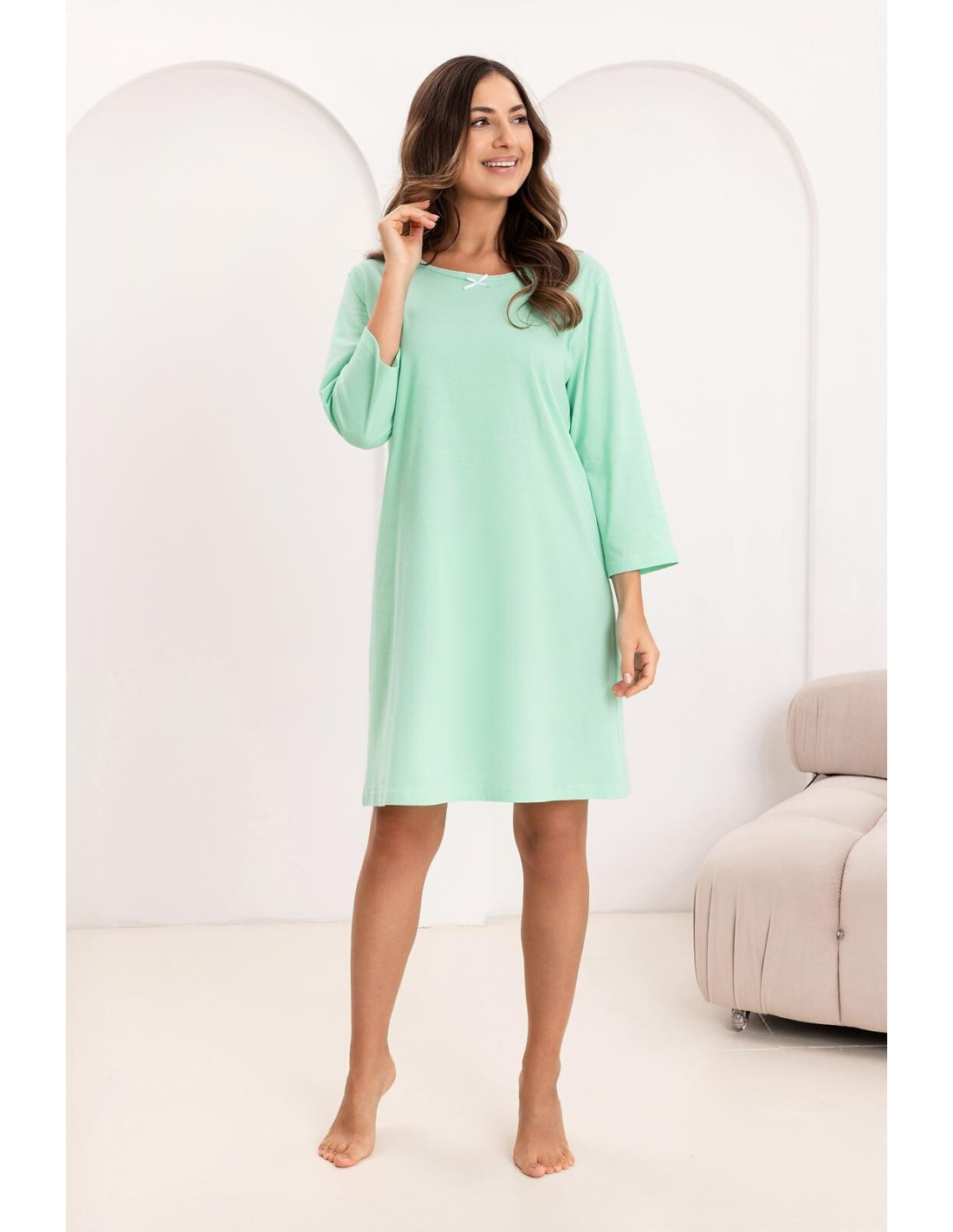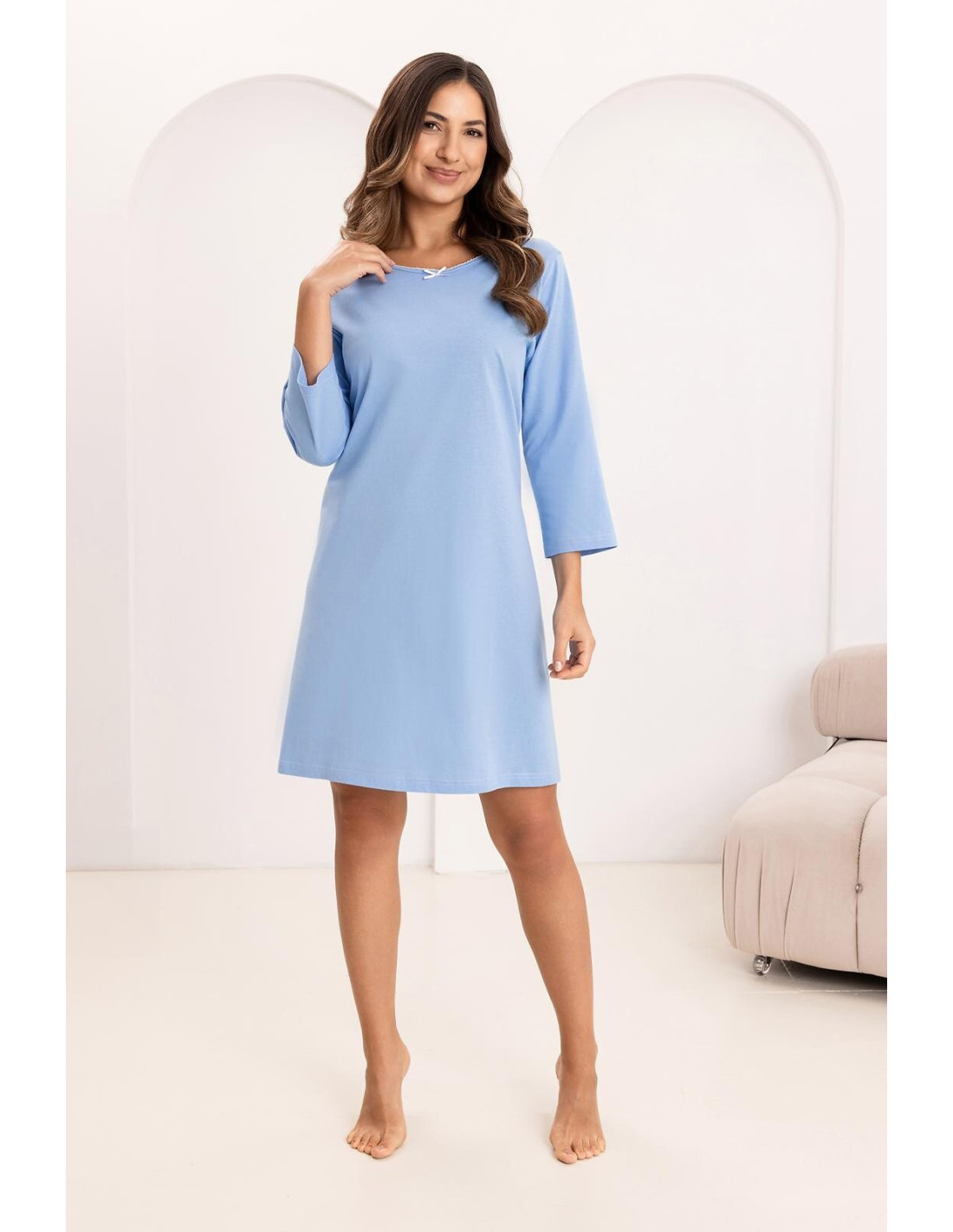 Bawełniana koszula damska - jednolita, gładka - dekolt półokrągły z ozdobnym obszyciem i kokardką - rękaw 3/4 - długość przed kolana