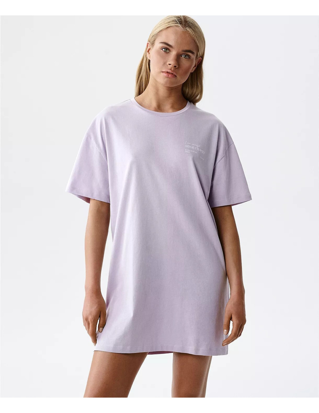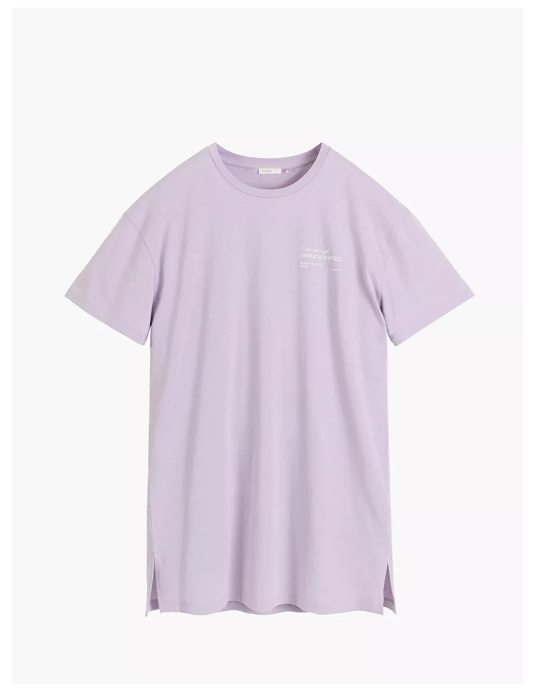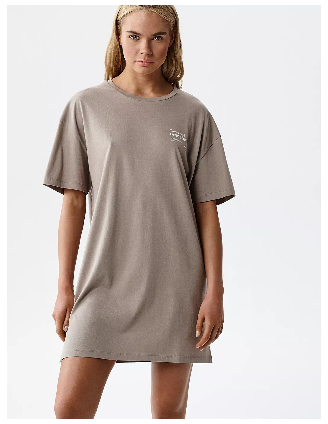 Koszula nocna damska -prosty, swobodny krój zapewniający komfort noszenia -klasyczne, okrągłe wycięcie pod szyją - krótki rękaw -inspirujące motto umieszczone z przodu koszuli - dół koszuli z rozcięciami na bokach