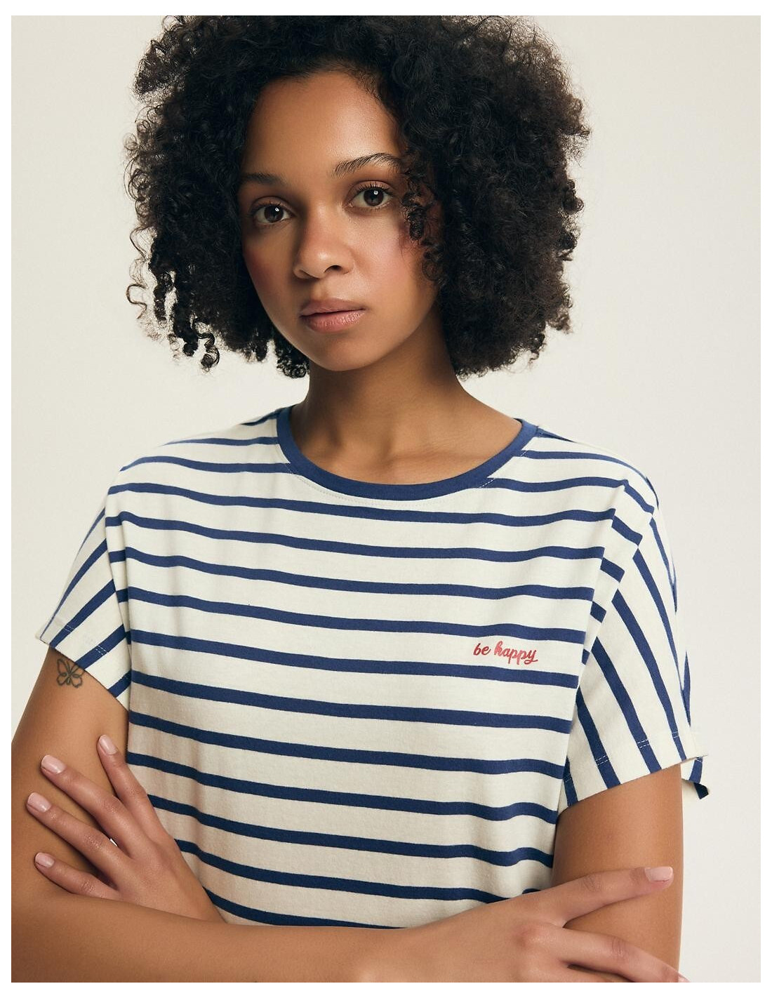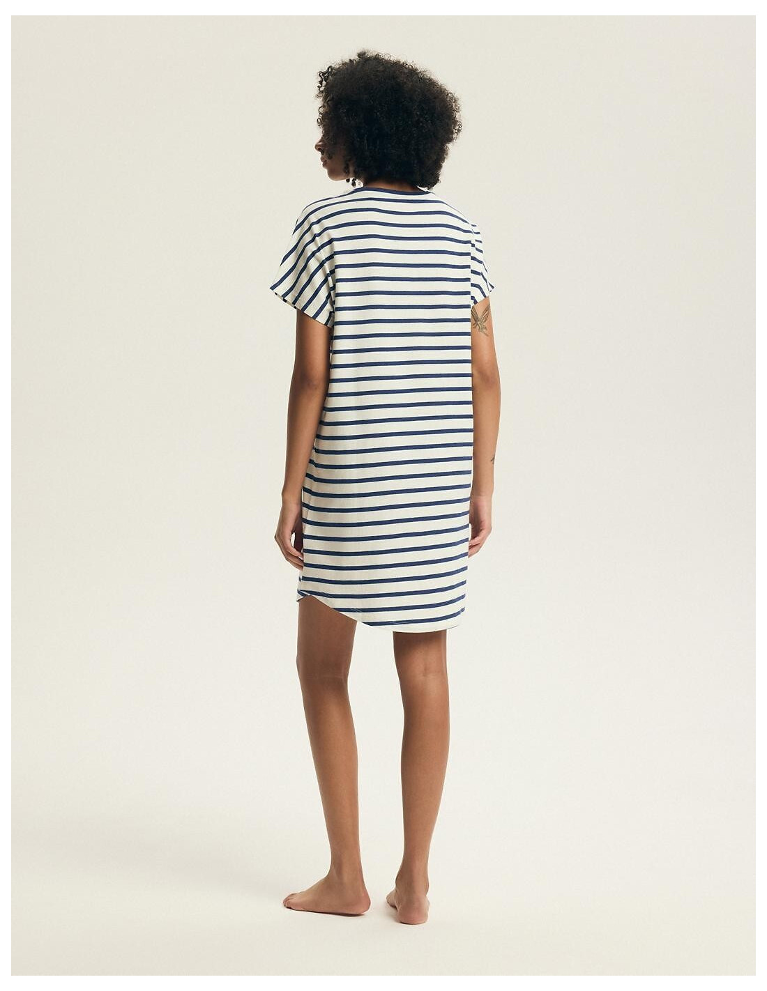 Bawełniana koszula damska - wzór w paski - dekolt półokrągły - krótki rękaw - na piersi delikatny nadruk "be happy" - luźny, swobodny fason - dół zaokrąglony - długość przed kolano - pakowana w foliowy worek