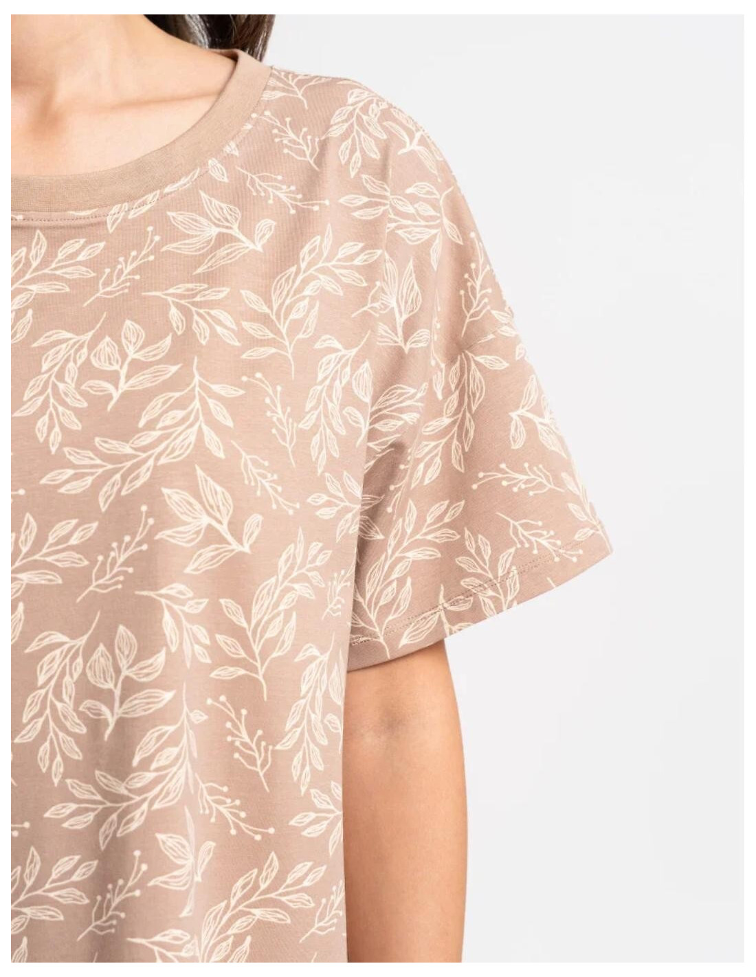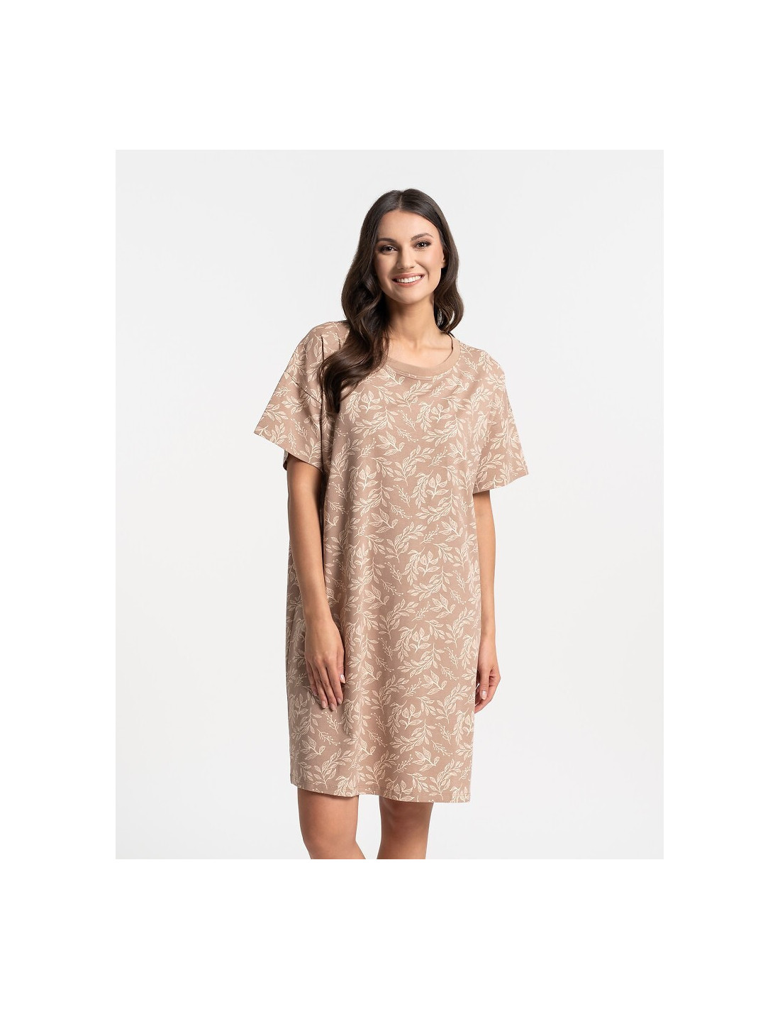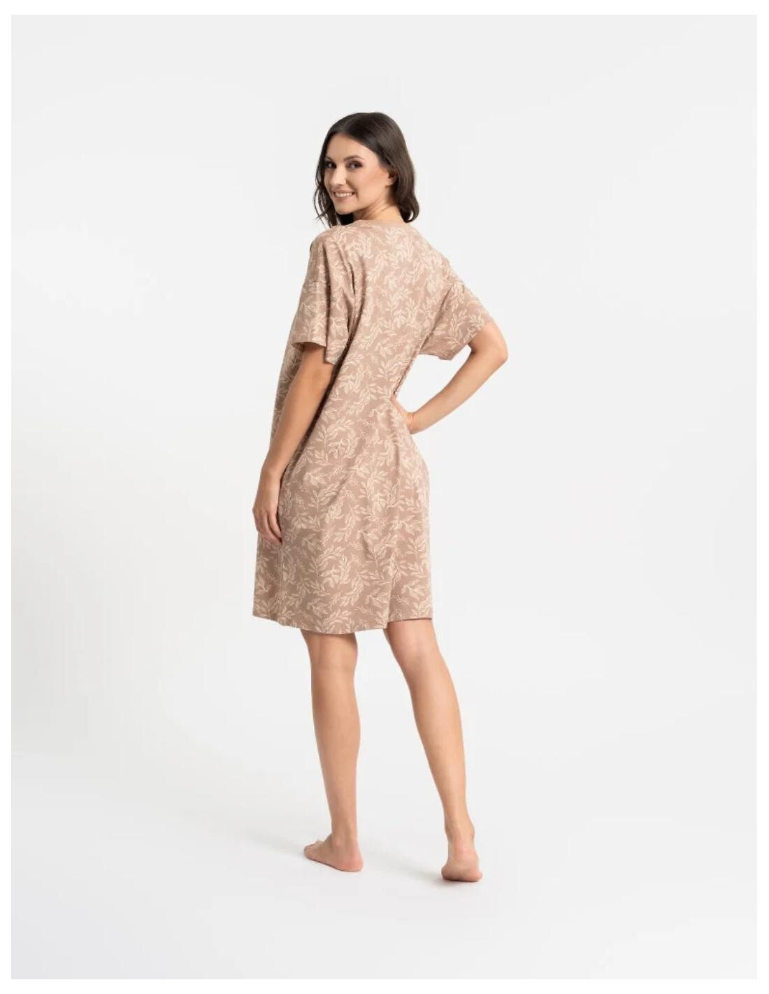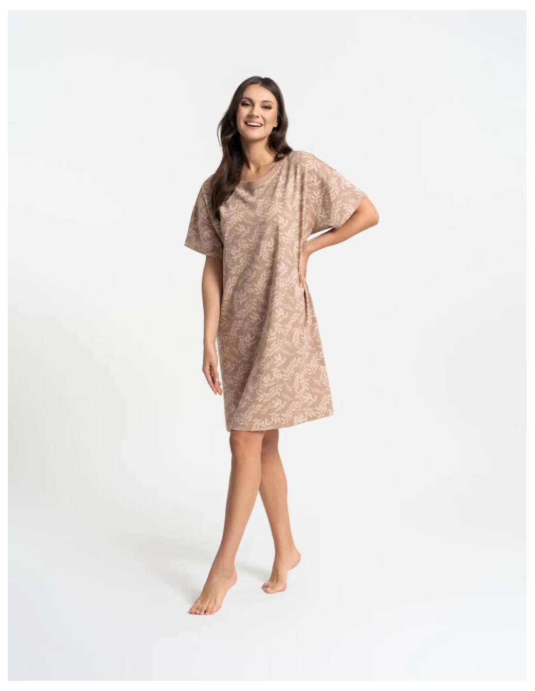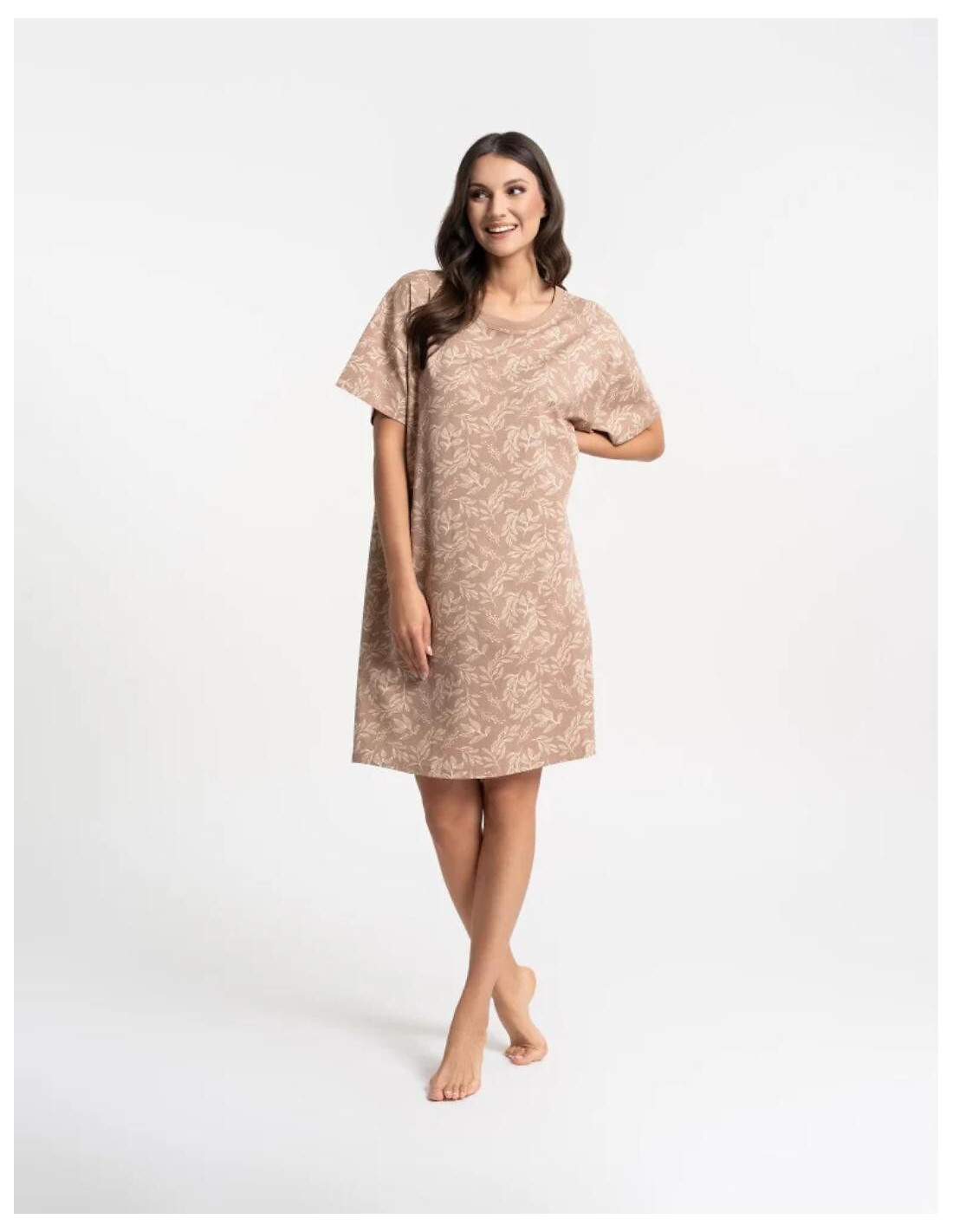 Koszula nocna damska - aukštos kokybės bawełna - roślinny print - okrągły dekolt - krótki rękaw - długość przed kolano - pakowana w foliowy worek