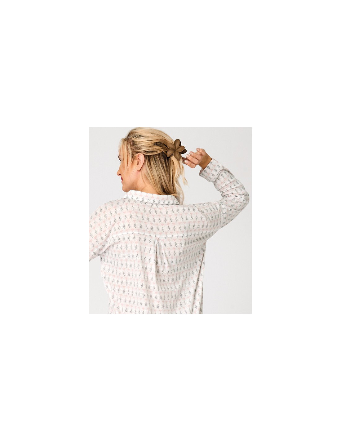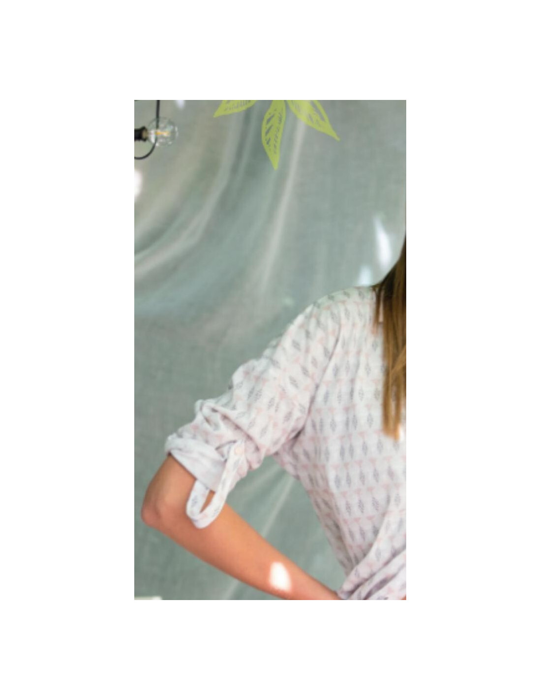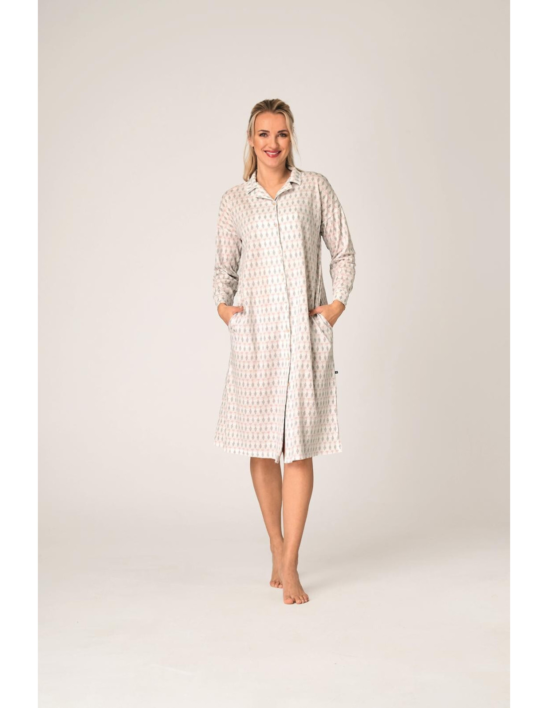 Bawełniana koszula damska - delikatny, pastelowy wzór - z kołnierzykiem, zapinana na guziki - długi rękaw, od wewnętrznej strony funkcjonalna tasiemka z guziczkiem dająca możliwość podwinięcia rękawów - na biodrach wygodne kieszenie - długość za kolano - u dołu rozporki - pakowana w foliowy worek