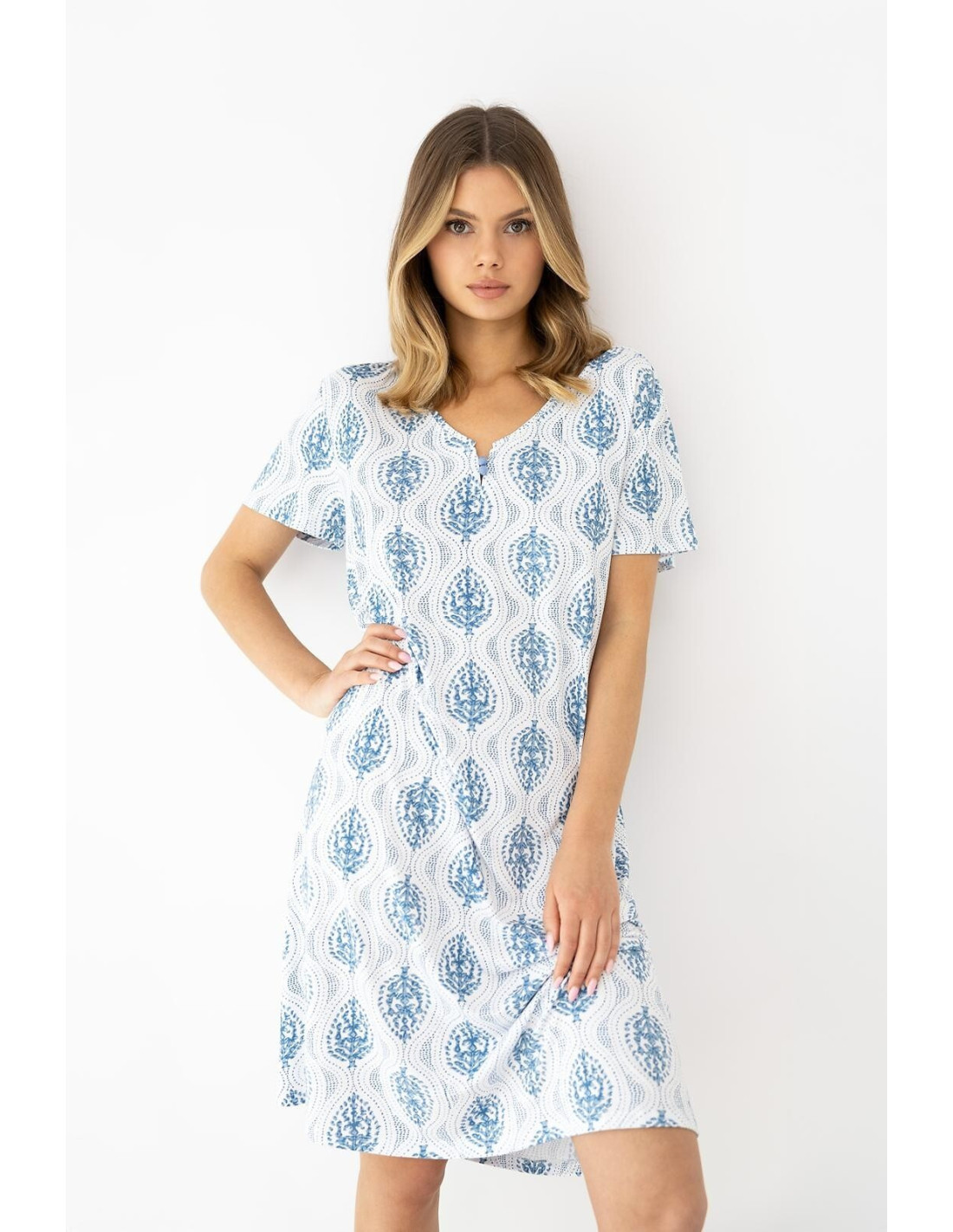 Koszula damska - minkka, wzorzysta wiskoza - krótki rękaw - dekolt tipo "V" z dwoma guzikami - długość przed kolano