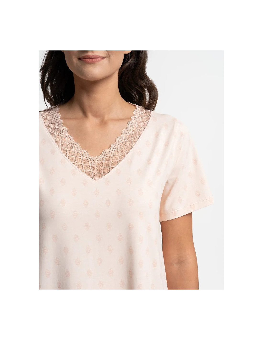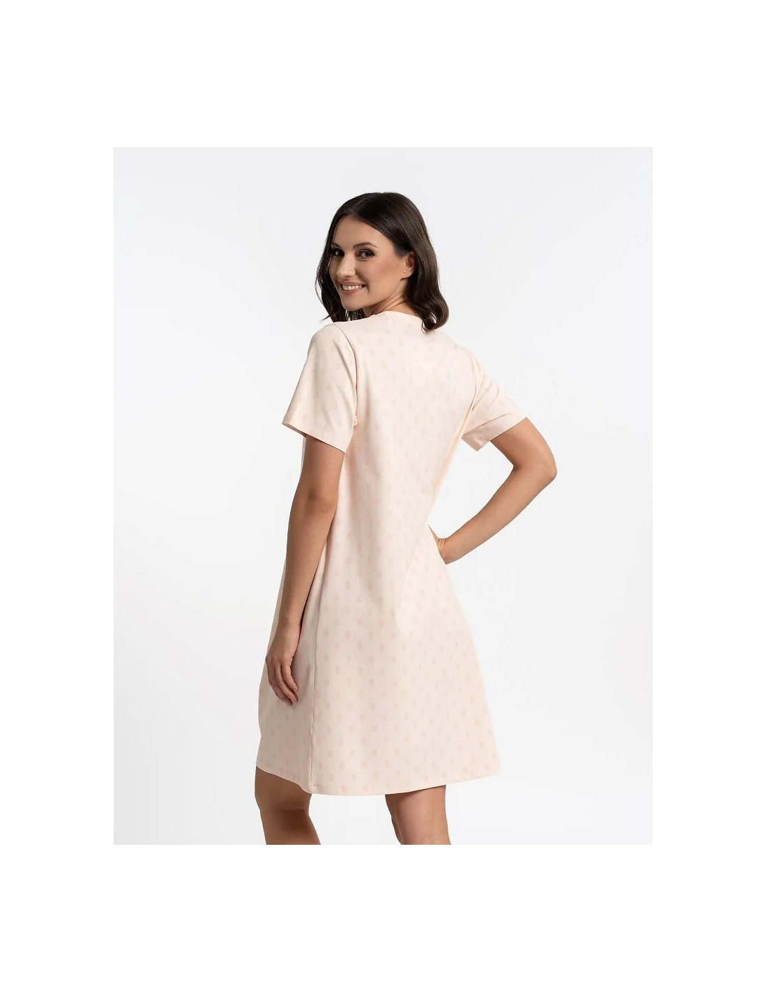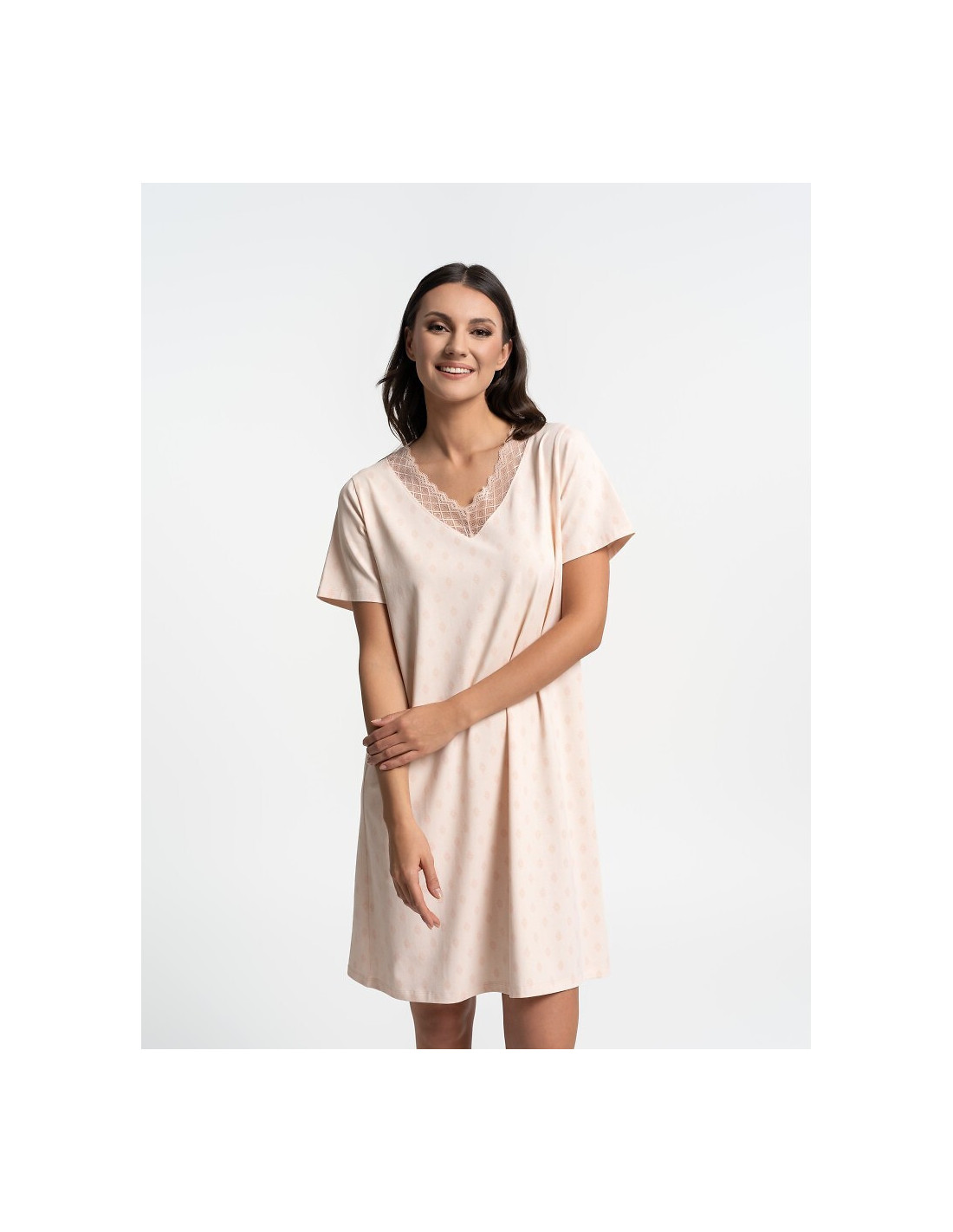 Koszula nocna damska - wysokiej jakości, miękka bawełna - orientalny print - dekolt "V", obszyty koronkową tasiemką - krótki rękaw - luźny, swobodny fason - długość przed kolano - pakowana w foliowy worek