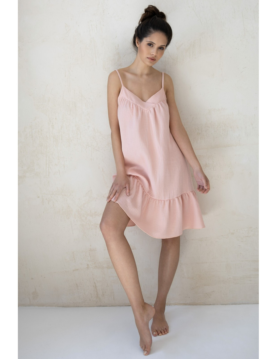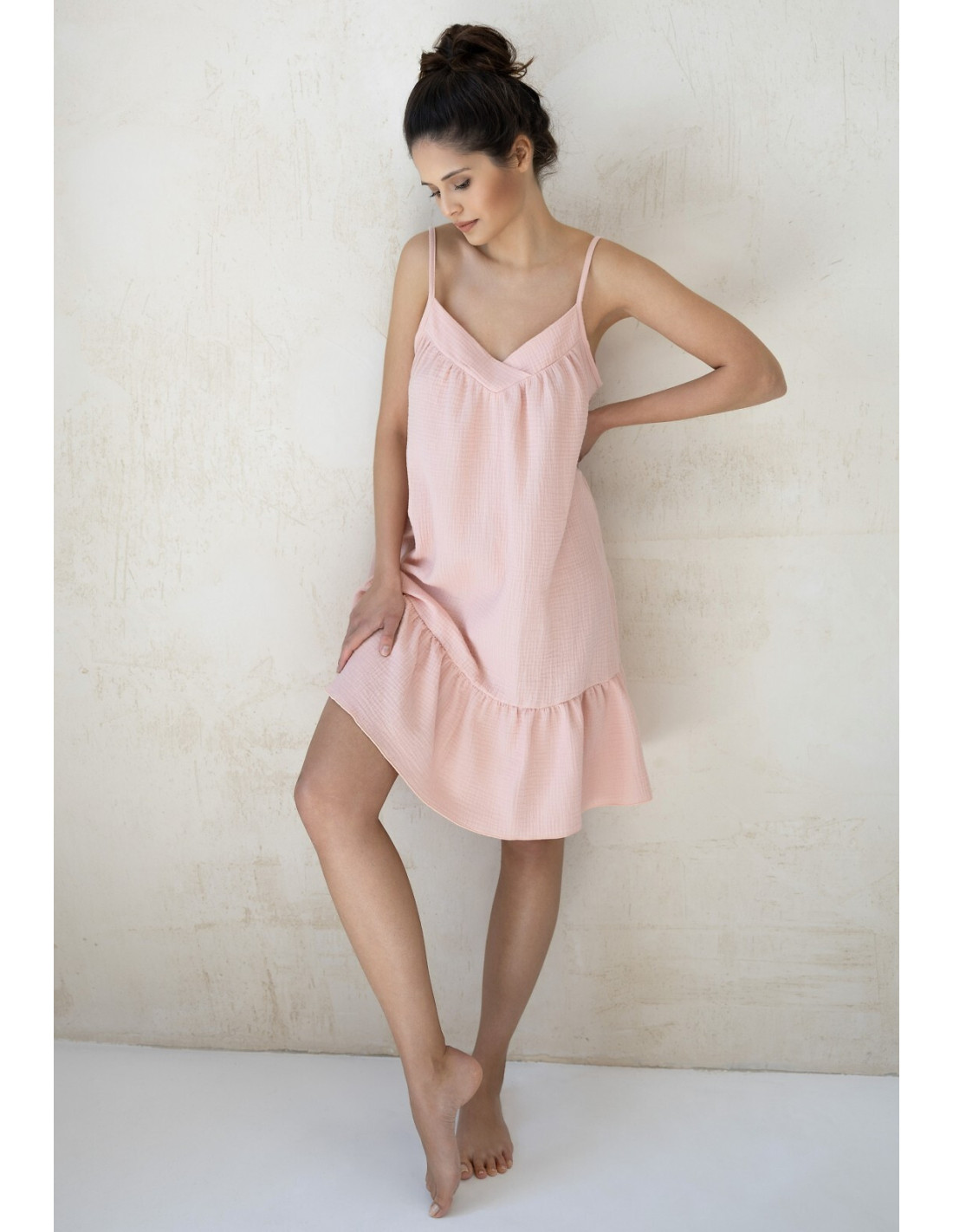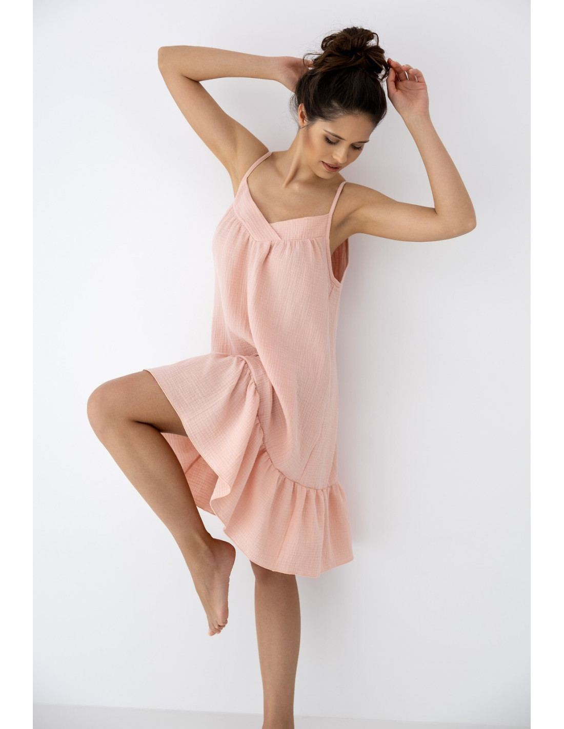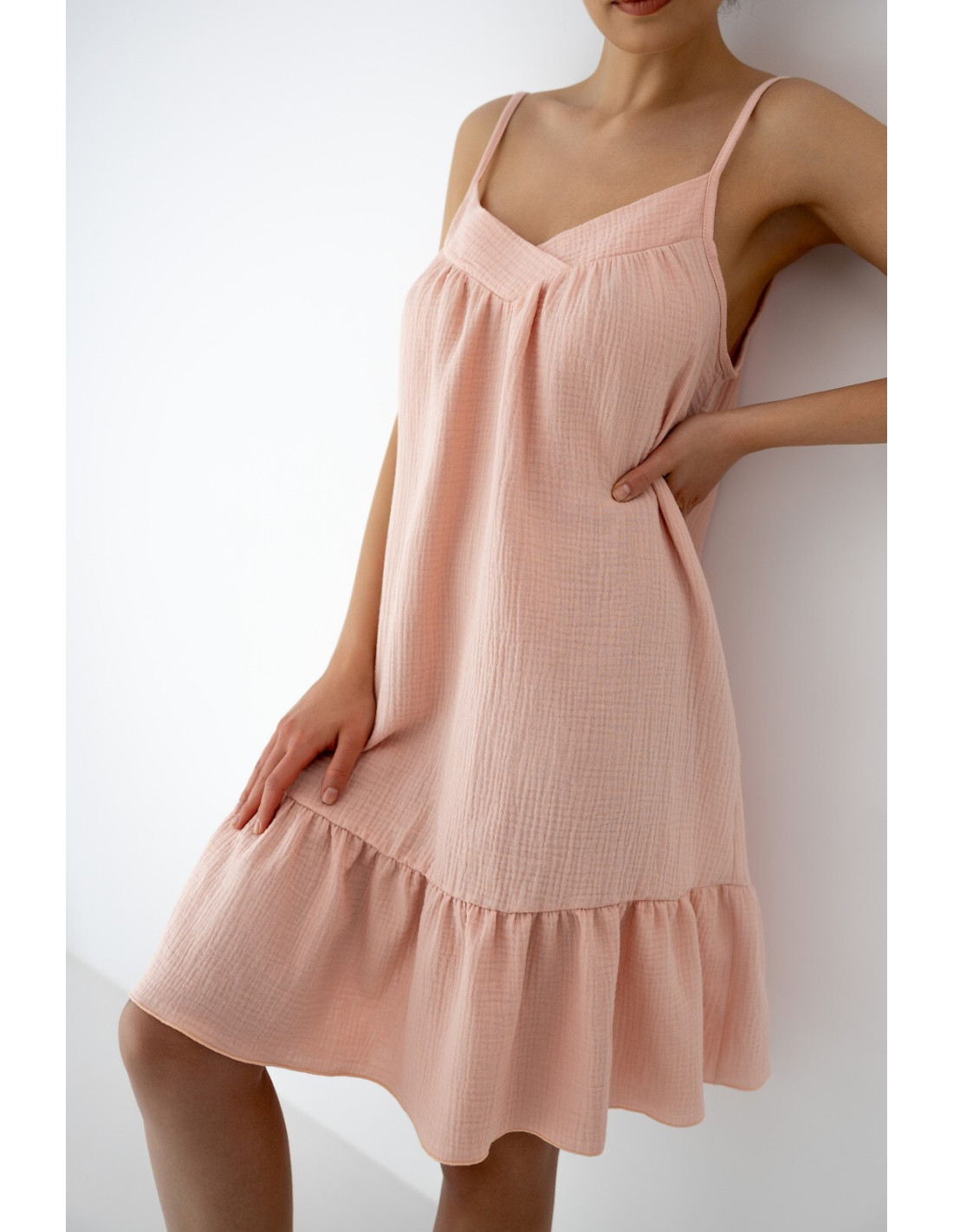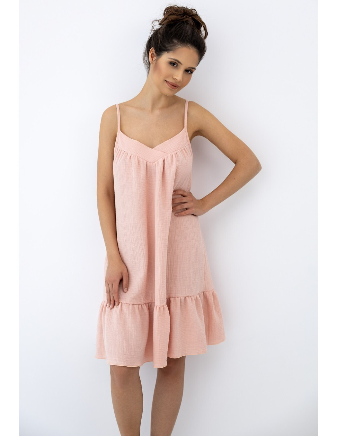 Letnia koszula damska - miękka, muślinowa dzianina - dekolt tipo "V" - cienkie, regulowane ramiączka
