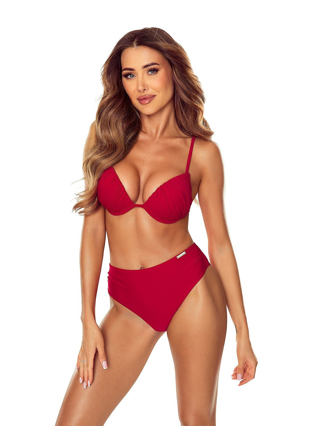 Kostium kąpielowy dwuczęściowy - miseczki z fiszbinami efektownie marszczony materiał - delikatny push-up termicznie formowany - zbierają biust do środka - cienkie ramiączka z regulacją - tył zapinany - do kompletu figi z delikatnym marszczeniem na bokach - od wewnątrz podszyte papildomai materialem