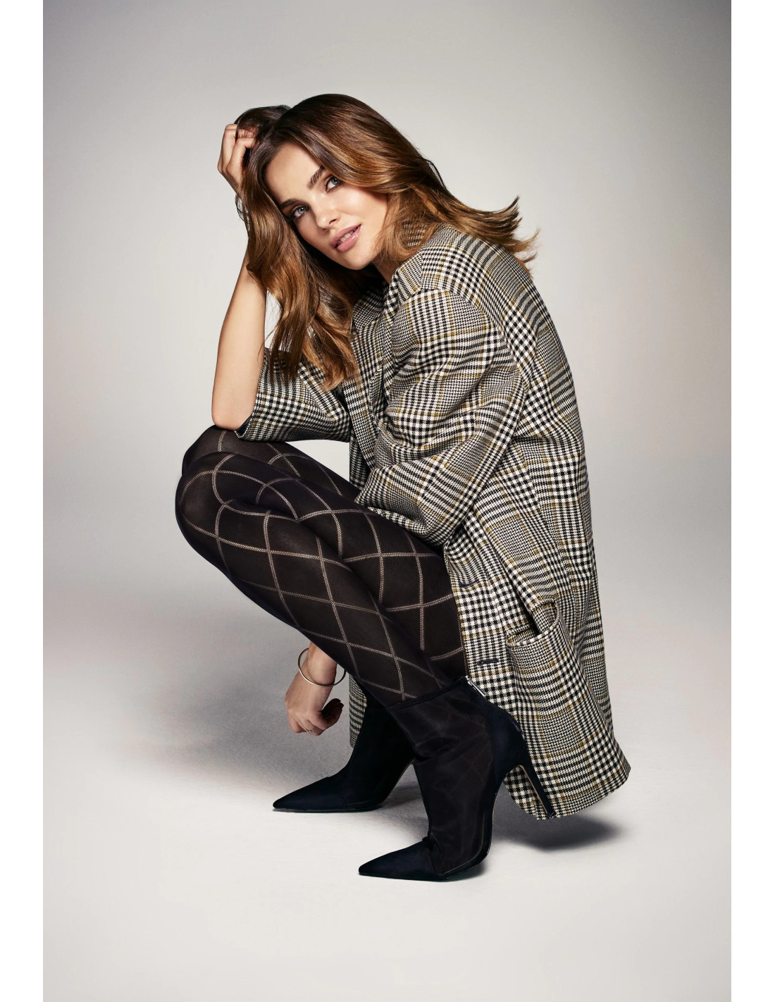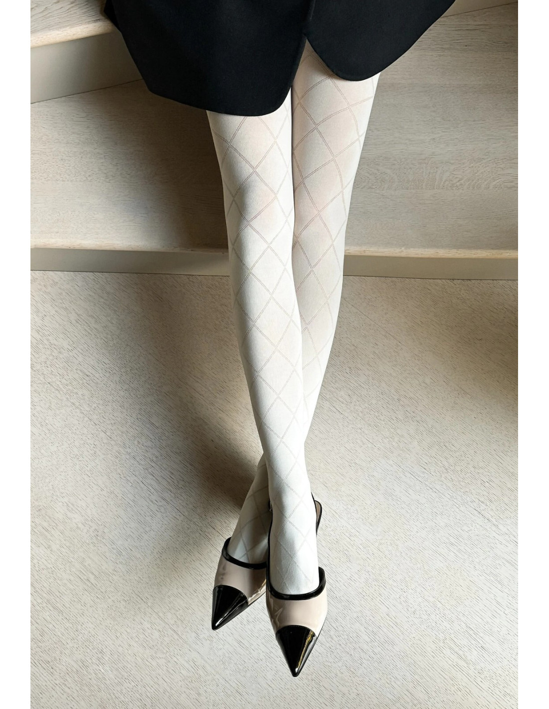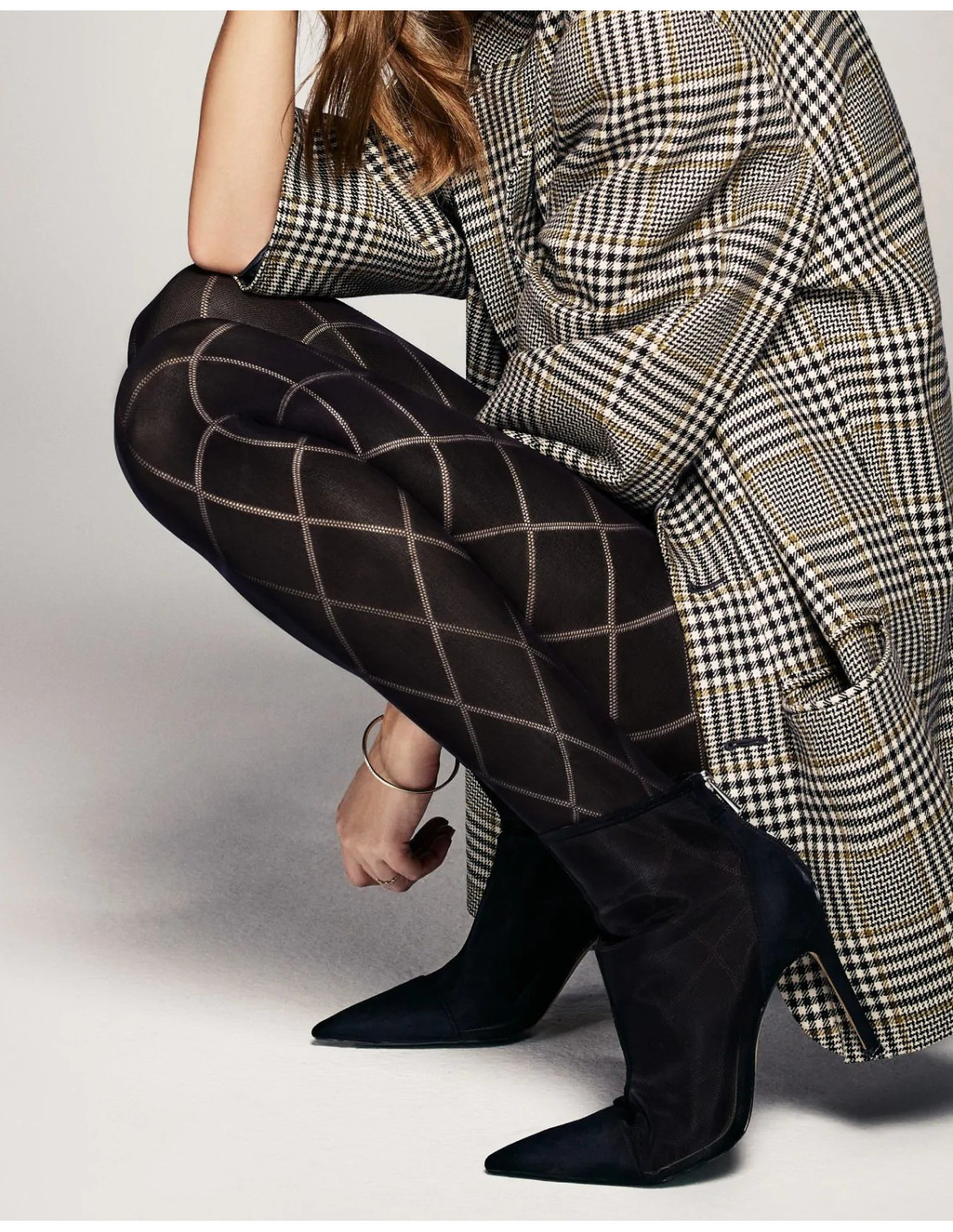 Moteriškos pėdkelnės 60 den- minkštas, elastingas mikropluoštas- geometrinis didelių rombų raštas- mažas medvilninis tarpelis- patogus nespaudžiantis diržas Sudėtis: sudėtis: 85 % poliamidas, 12 % elastanas, 3 % medvilnė