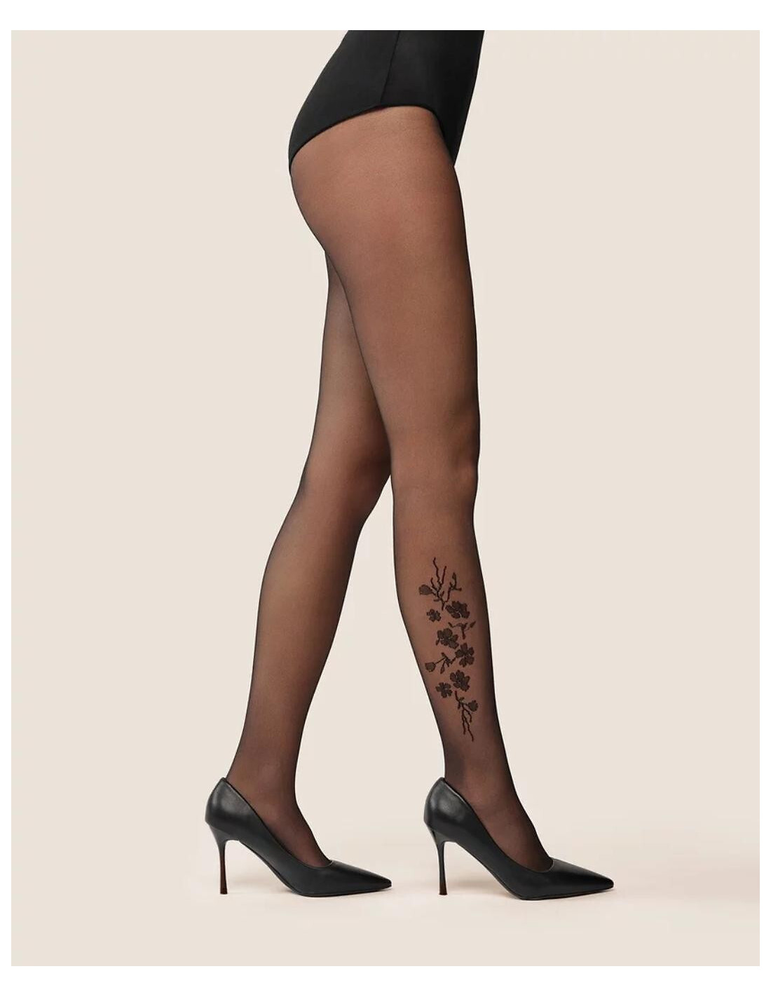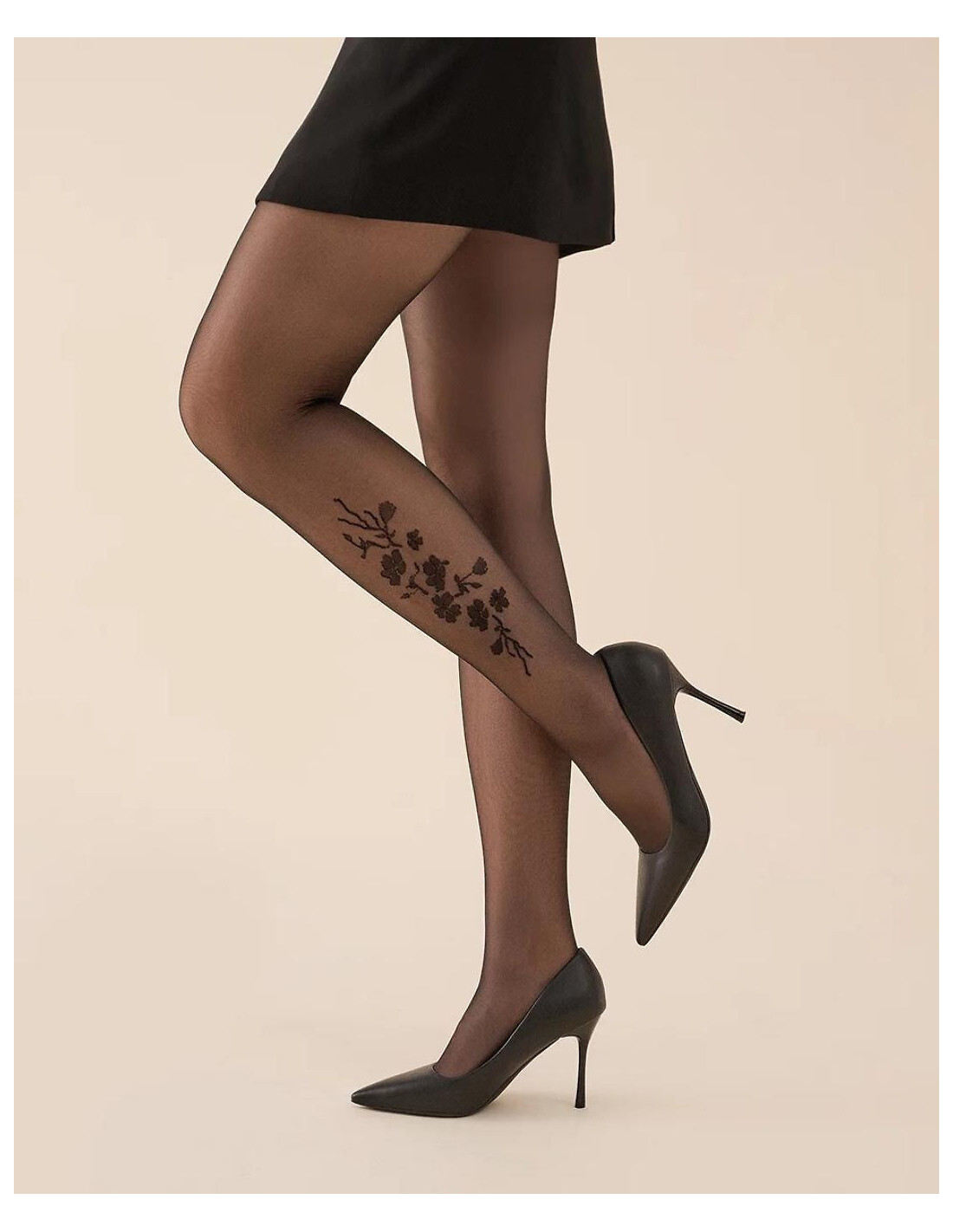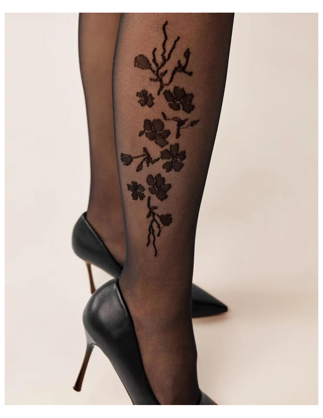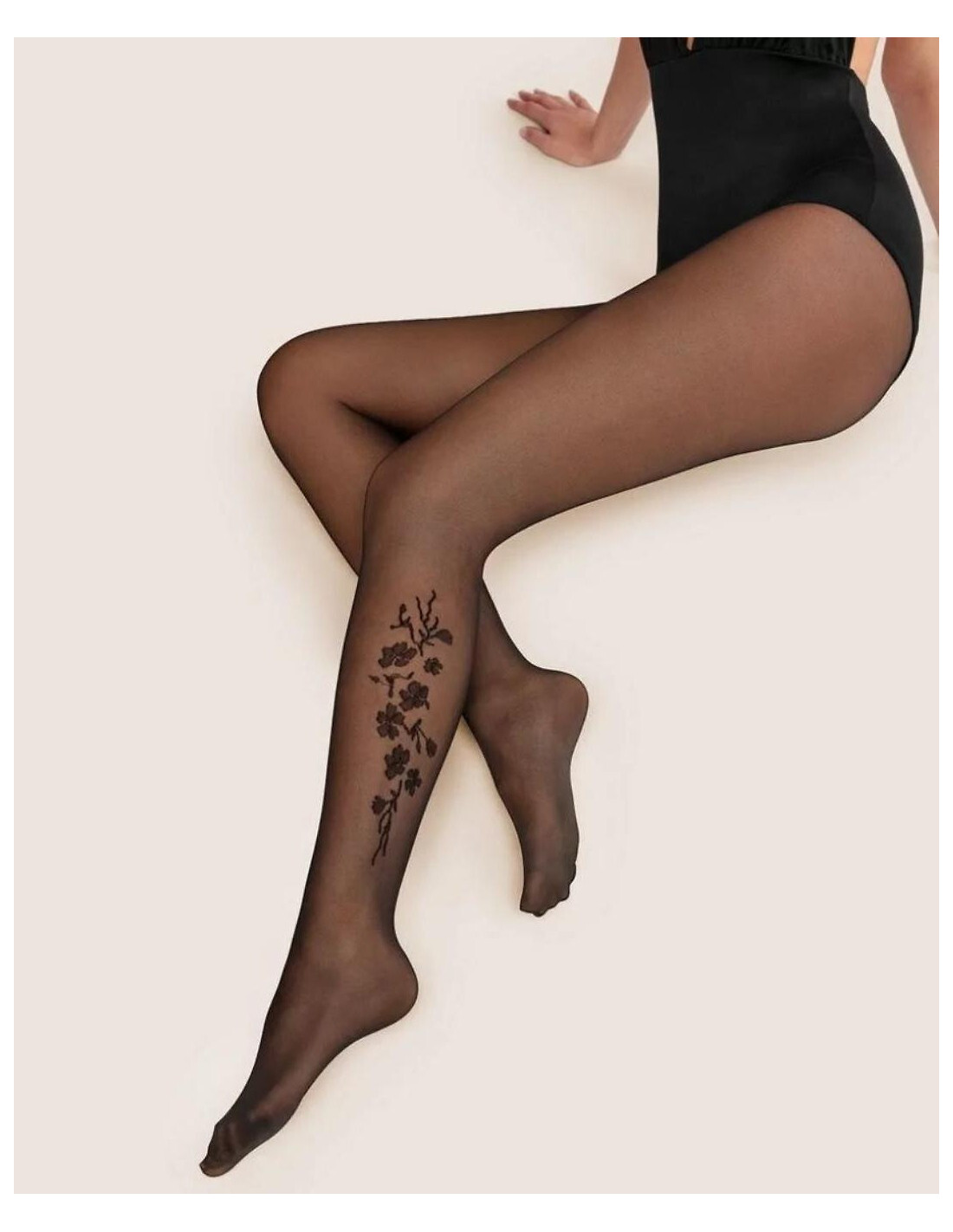 Rajstopy damskie - elastyczne włókno podwójnie oplecione jedwabiem poliamidowym - grubość 20 den - na łydce efektowny, kwiatowy print - niewidoczne wzmocnienie na palcach - bez wydzielonej części majteczkowej - płaskie szwy, bawełniany mały klin