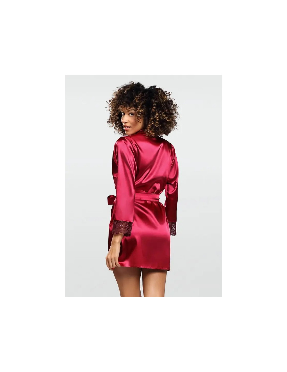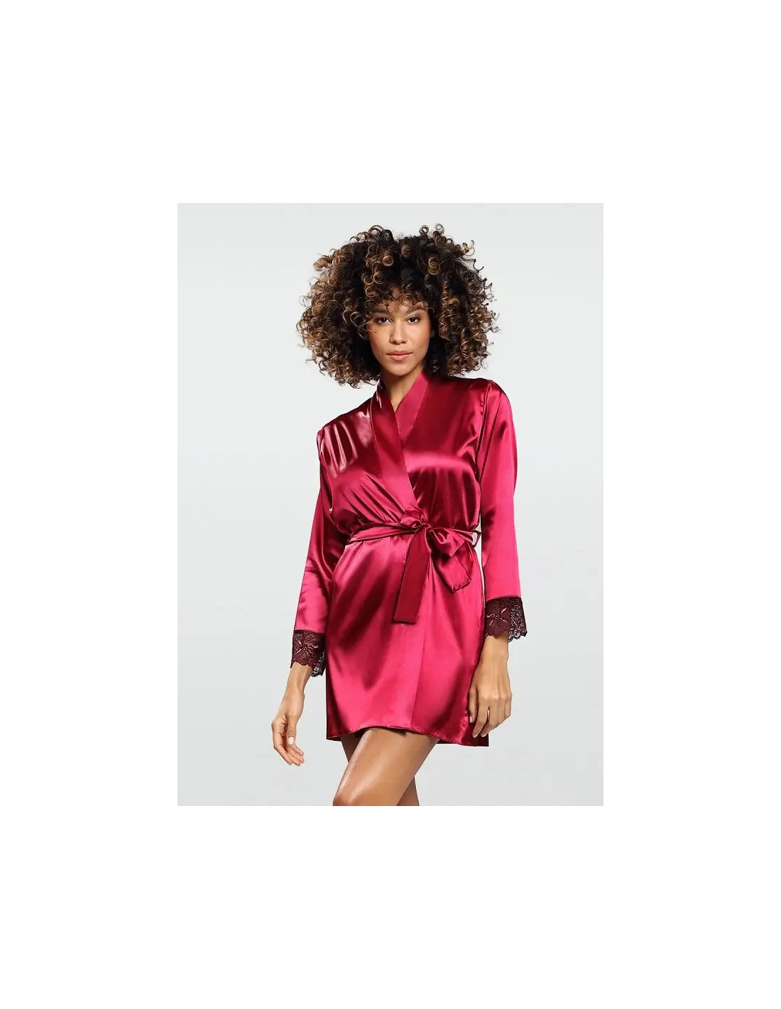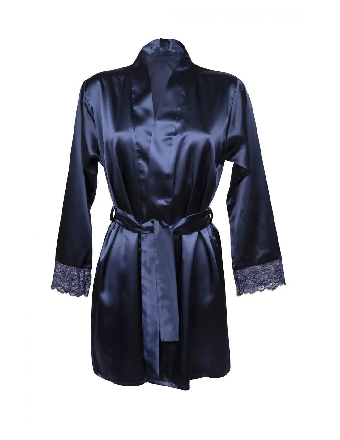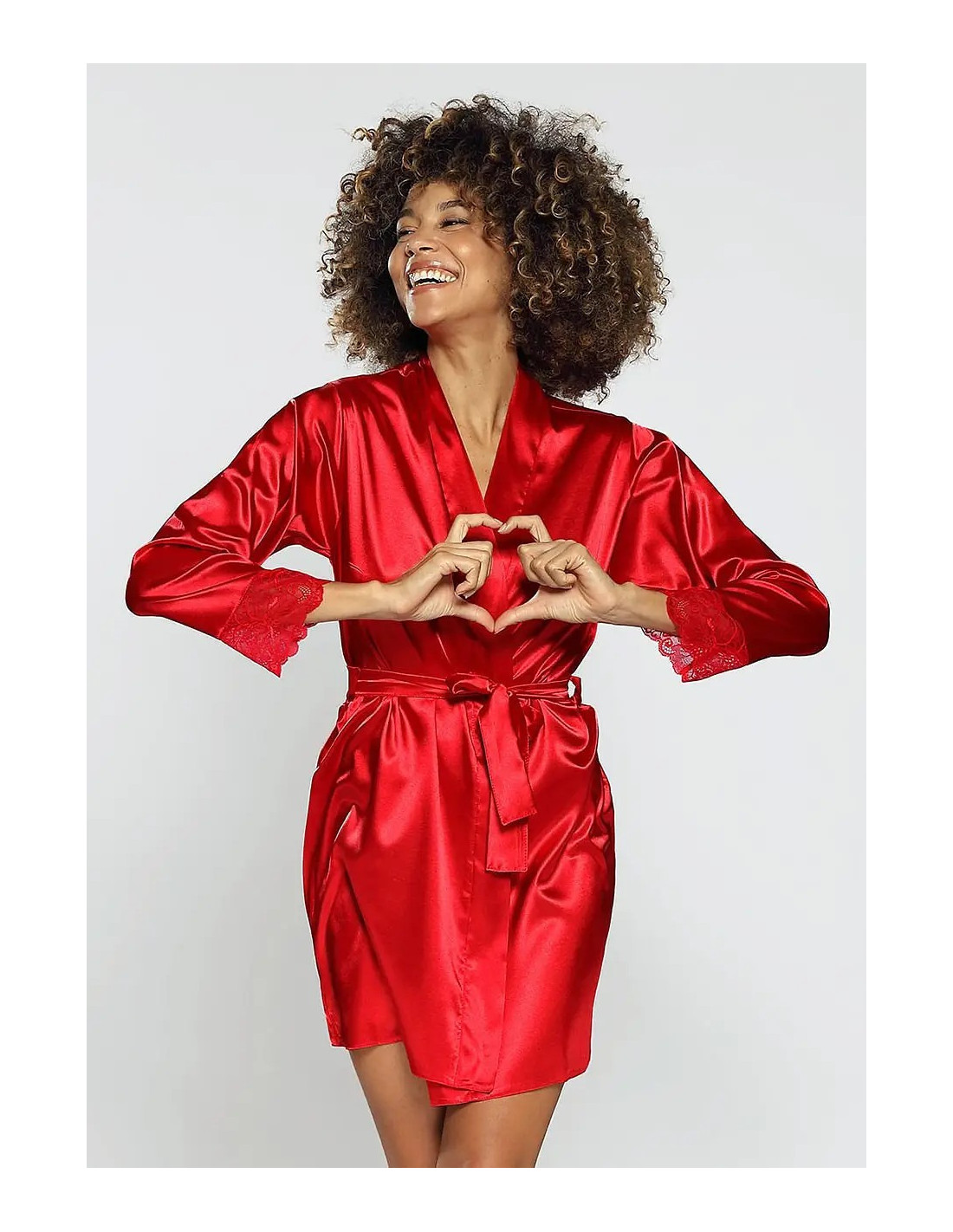 Moteriškas plazdantis atlasinis apatinis trikotažas ir (arba) chalatas - rankogaliai užbaigti įspūdingais nėriniais - surišami per liemenį