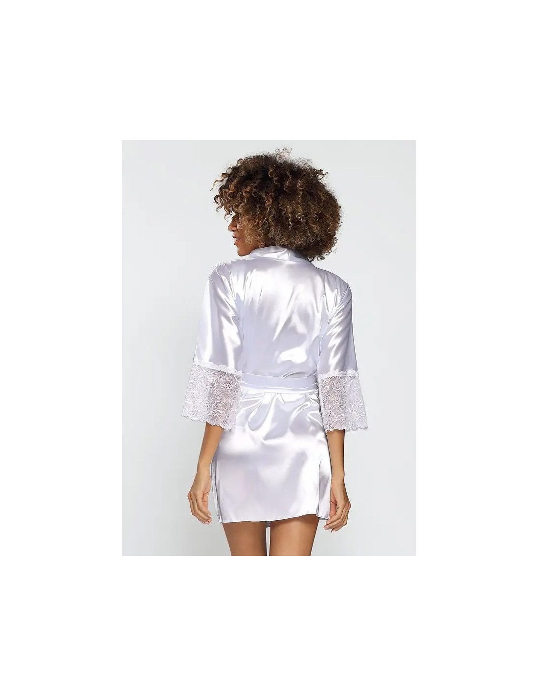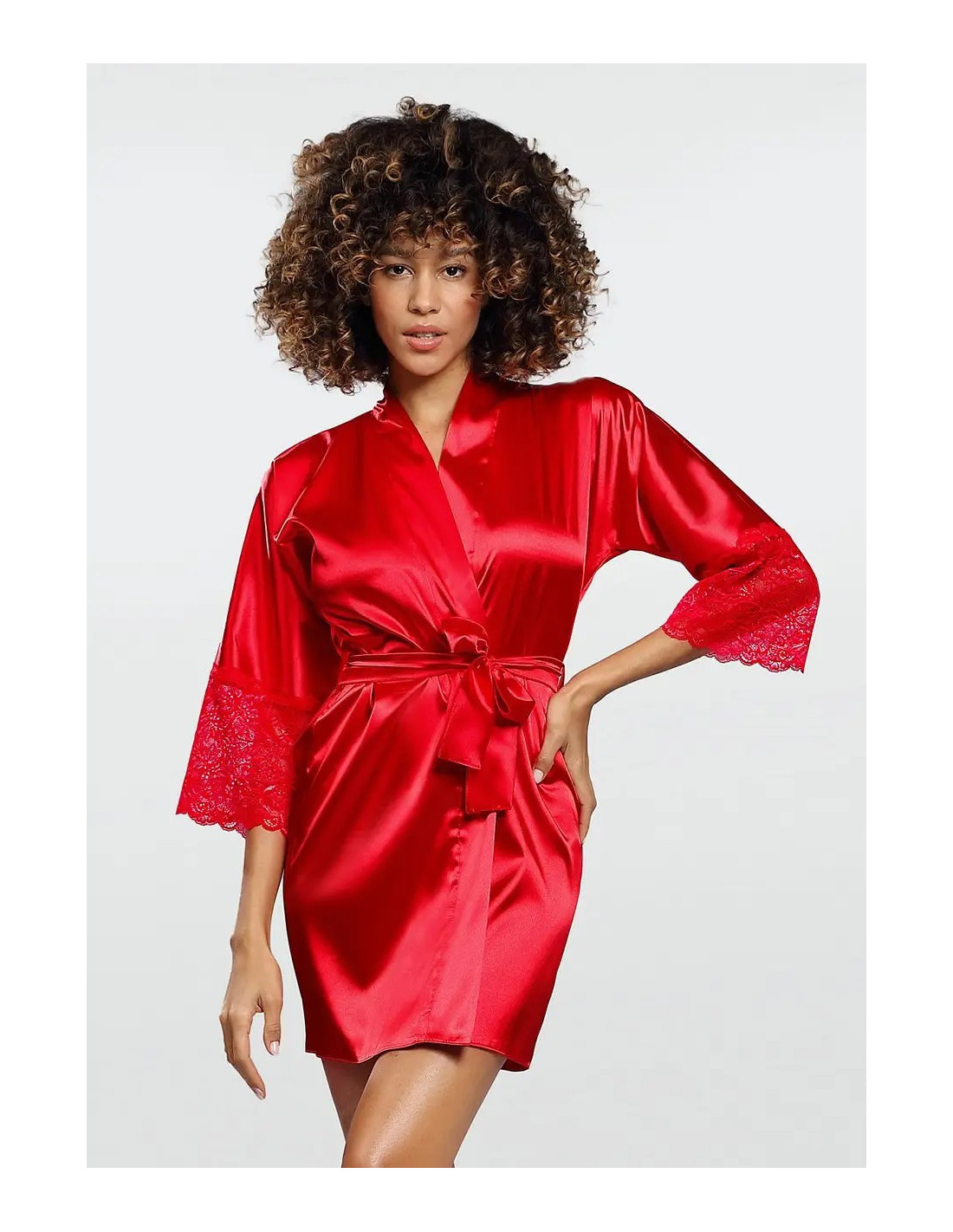 Moteriškas plazdantis atlasinis apatinis trikotažas ir (arba) chalatas - rankogaliai užbaigti įspūdingais nėriniais - surišami per liemenį