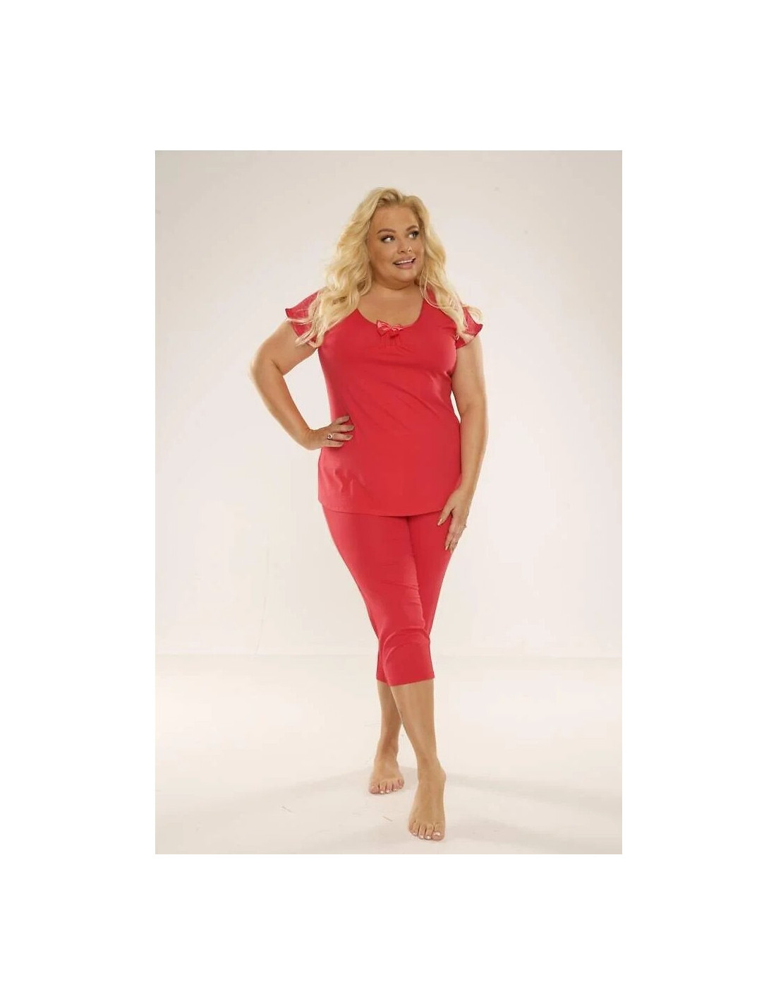 Moteriškos pižamos - pagaminta iš aukštos kokybės viskozės - kelnaitės trumpomis rankovėmis - pusapvalė iškirptė, apsiūta atlaso apvadais, papuošta lankeliu ir subtilia klostele - vienspalvės tinklinės kelnės su plačiomis klešnėmis