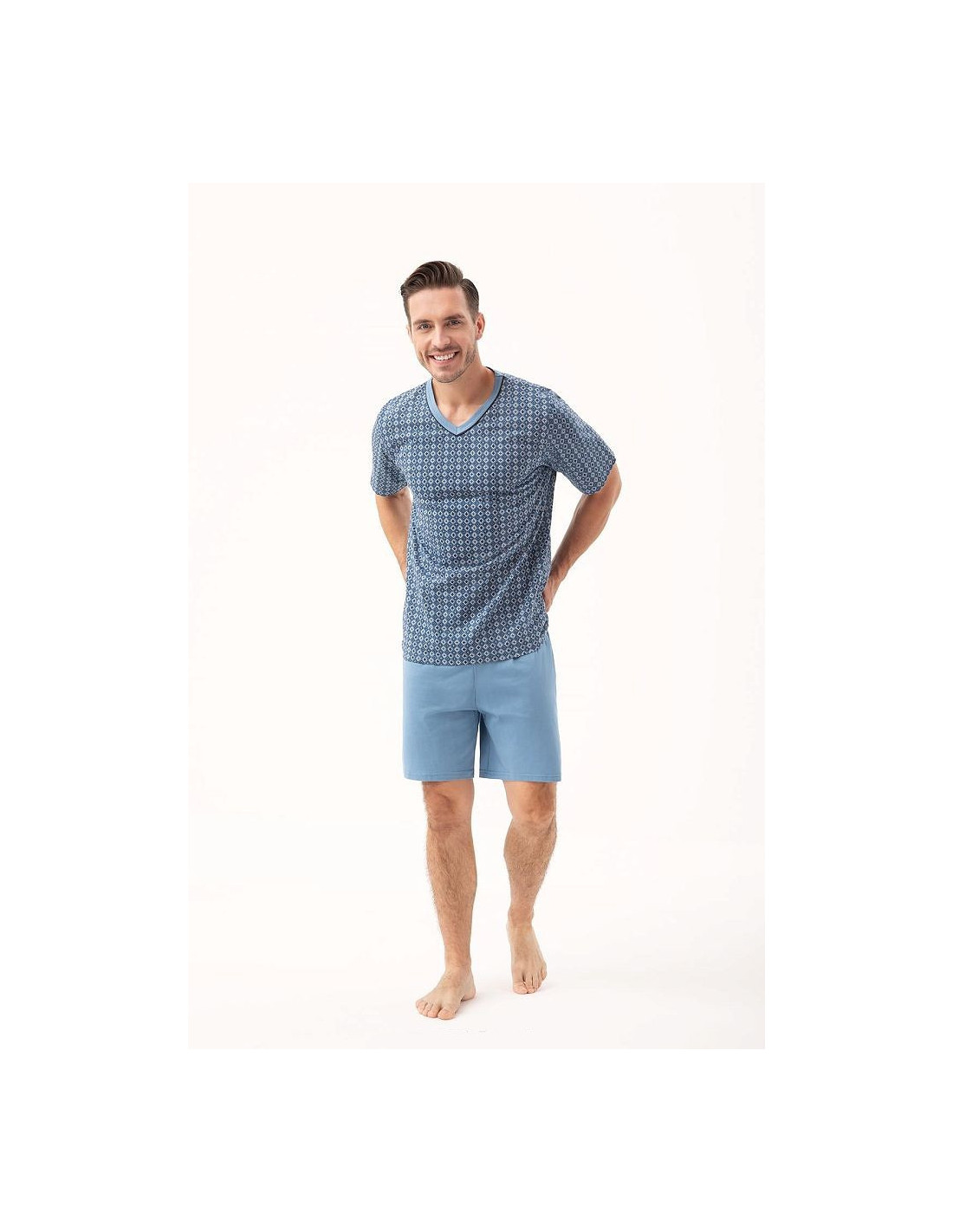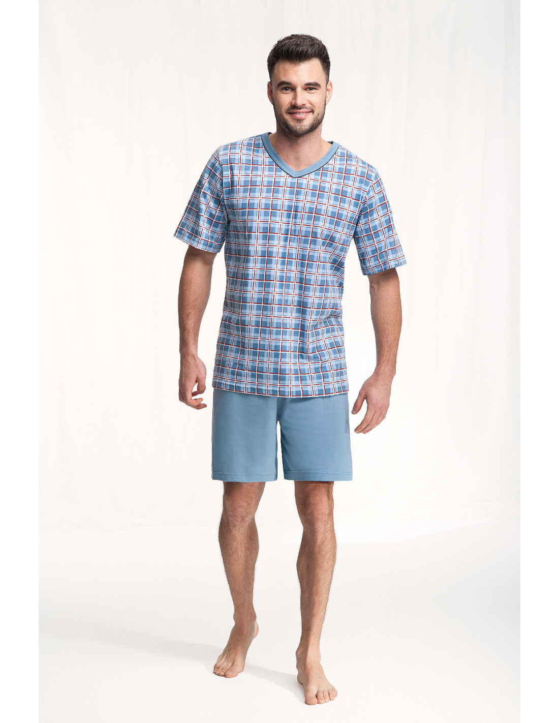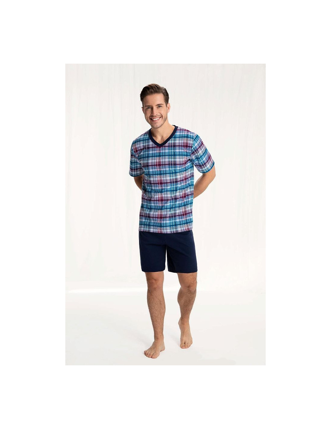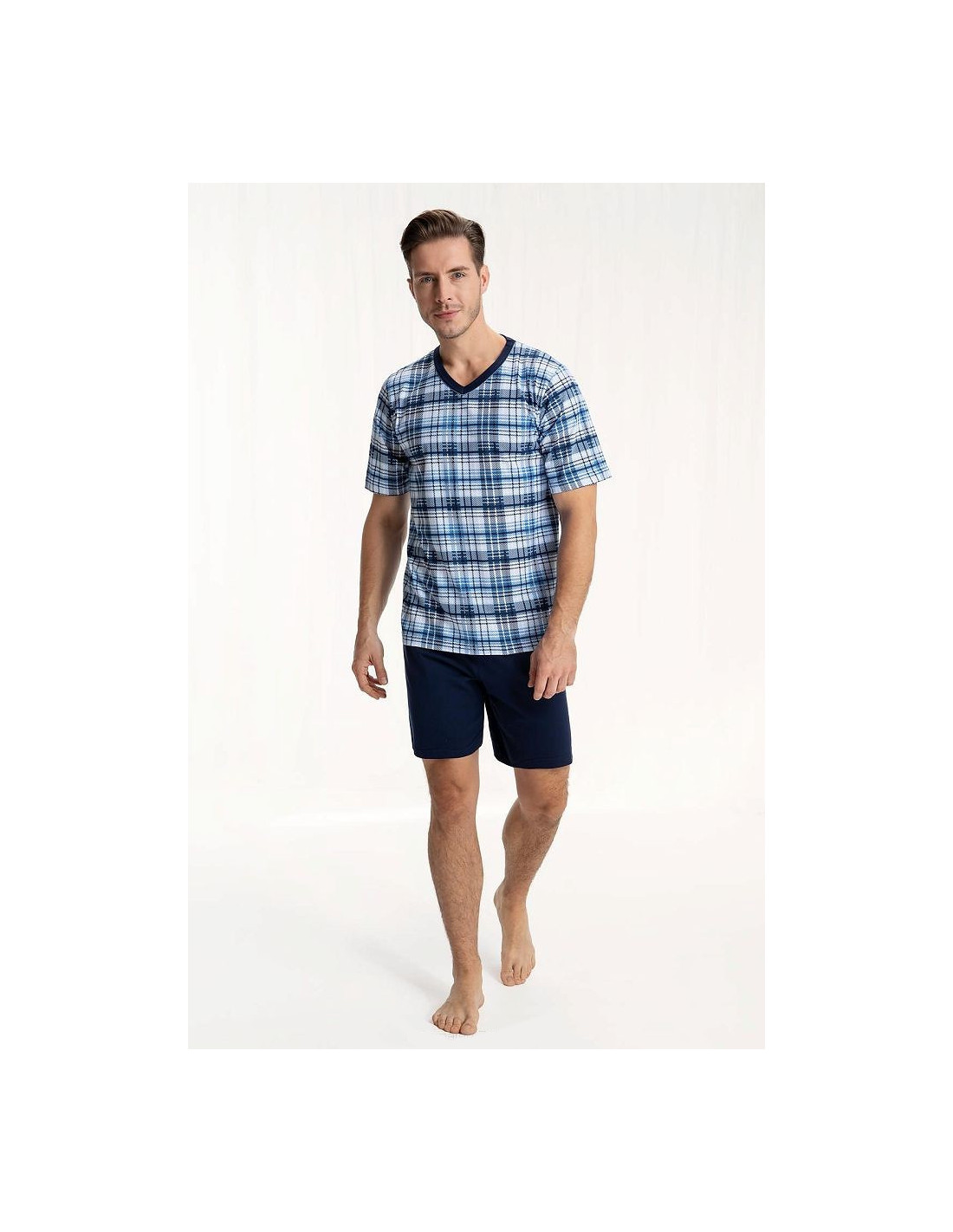 Vyriškos pižamos - pagaminta iš aukštos kokybės 100 % medvilnės - raštuoti marškinėliai trumpomis rankovėmis - smailėjanti iškirptė - laisvi, vienspalviai šortai komplektui užbaigti - nurodytos spalvos ir raštai yra pavyzdiniai ir gali keistis