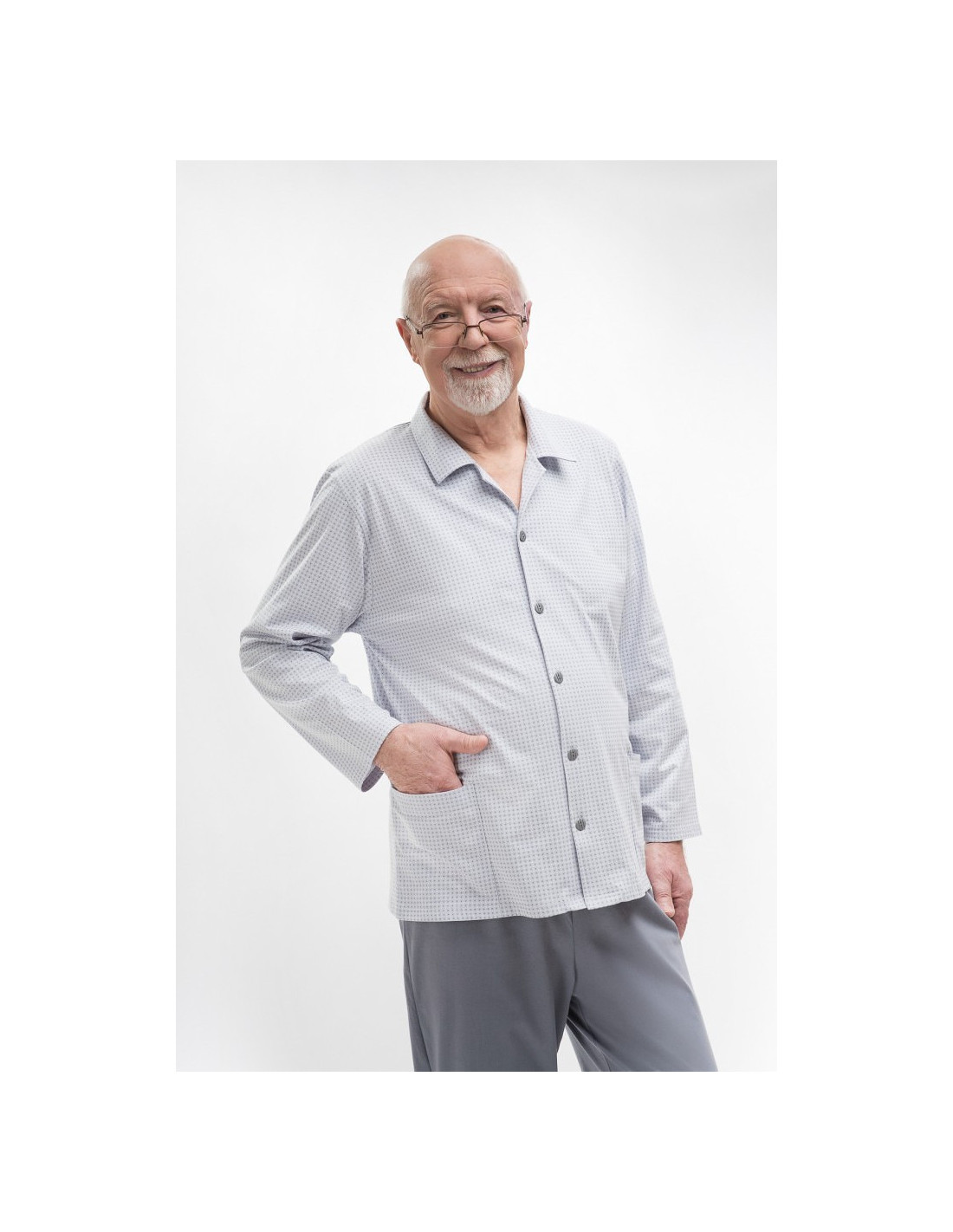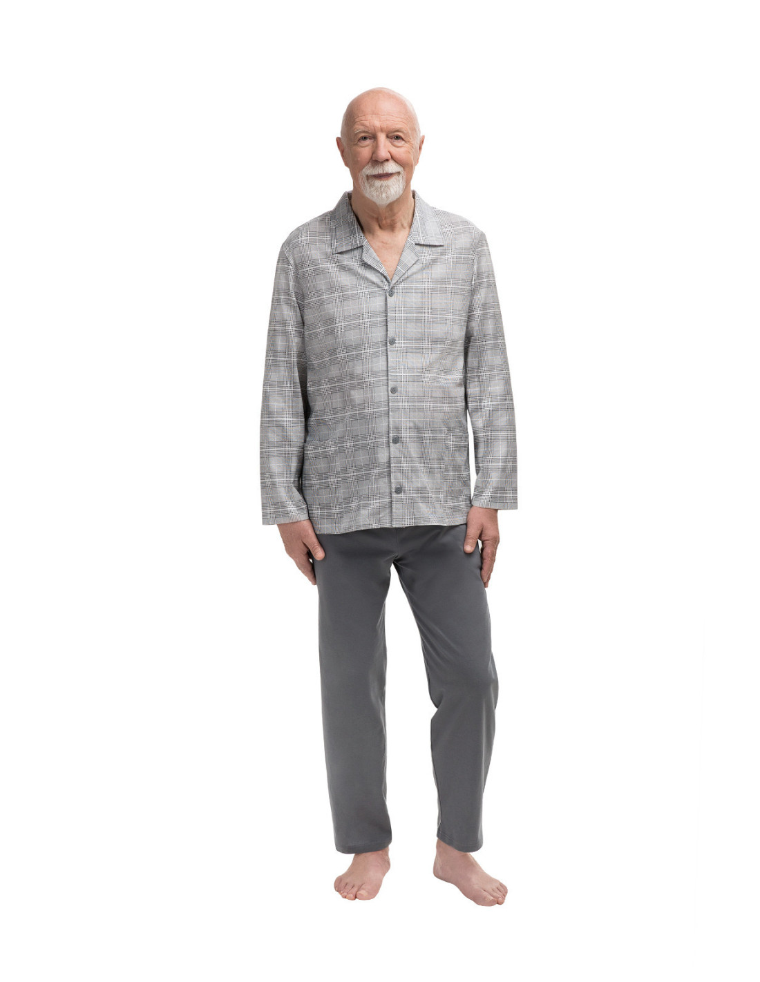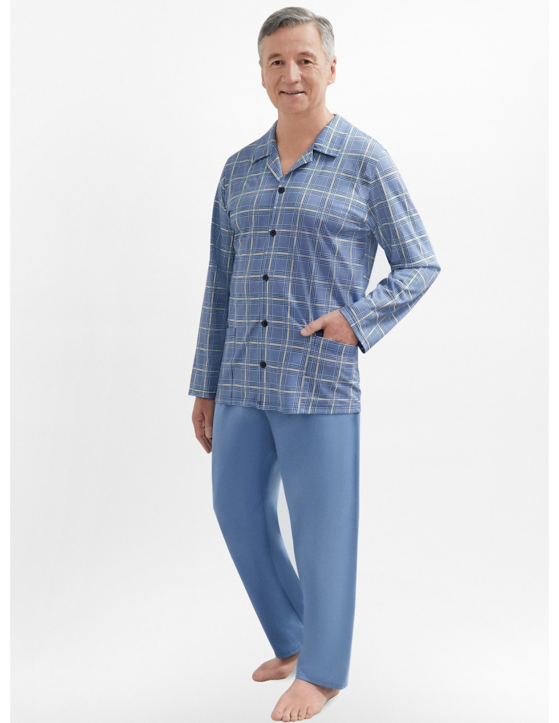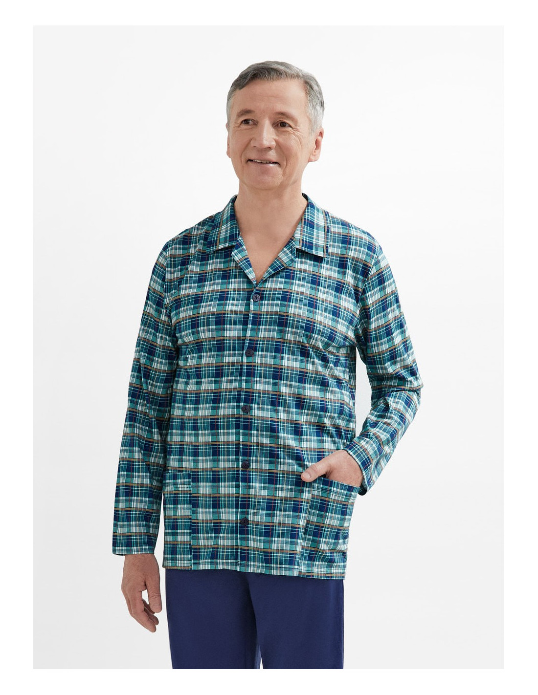 Vyriškos pižamos - aukštos kokybės medvilnė - raštuota palaidinė su sagomis - su apykakle - dvi išorinės kišenės apačioje - ilgos, vientisos, laisvai krentančios kelnės