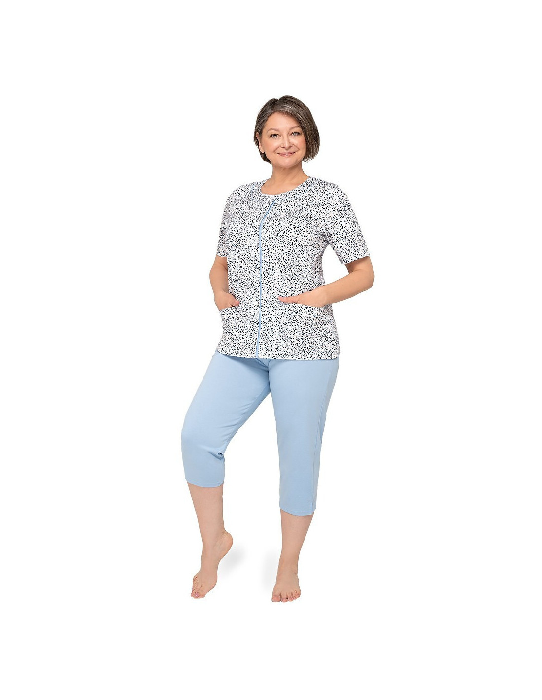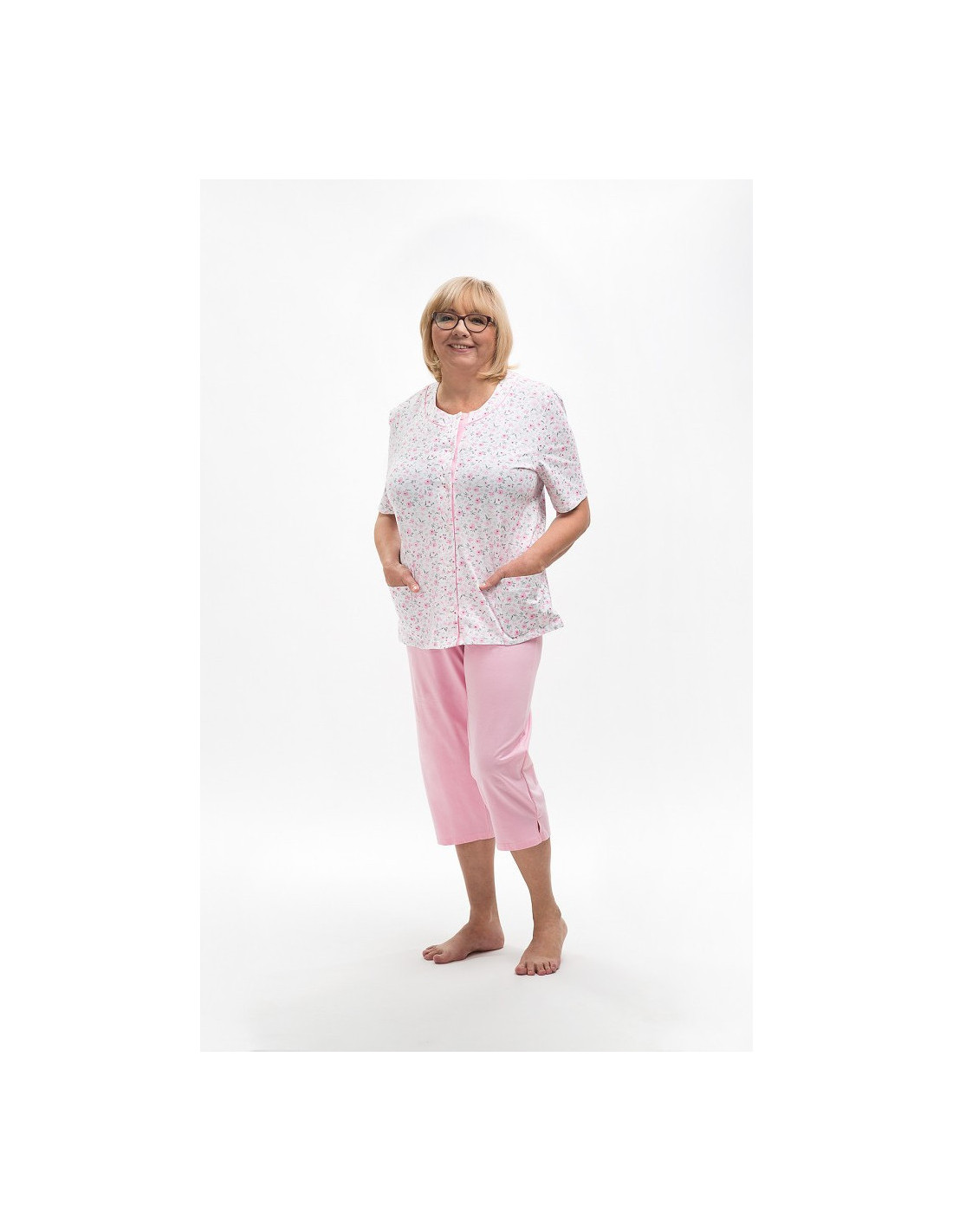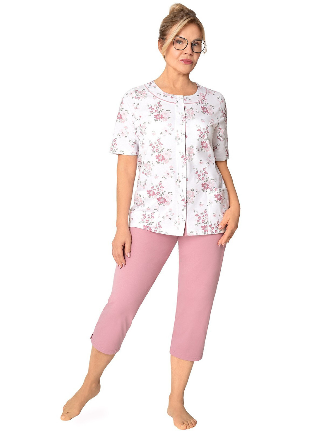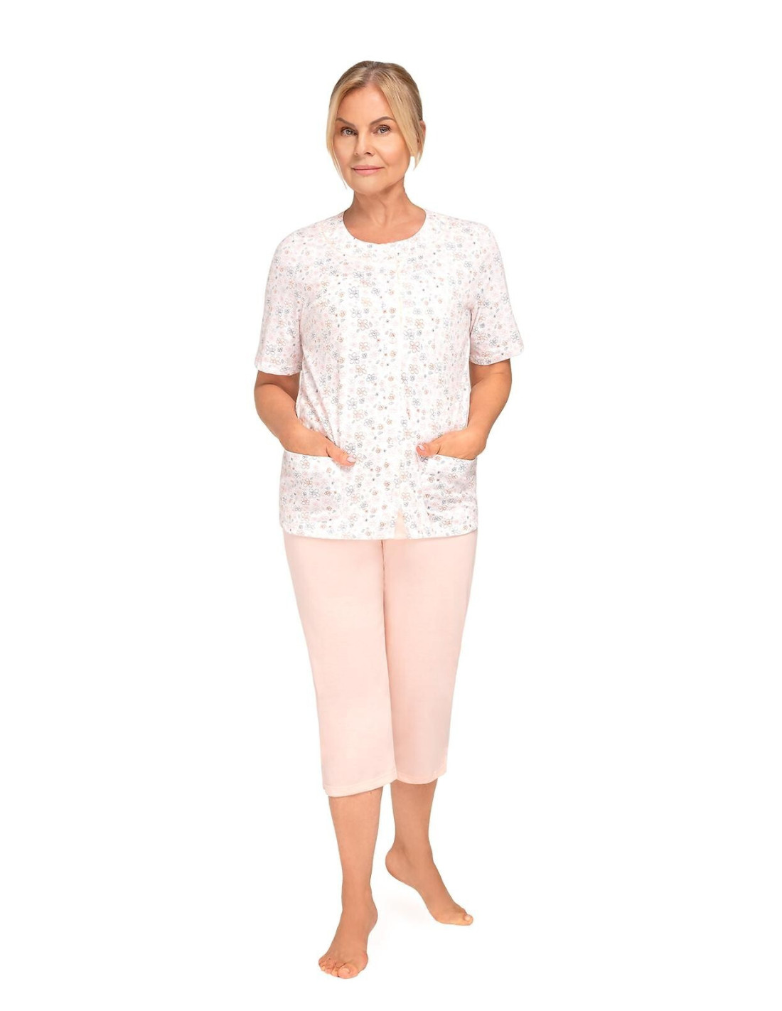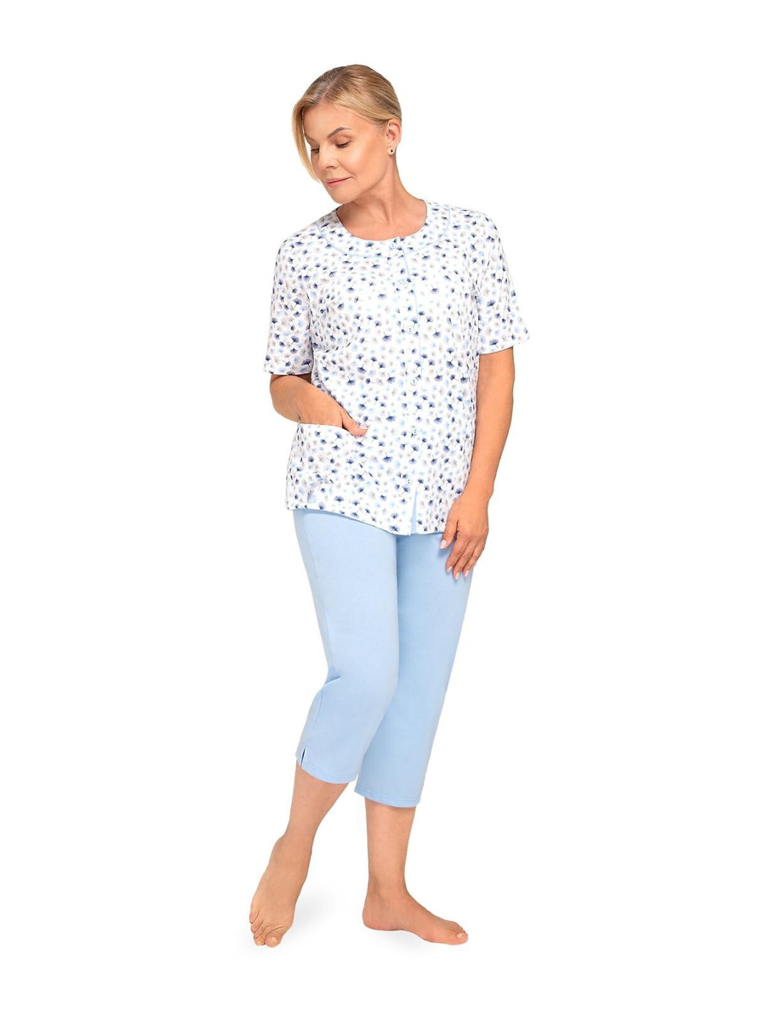 Moteriška pižama iš švelnios medvilnės - marškinėliai, puošti gėlių raštu - trumpomis rankovėmis - pusapvalė iškirptė - užsegama iškirpte - lygios 3/4 ilgio kelnės
