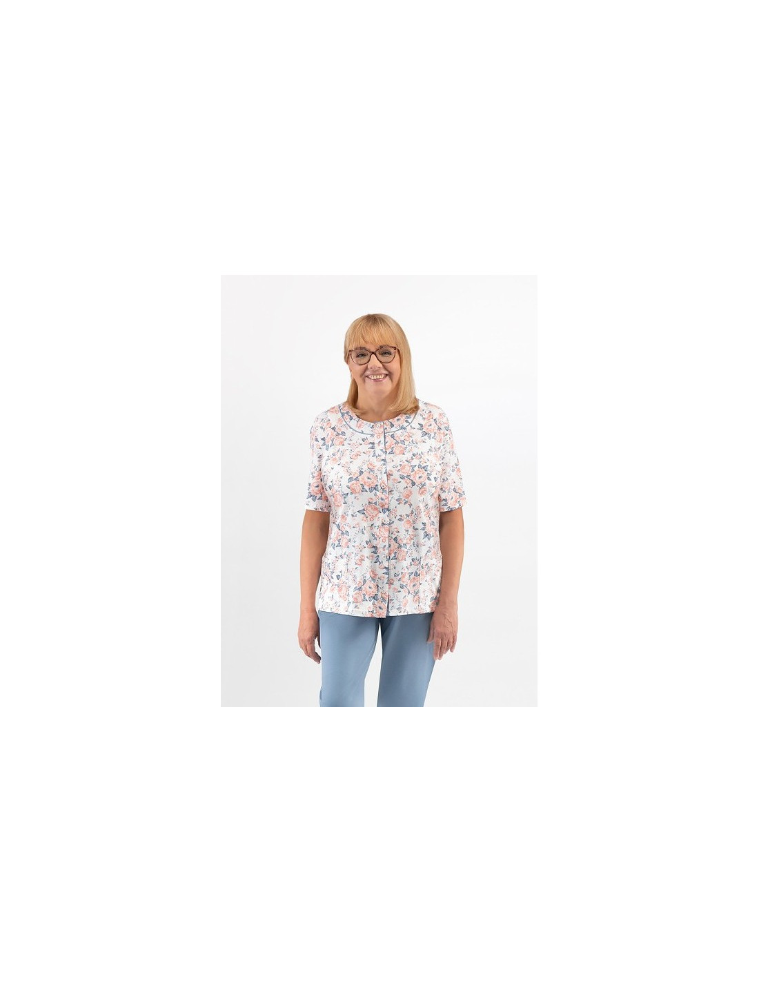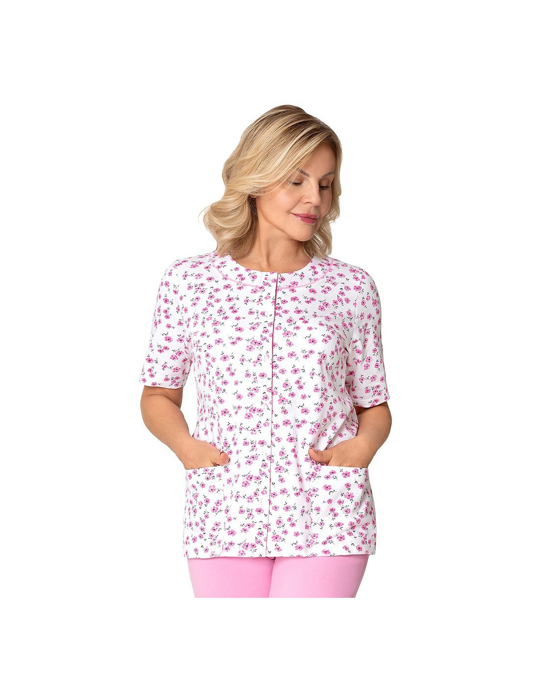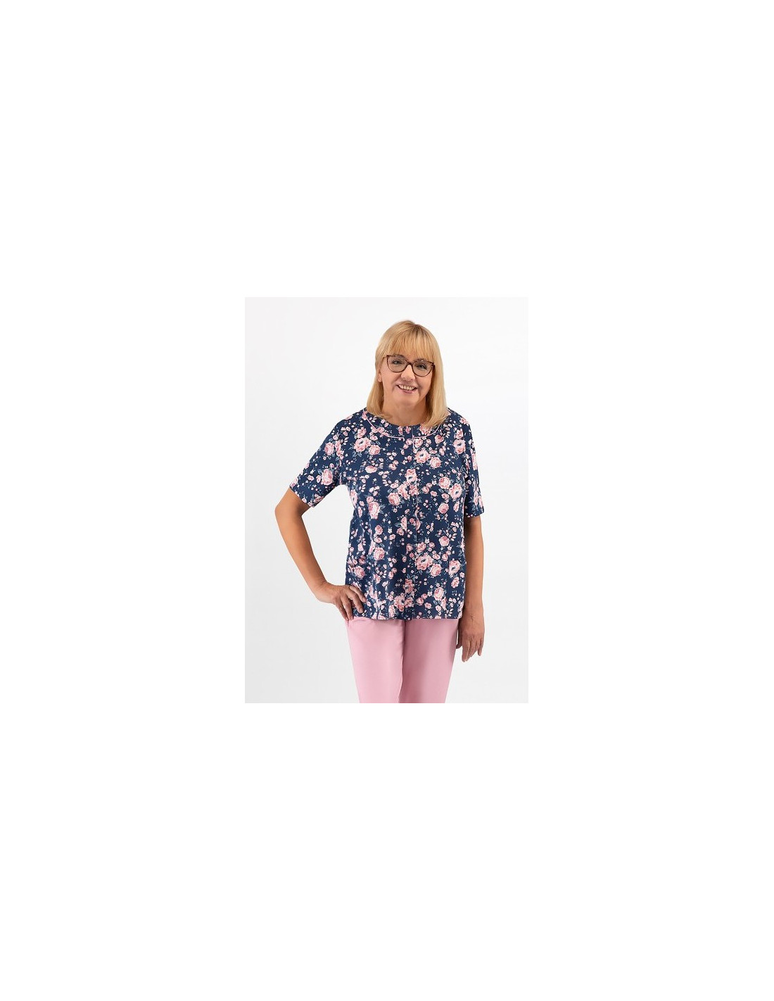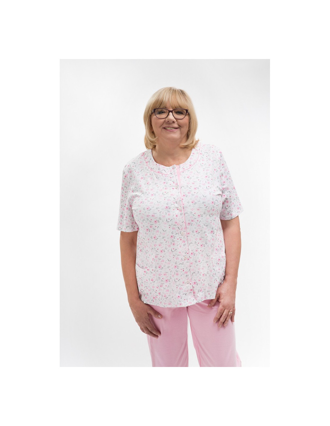 Moteriška pižama iš švelnios medvilnės - marškinėliai, puošti gėlių raštu - trumpomis rankovėmis - pusapvalė iškirptė - užsegama iškirpte - lygios 3/4 ilgio kelnės