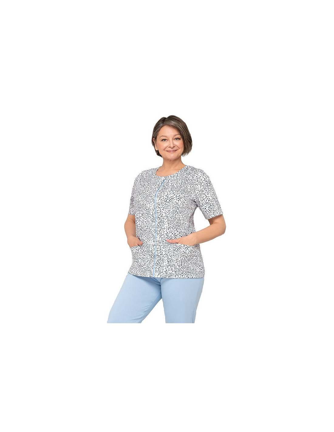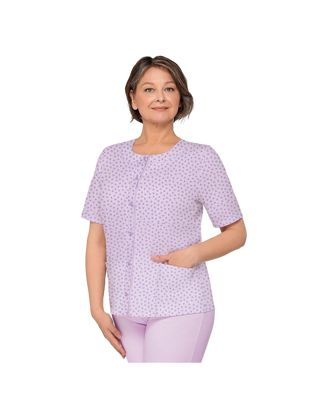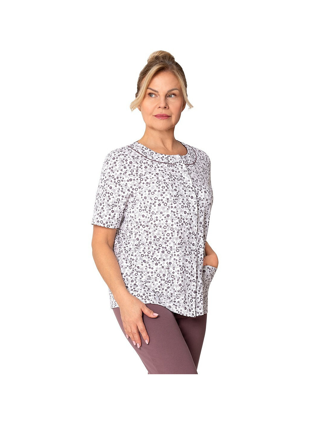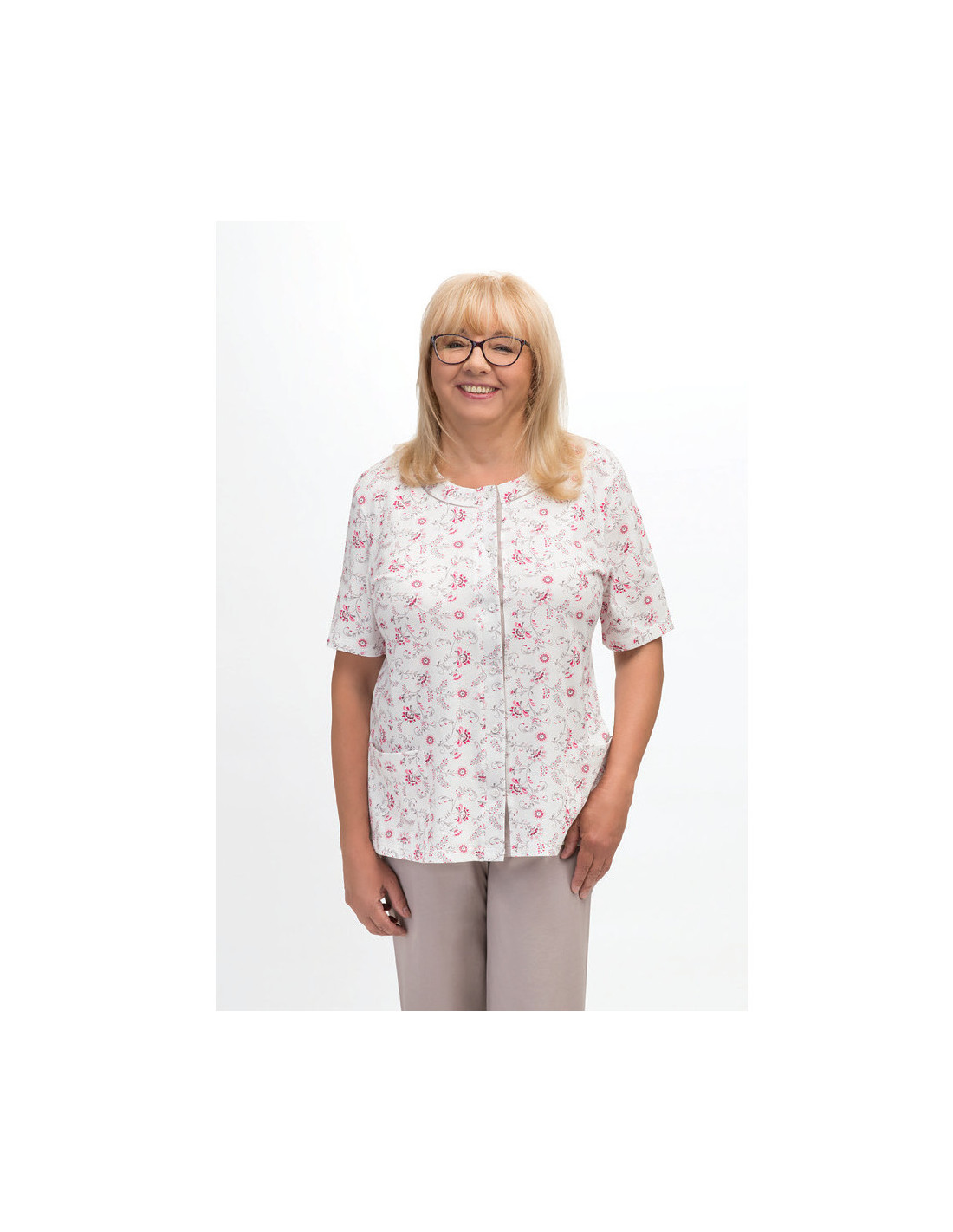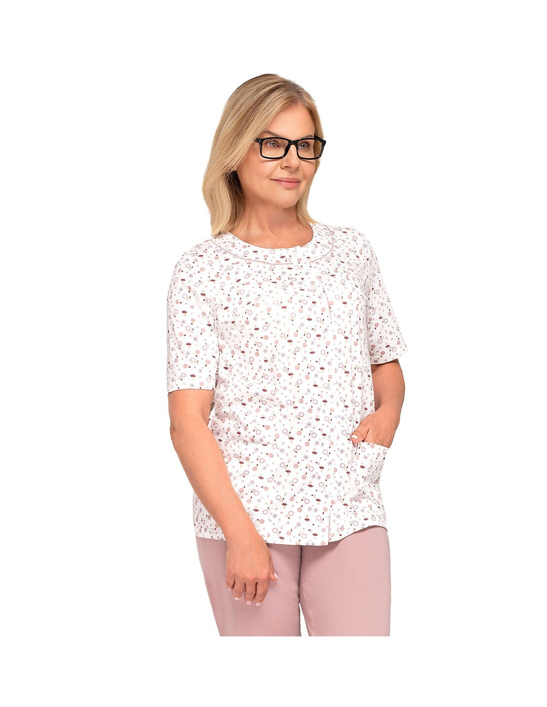 Moteriška pižama iš švelnios medvilnės - marškinėliai, puošti gėlių raštu - trumpomis rankovėmis - pusapvalė iškirptė - užsegama iškirpte - lygios 3/4 ilgio kelnės