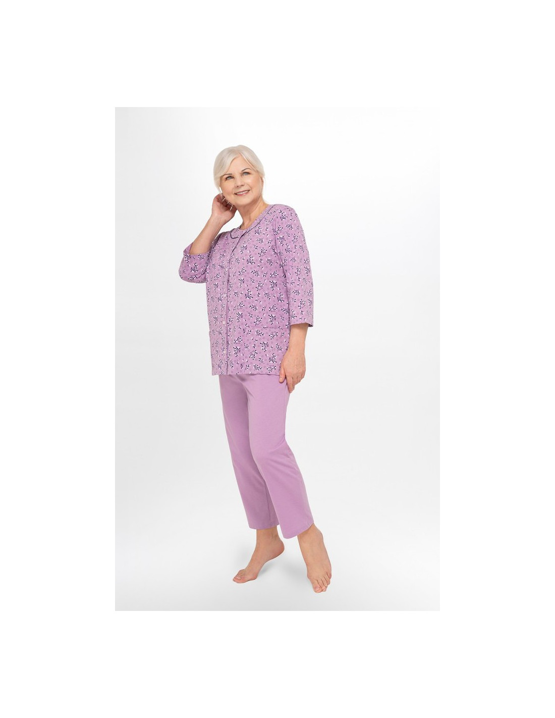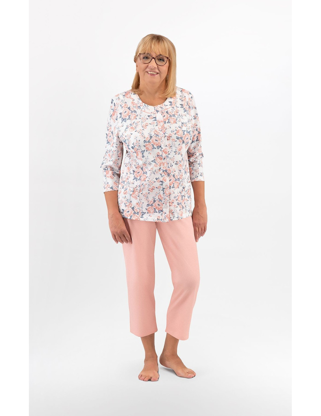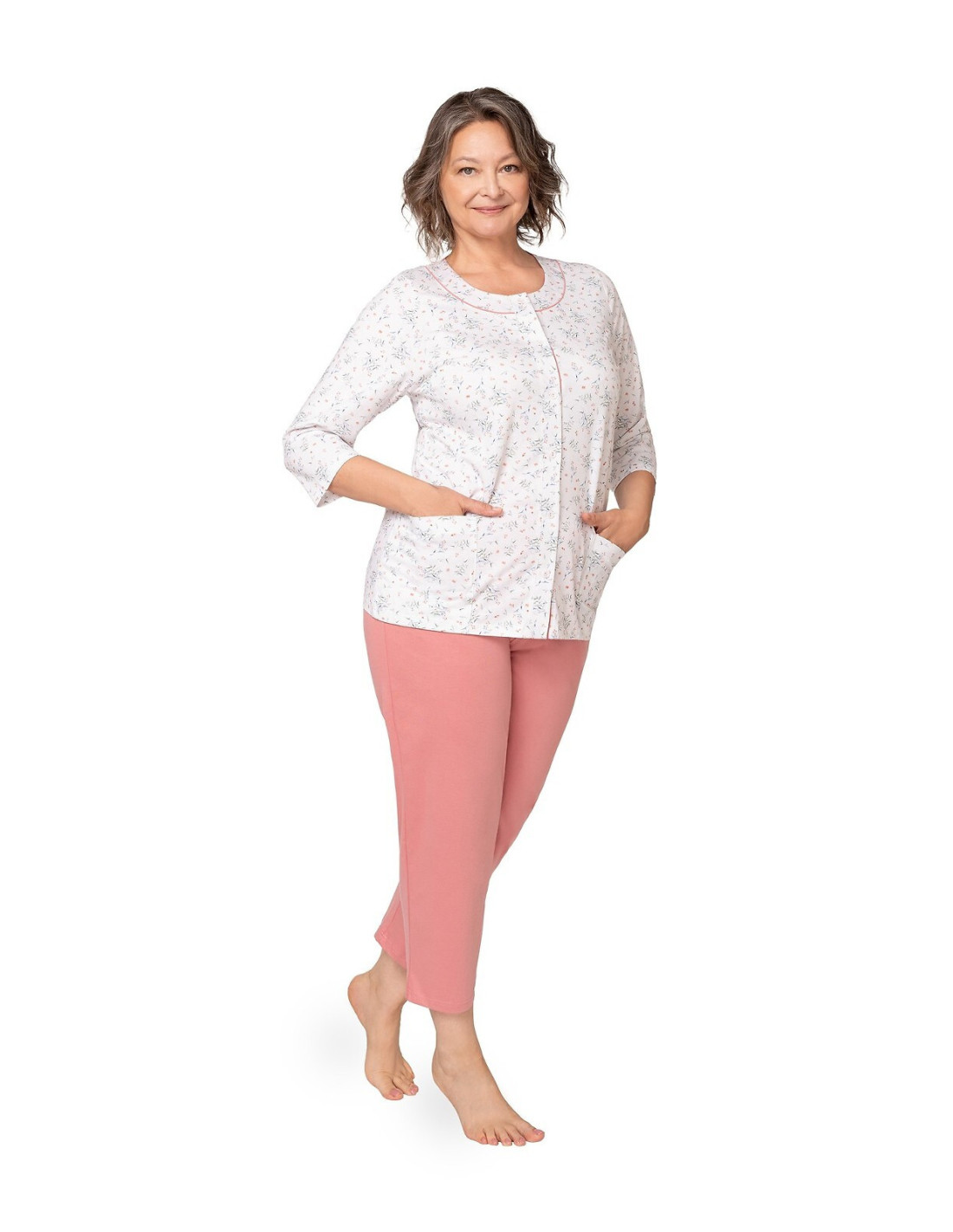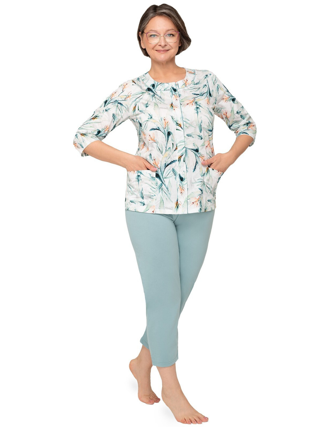 Moteriškos pižamos - pagaminta iš švelnios medvilnės - marškinėliai dekoruoti gėlių raštu - 3/4 rankovės - pusapvalė iškirptė - užsegama iškirpte - vienspalvės 3/4 ilgio kelnės