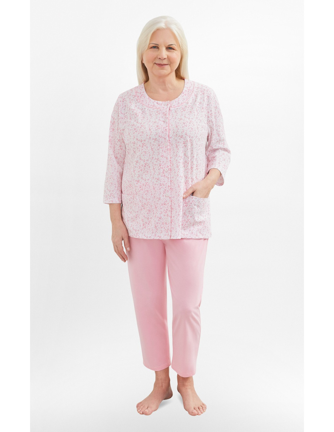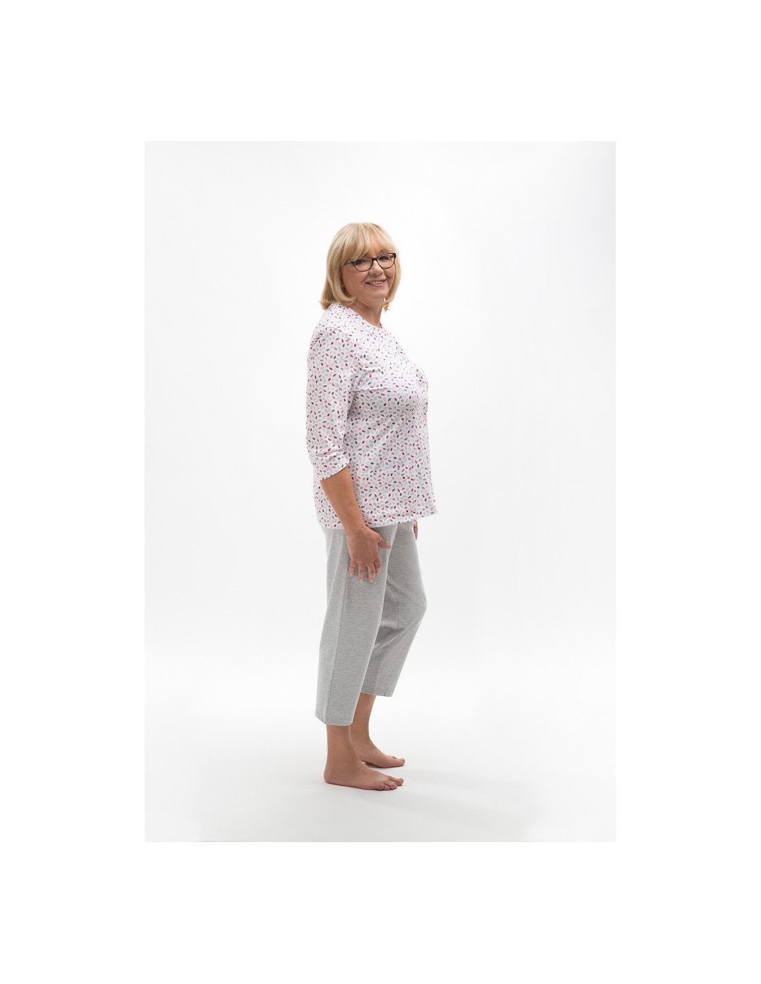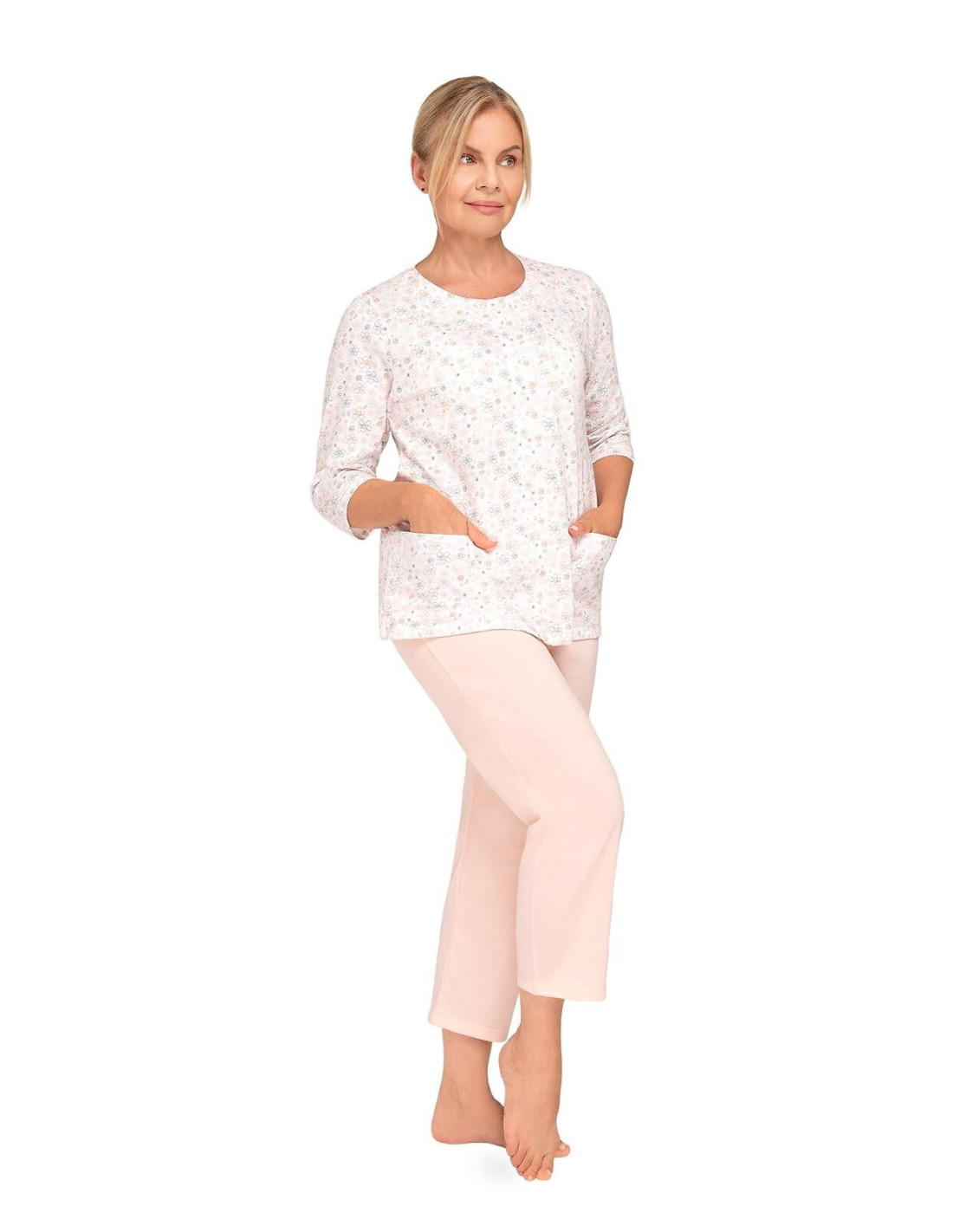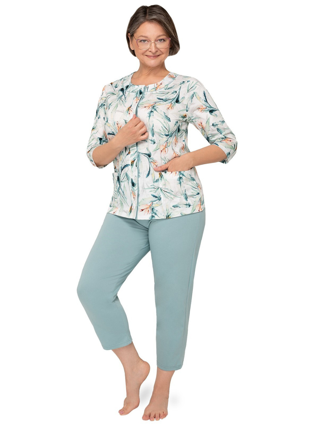 Moteriškos pižamos - pagaminta iš švelnios medvilnės - marškinėliai dekoruoti gėlių raštu - 3/4 rankovės - pusapvalė iškirptė - užsegama iškirpte - vienspalvės 3/4 ilgio kelnės