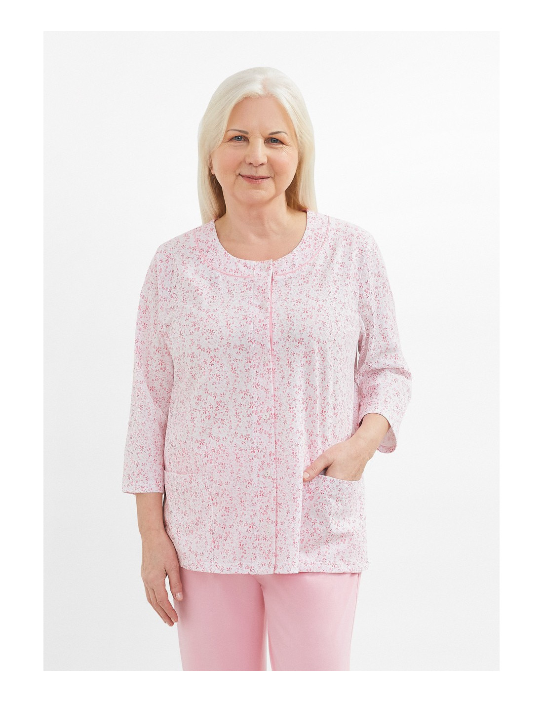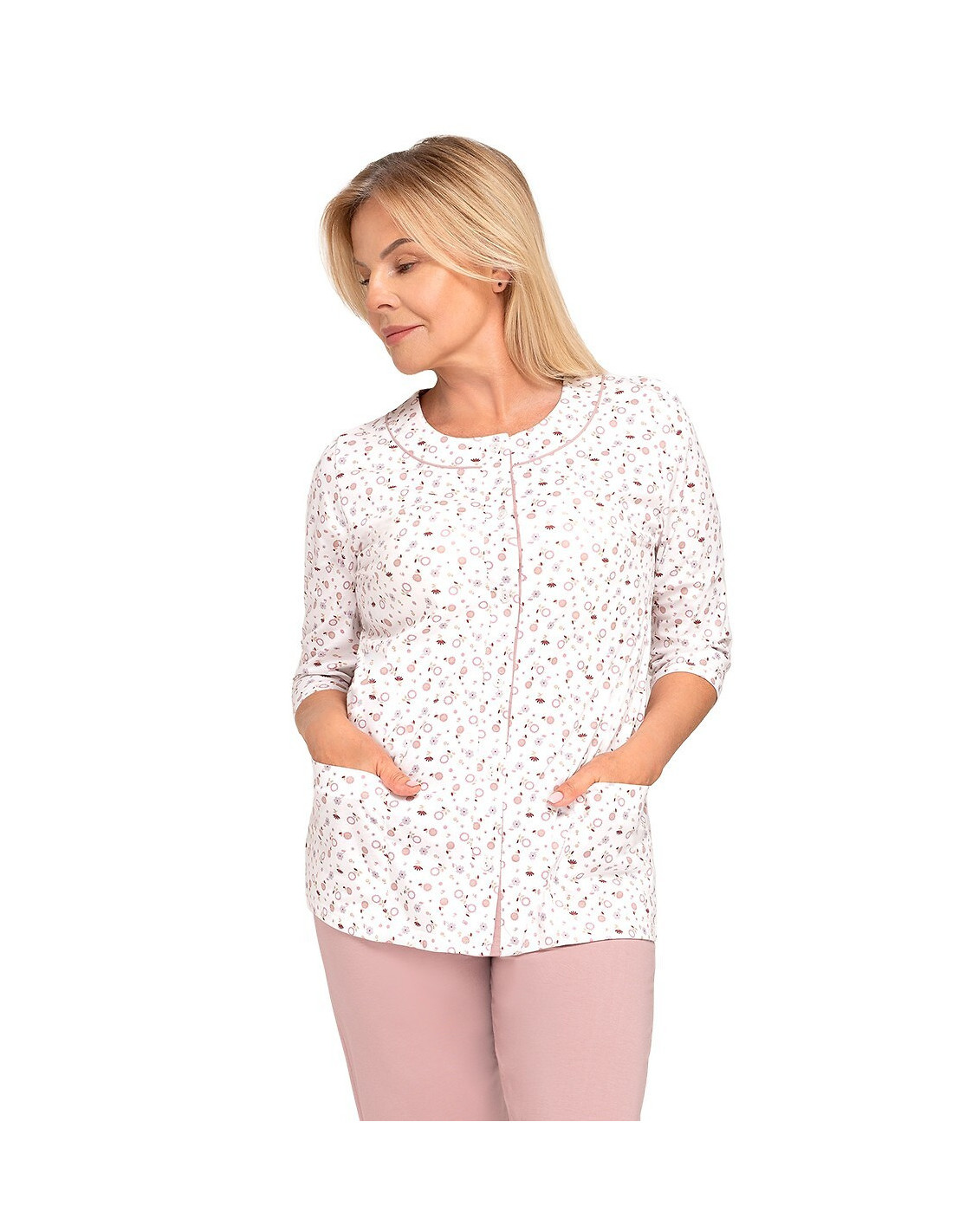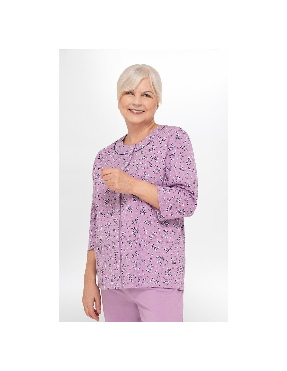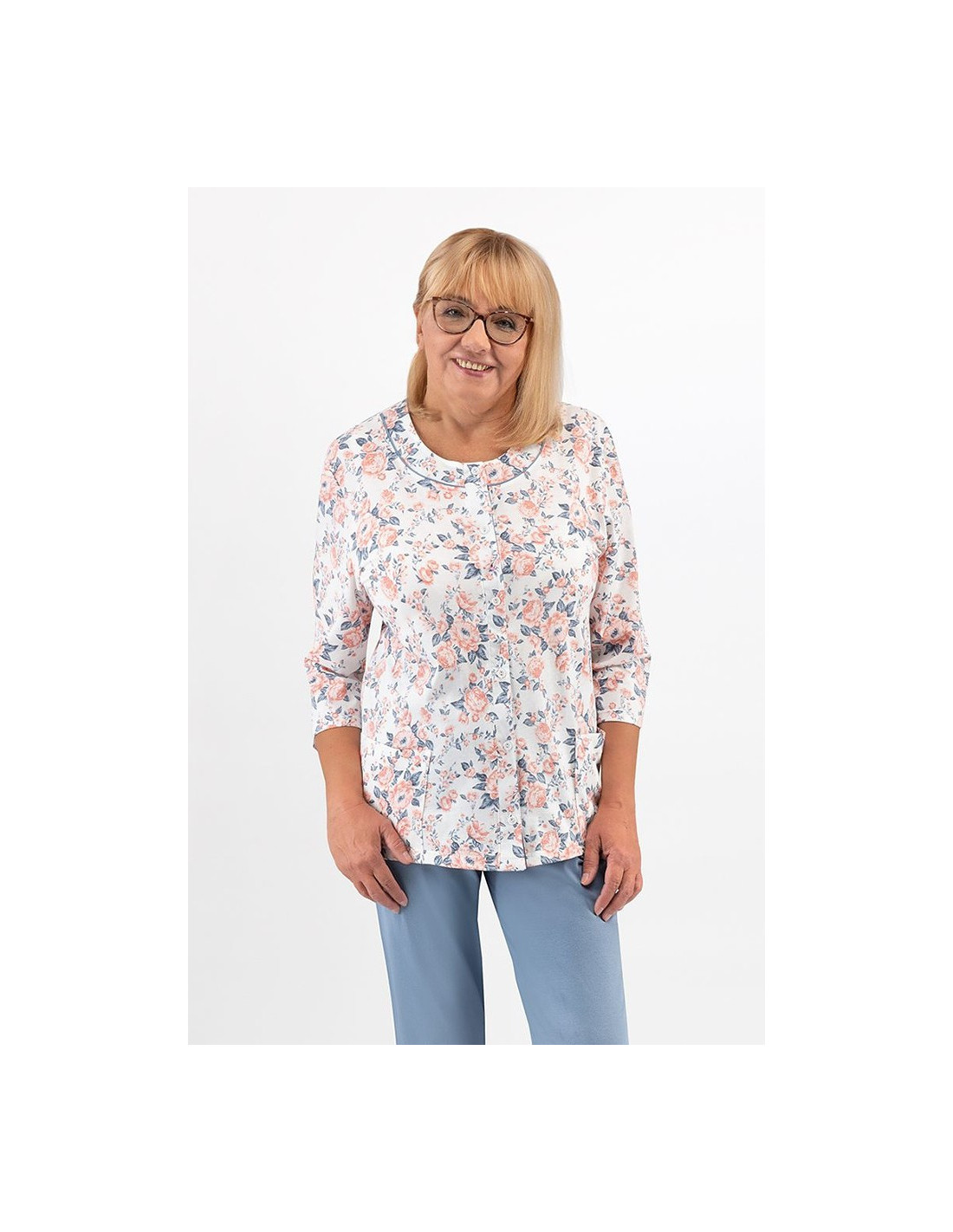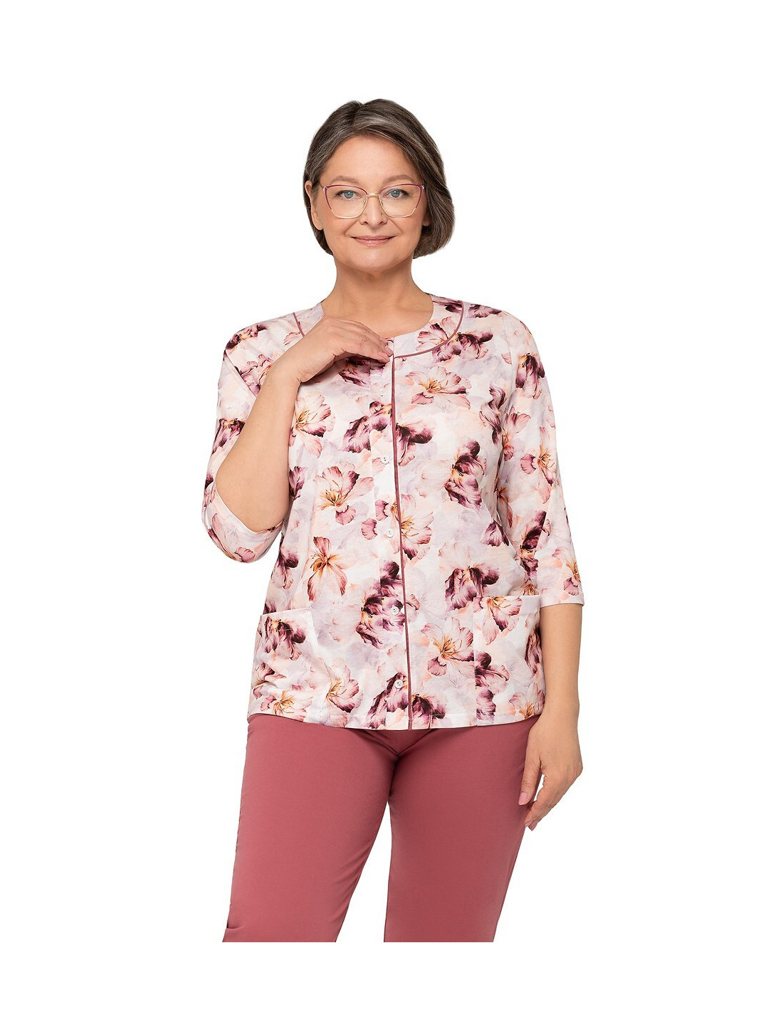 Moteriškos pižamos - pagaminta iš švelnios medvilnės - marškinėliai dekoruoti gėlių raštu - 3/4 rankovės - pusapvalė iškirptė - užsegama iškirpte - vienspalvės 3/4 ilgio kelnės