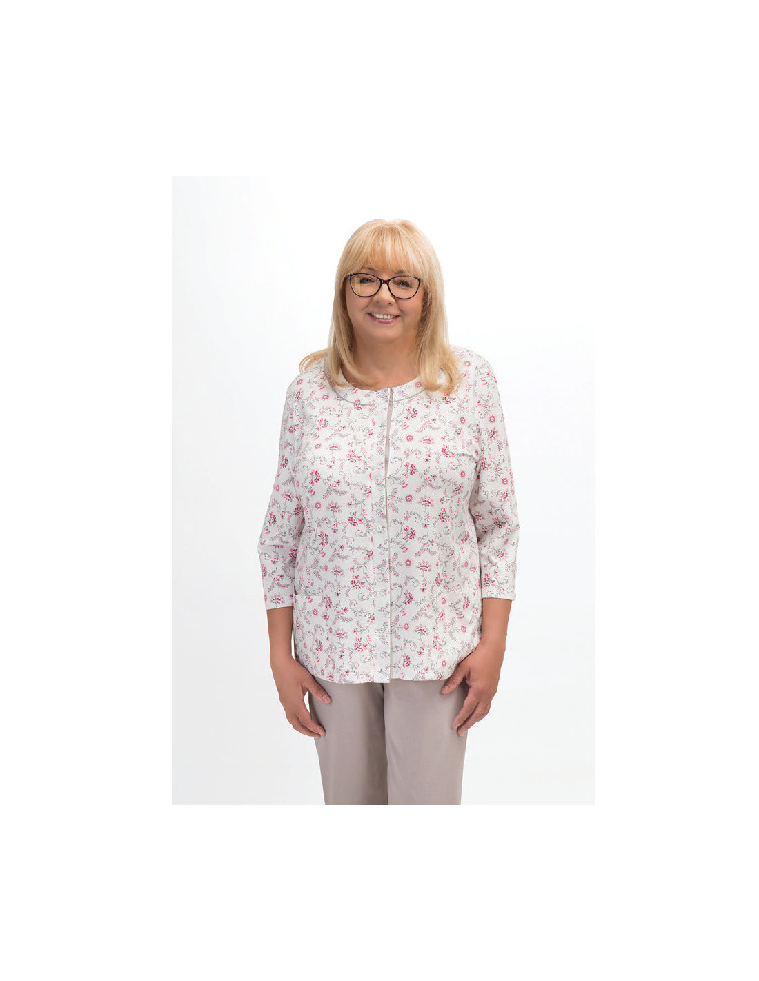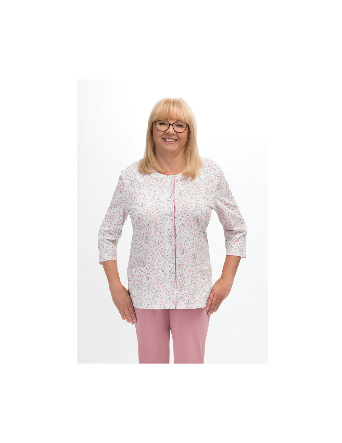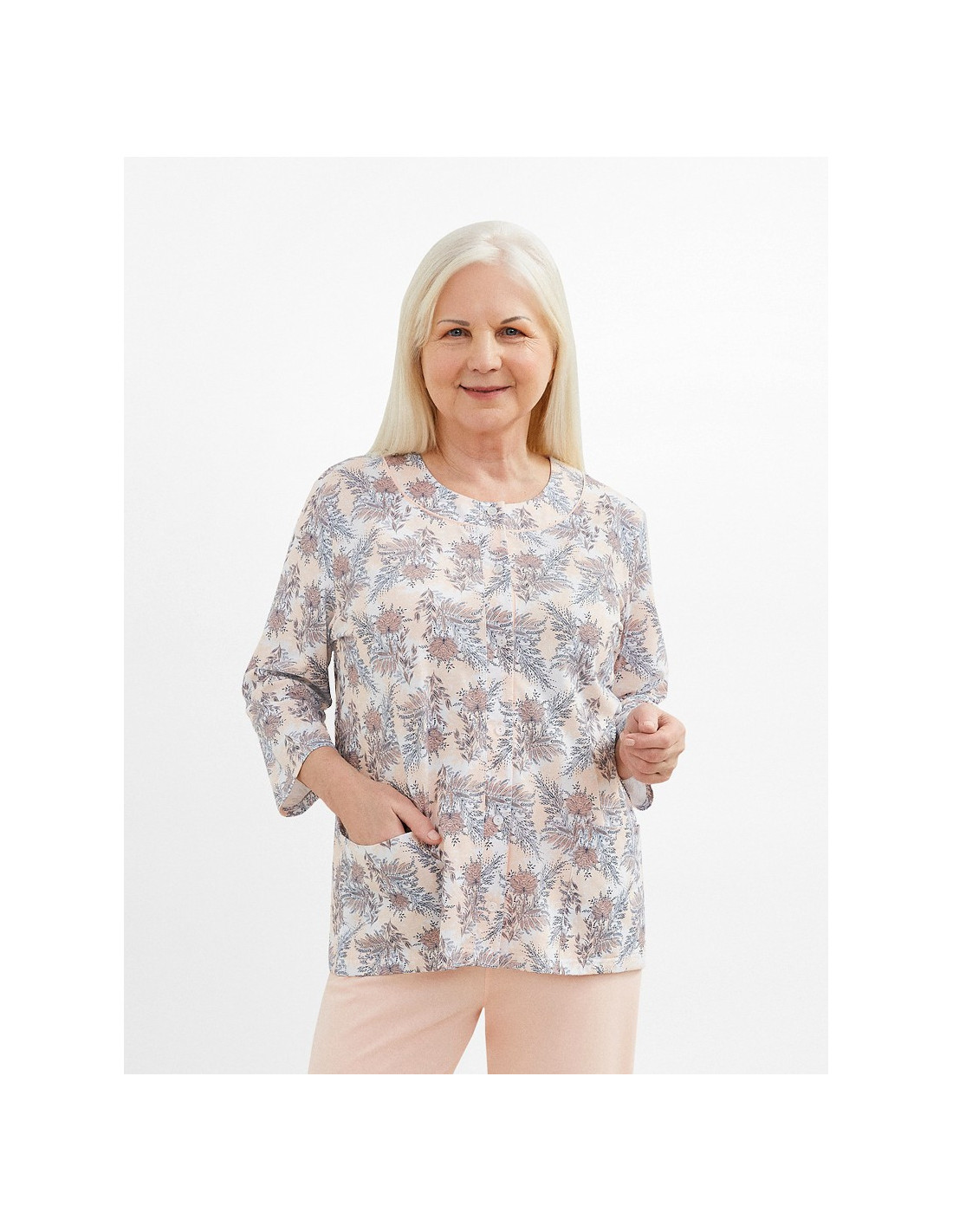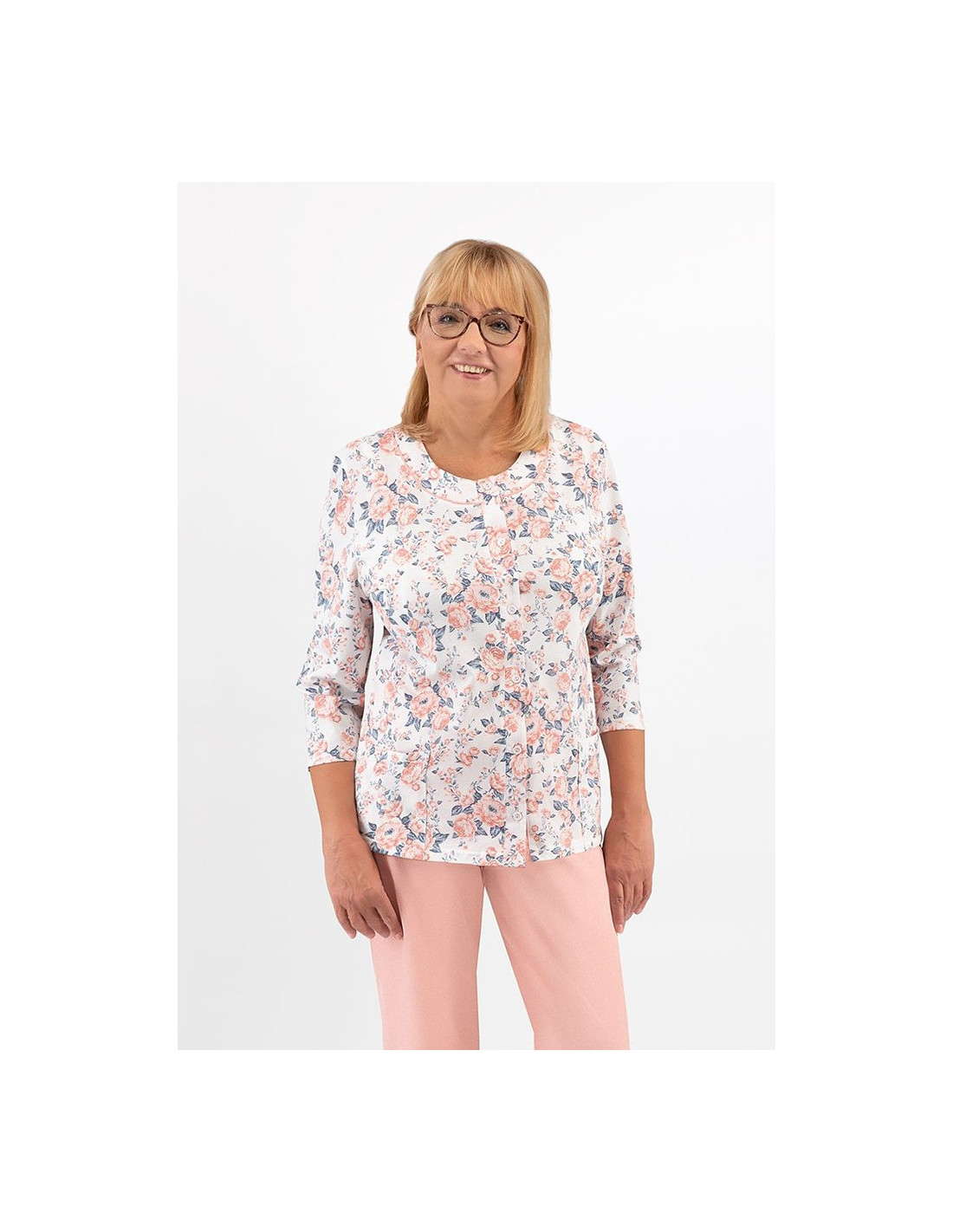 Moteriškos pižamos - pagaminta iš švelnios medvilnės - marškinėliai dekoruoti gėlių raštu - 3/4 rankovės - pusapvalė iškirptė - užsegama iškirpte - vienspalvės 3/4 ilgio kelnės