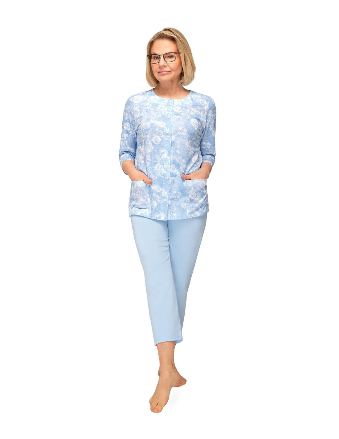 Moteriškos pižamos - pagaminta iš švelnios medvilnės - marškinėliai dekoruoti gėlių raštu - 3/4 rankovės - pusapvalė iškirptė - užsegama iškirpte - vienspalvės 3/4 ilgio kelnės