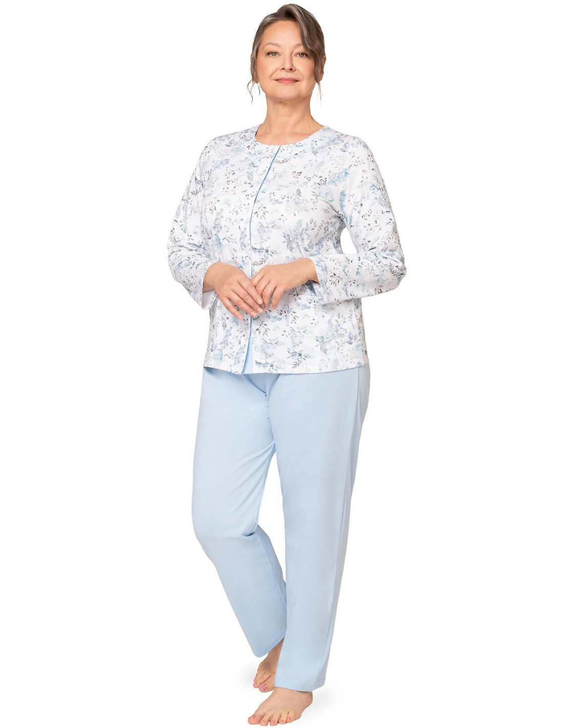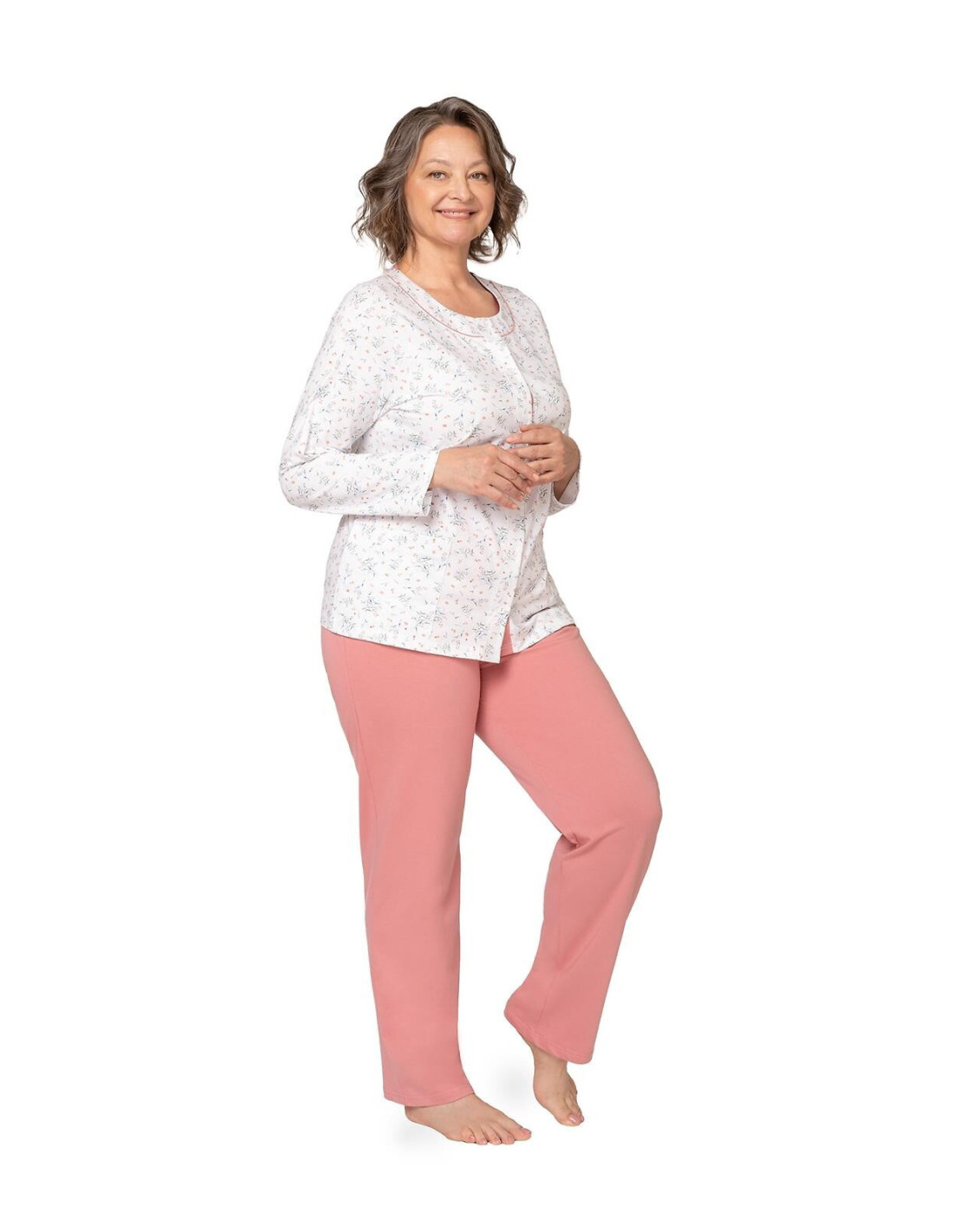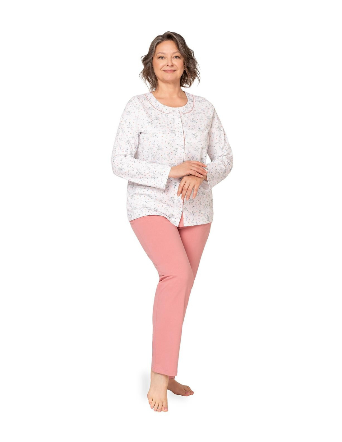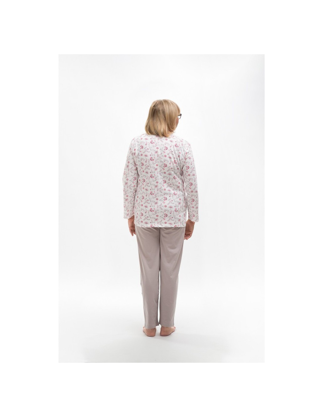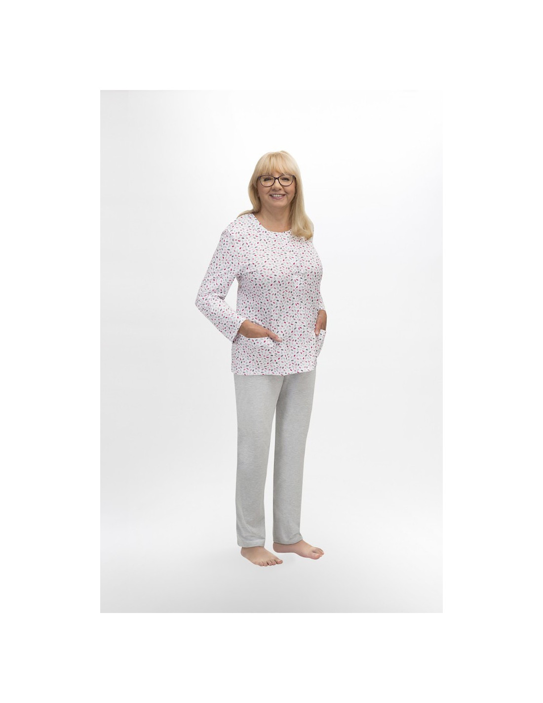 Moteriška medvilninė pižama - prigludę marškinėliai ilgomis rankovėmis - raštuotas - apvali iškirptė - vienspalvės kelnės ilgomis kelnėmis - liemuo su elastine juosta