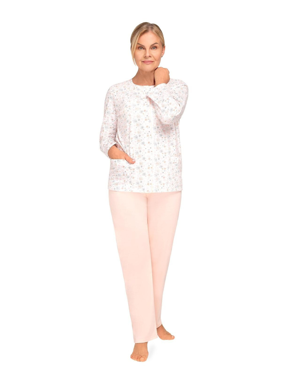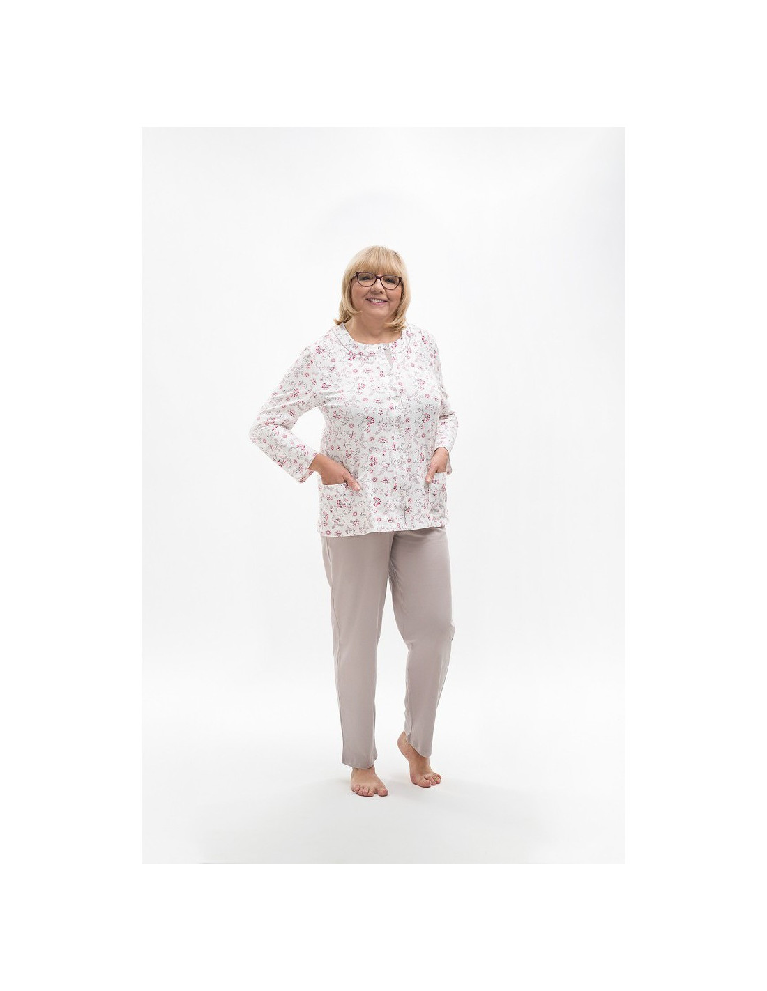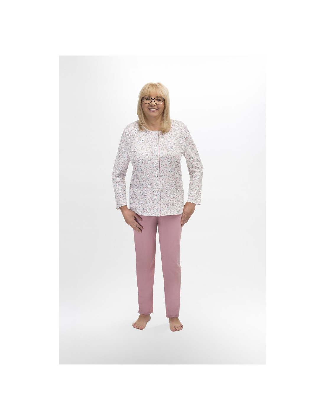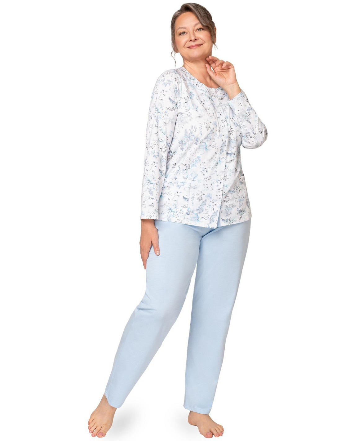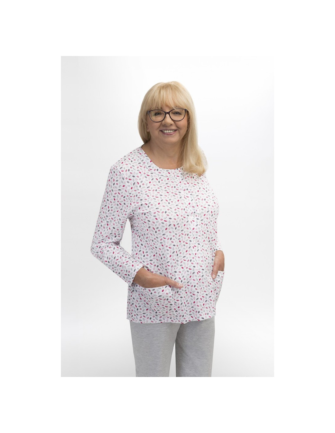 Moteriška medvilninė pižama - prigludę marškinėliai ilgomis rankovėmis - raštuotas - apvali iškirptė - vienspalvės kelnės ilgomis kelnėmis - liemuo su elastine juosta