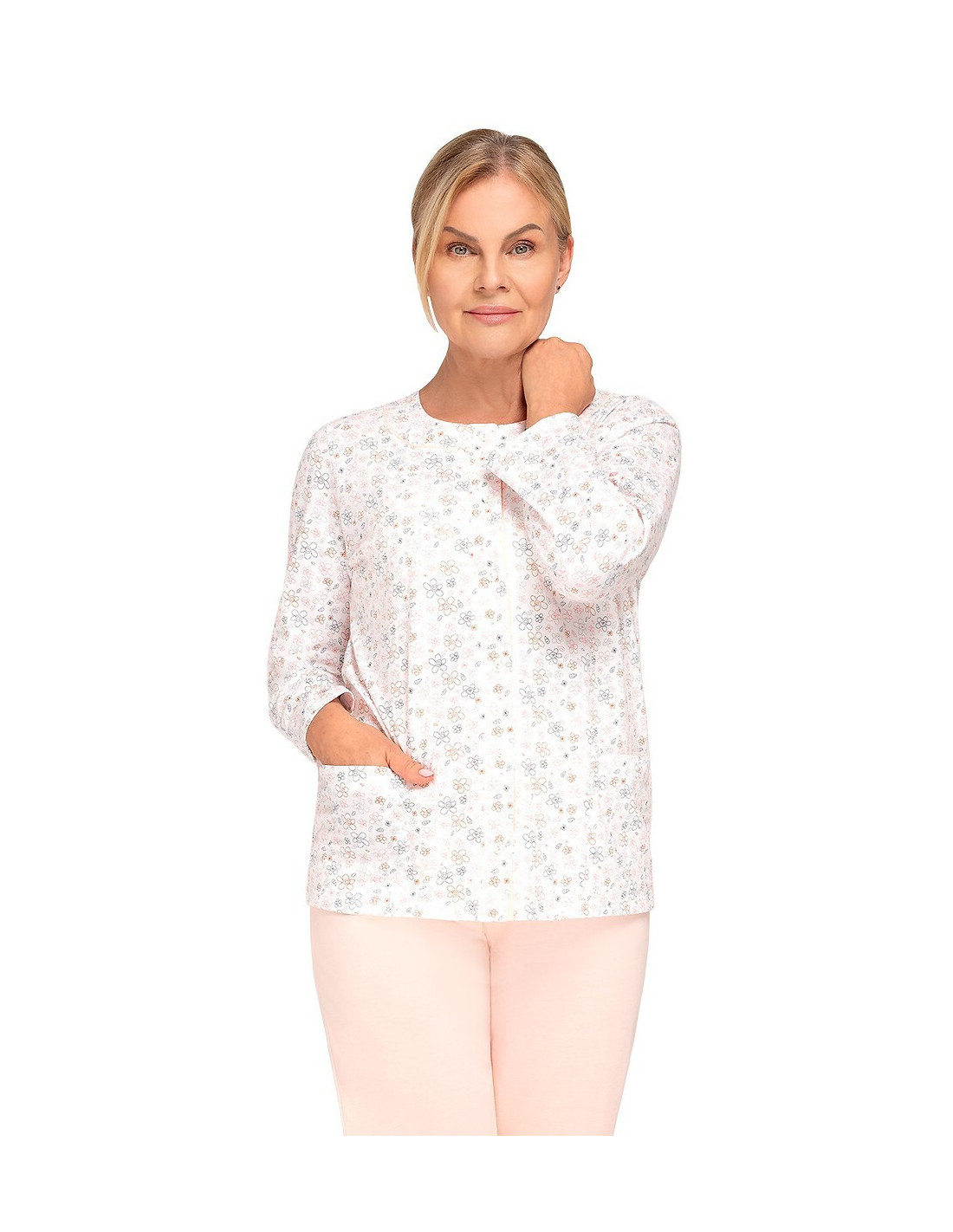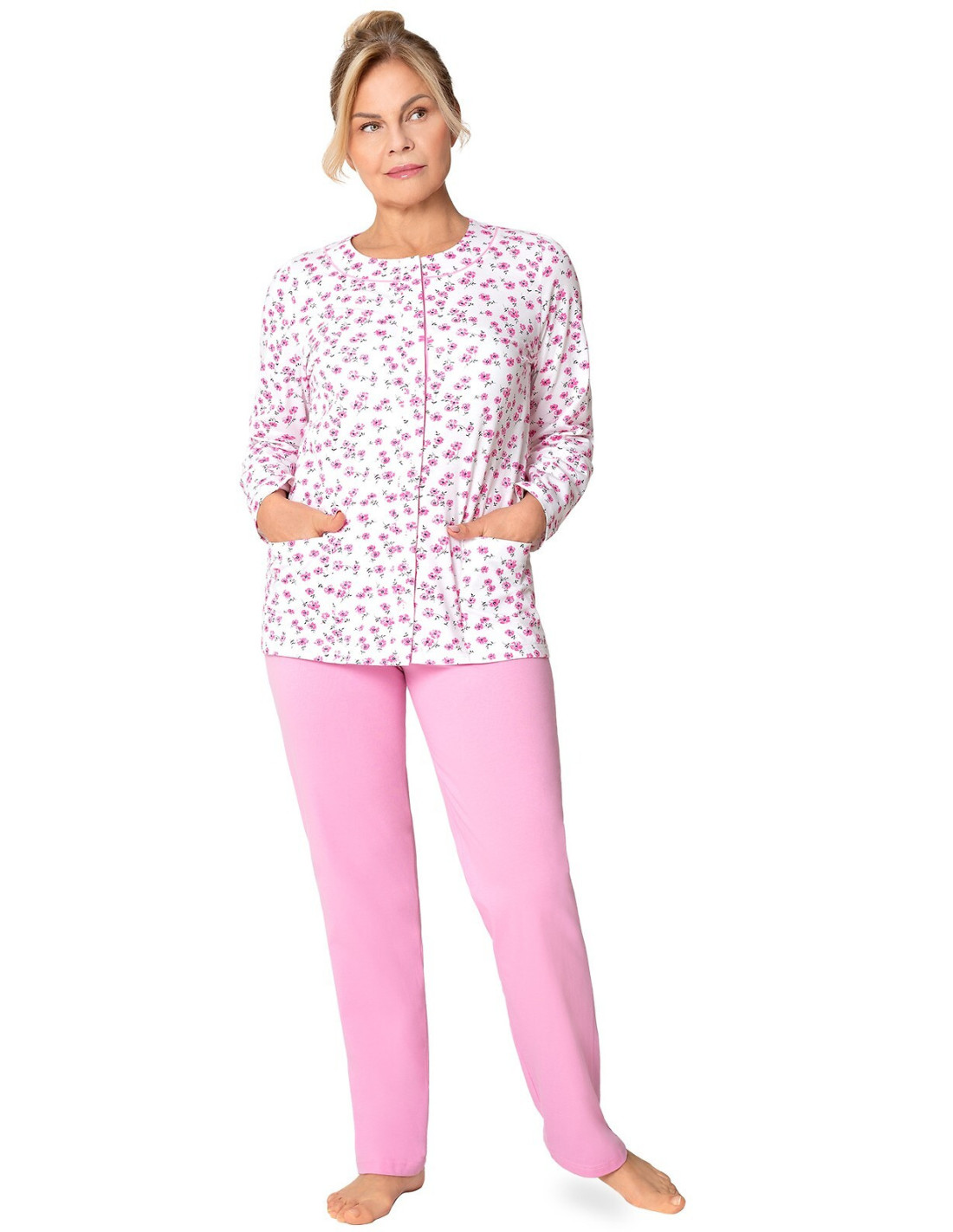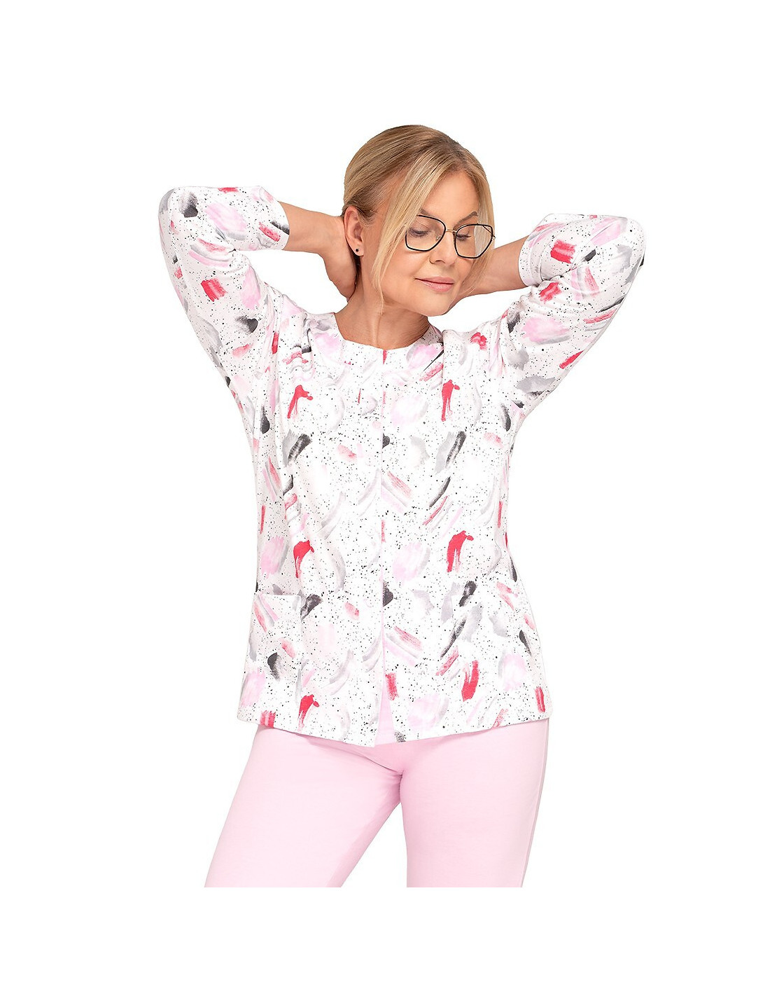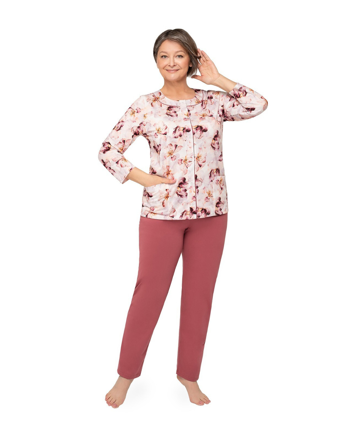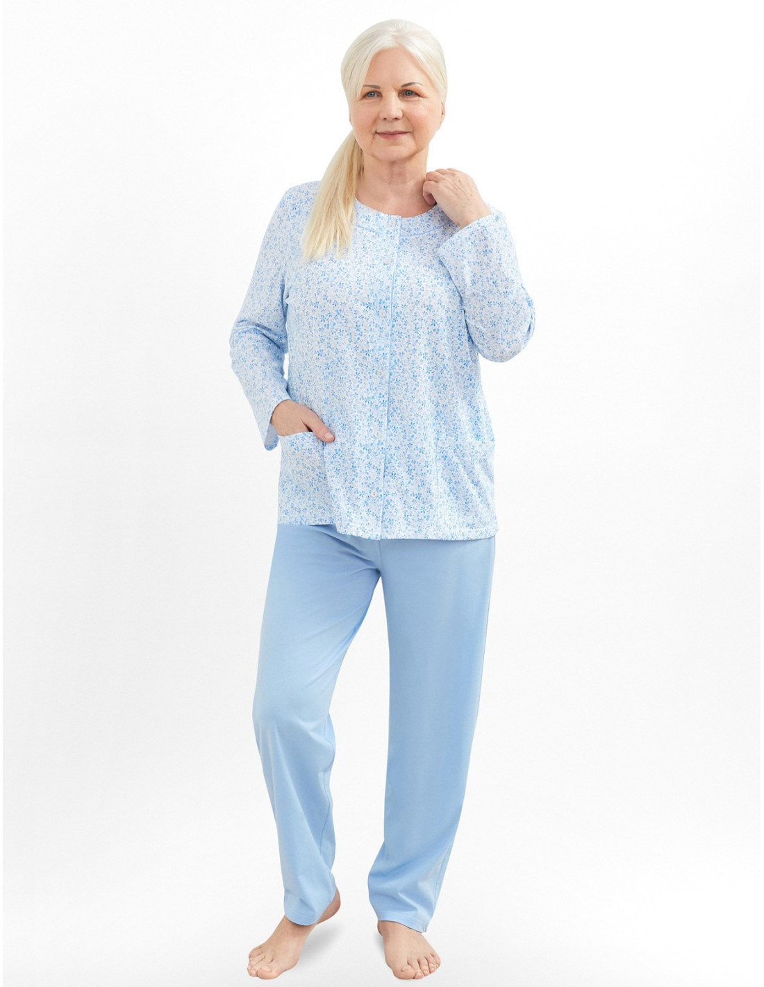 Moteriška medvilninė pižama - prigludę marškinėliai ilgomis rankovėmis - raštuotas - apvali iškirptė - vienspalvės kelnės ilgomis kelnėmis - liemuo su elastine juosta