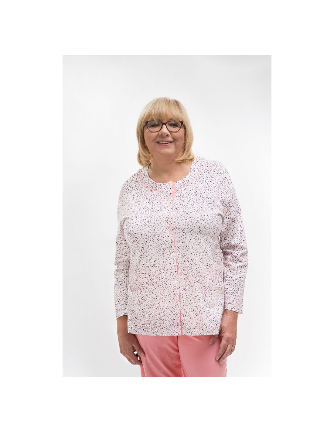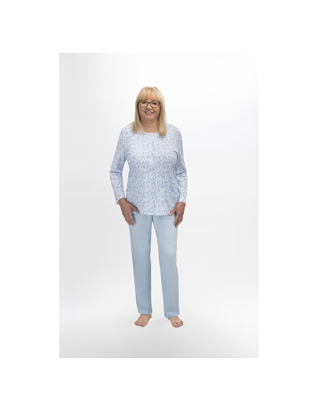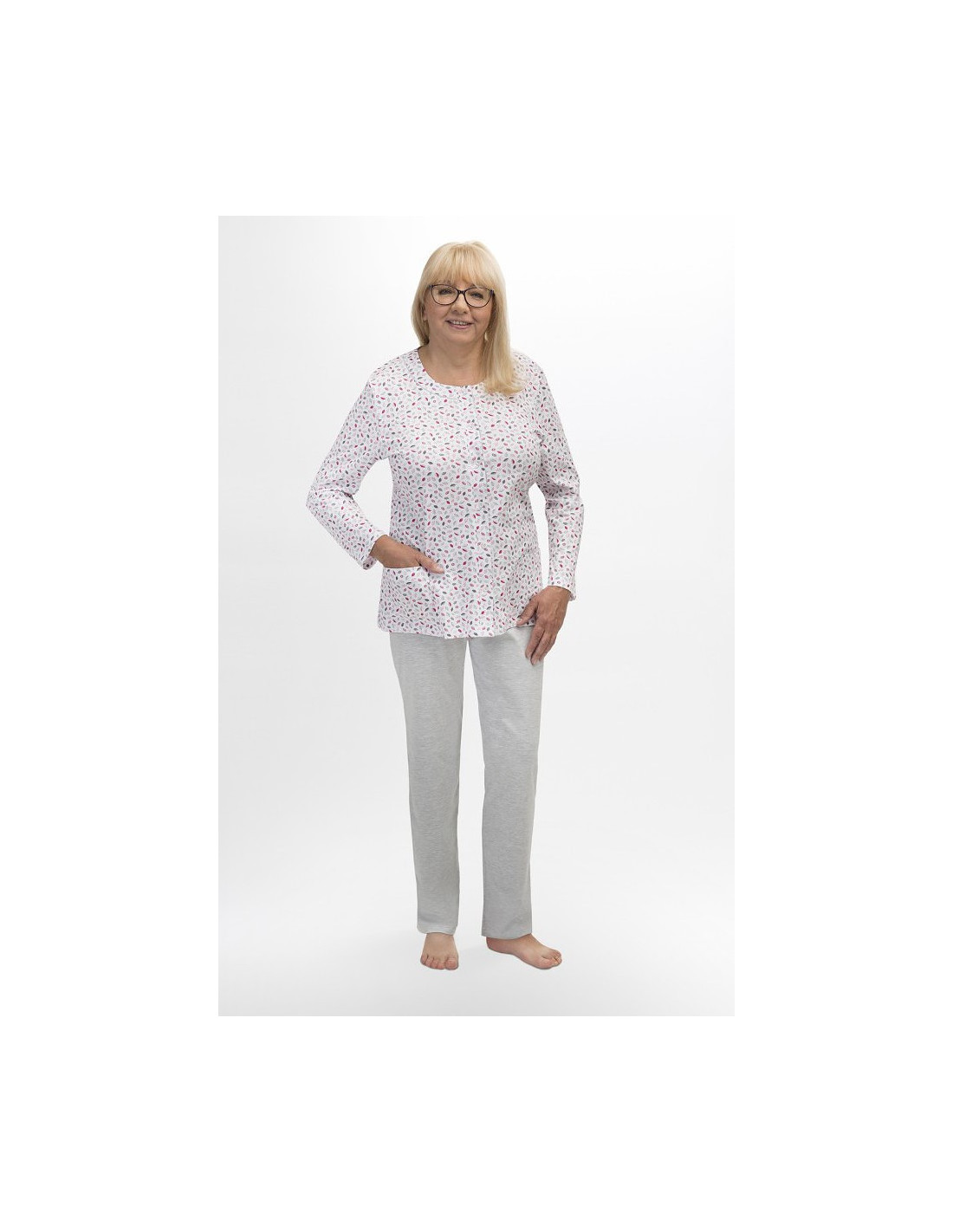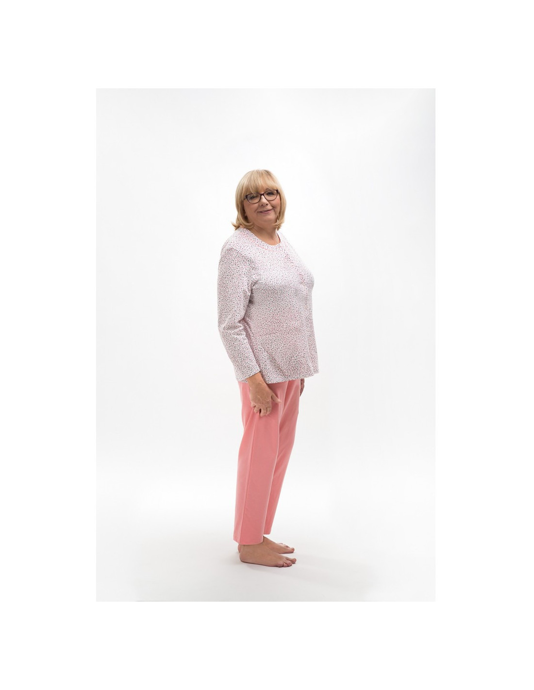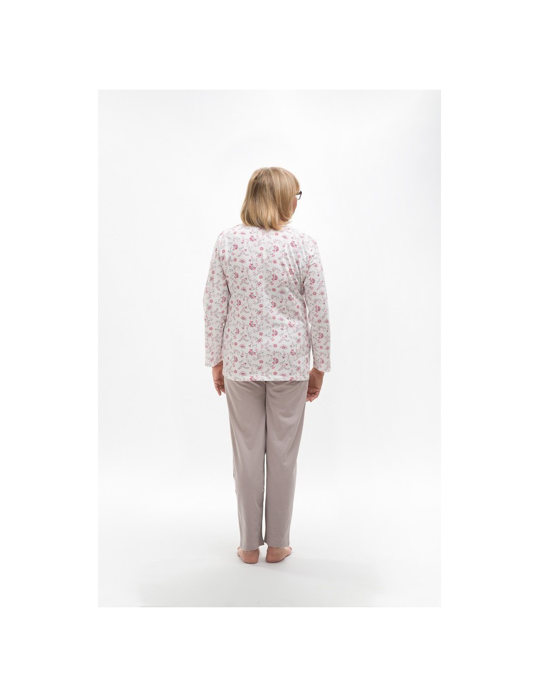 Moteriška medvilninė pižama - prigludę marškinėliai ilgomis rankovėmis - raštuotas - apvali iškirptė - vienspalvės kelnės ilgomis kelnėmis - liemuo su elastine juosta