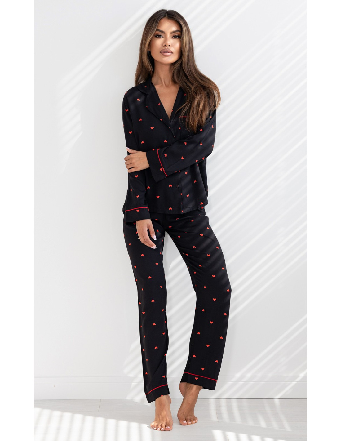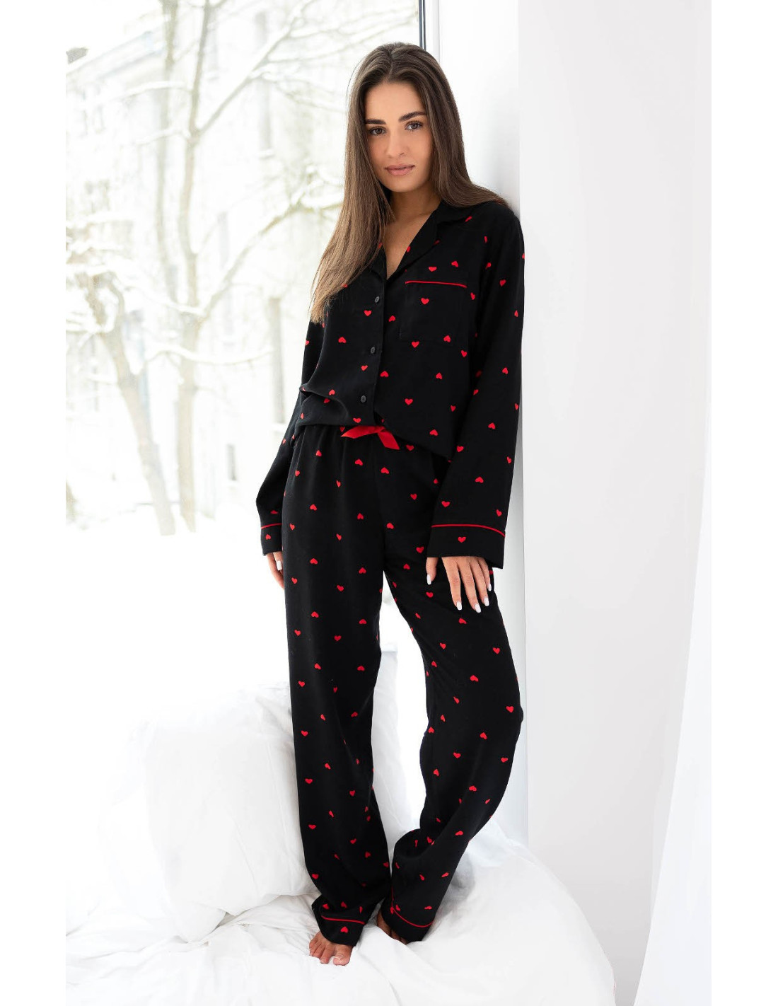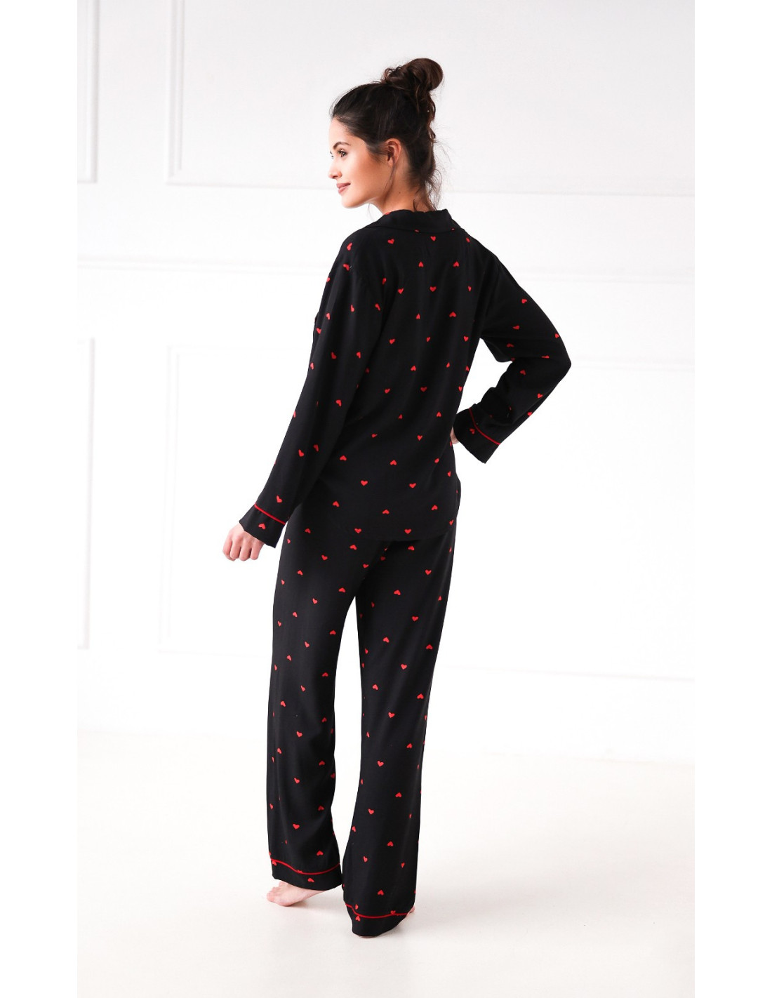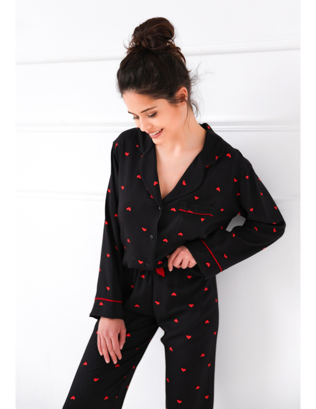 Minkšto širdies audinio moteriška pižama - marškiniai ilgomis rankovėmis - užsegami, su apykakle - maža kišenėlė kairėje pusėje - ilgos, tiesios kelnės - liemuo su elastine juosta ir atlasiniu lankeliu