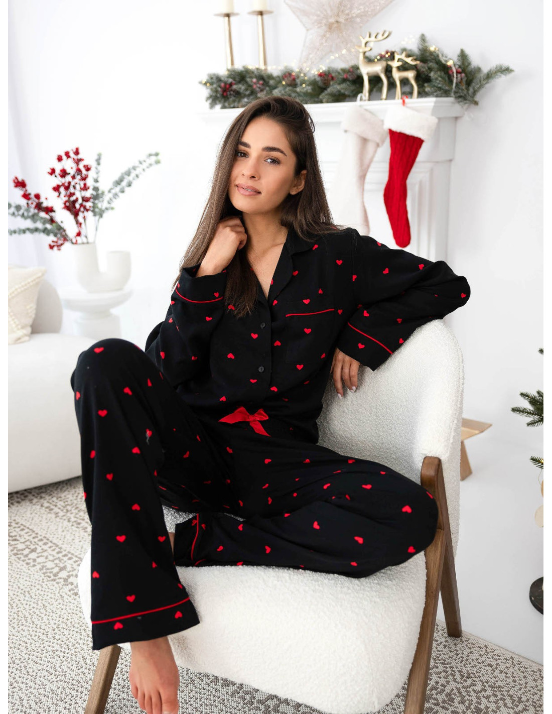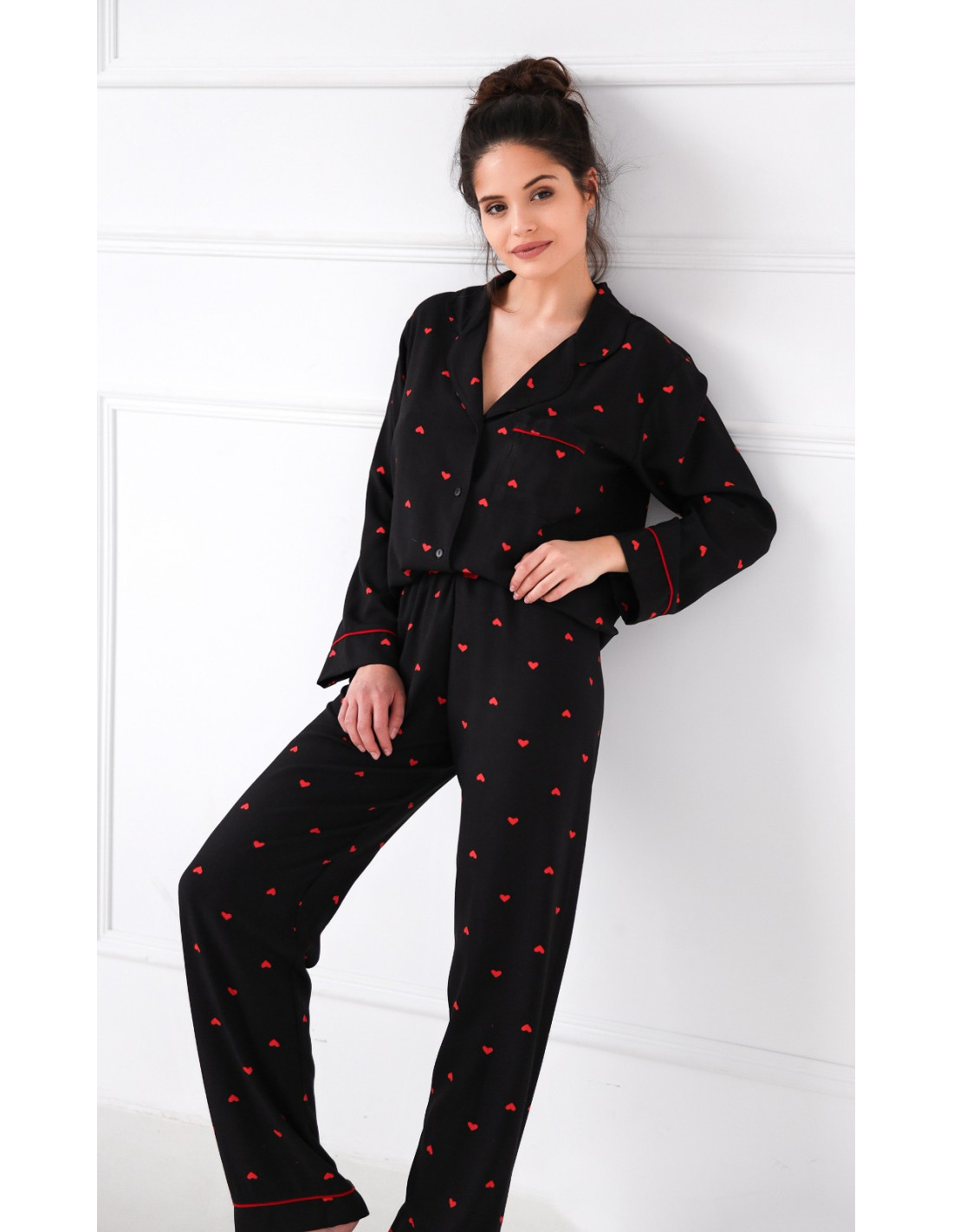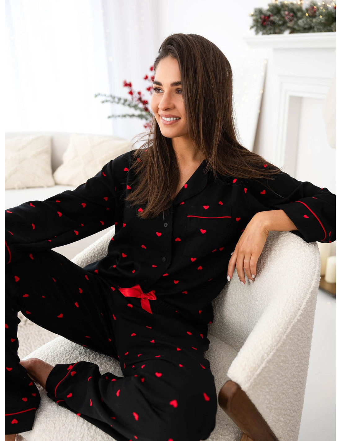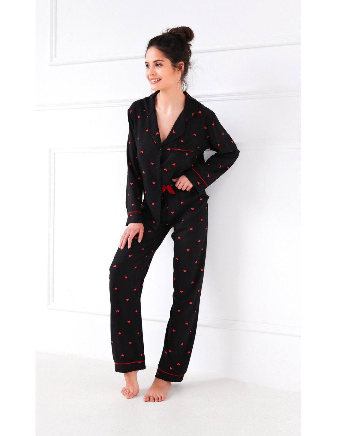 Minkšto širdies audinio moteriška pižama - marškiniai ilgomis rankovėmis - užsegami, su apykakle - maža kišenėlė kairėje pusėje - ilgos, tiesios kelnės - liemuo su elastine juosta ir atlasiniu lankeliu