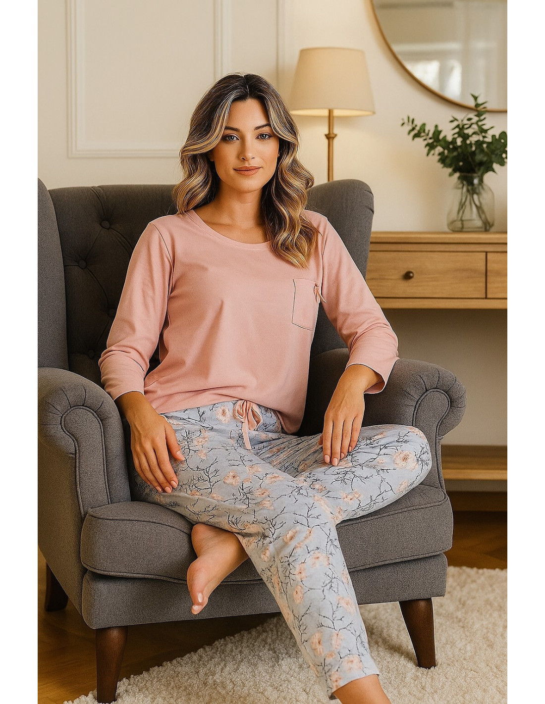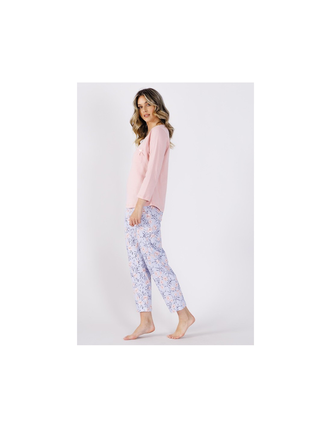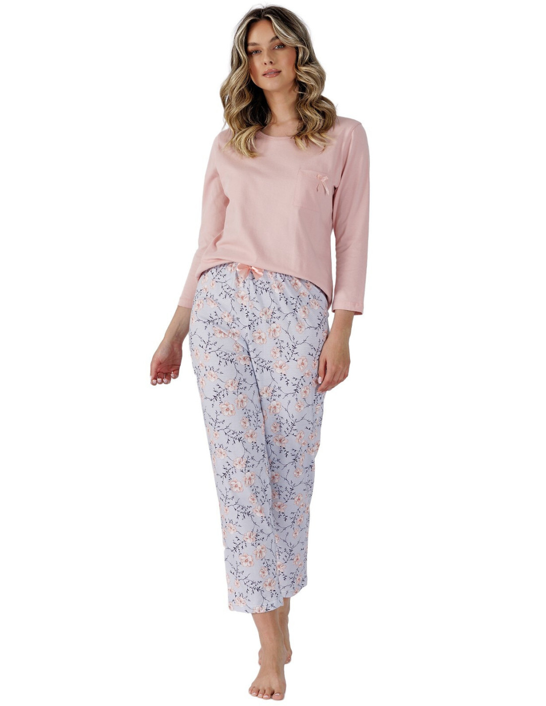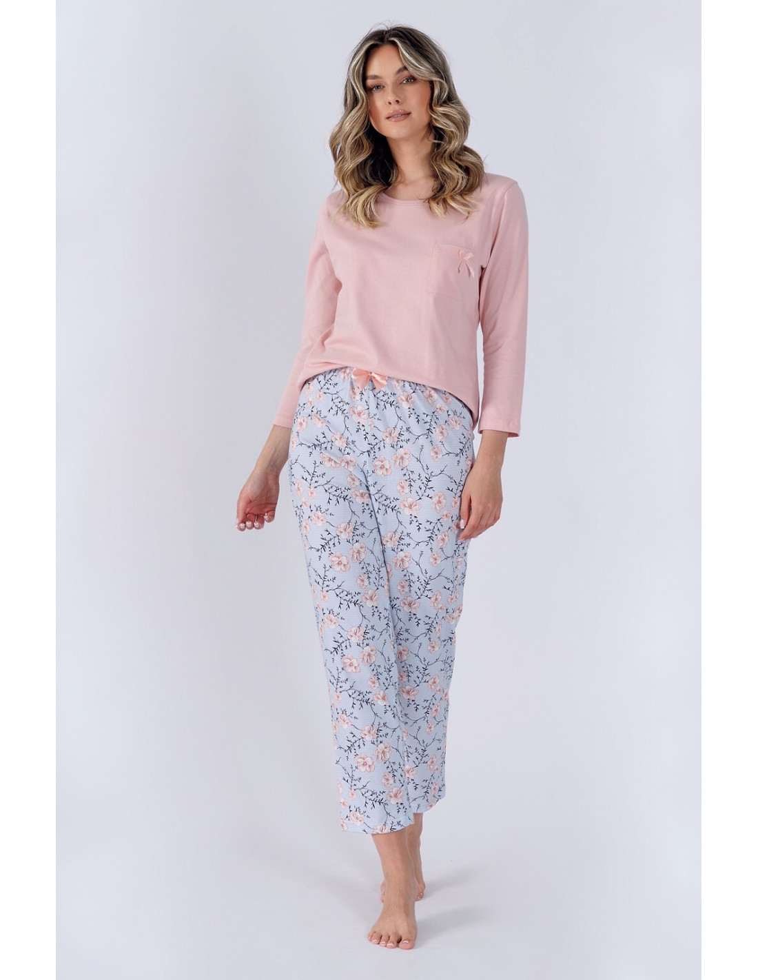 Moteriškos pižamos - aukštos kokybės švelni medvilnė - viengubas trikotažas - apvali iškirptė - prisiūta krūtinės kišenė - kelnės su gėlių motyvais - dekoratyvinis atlasinis lankelis ties juosmeniu - rankogaliai ir kojos 7/8 ilgio