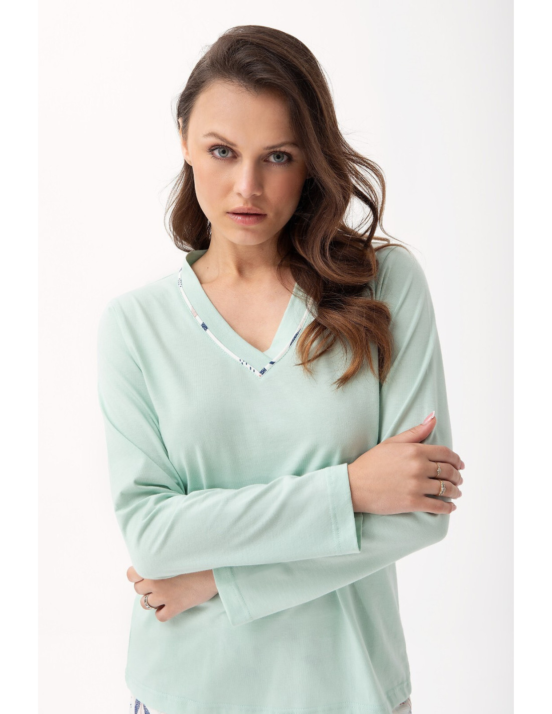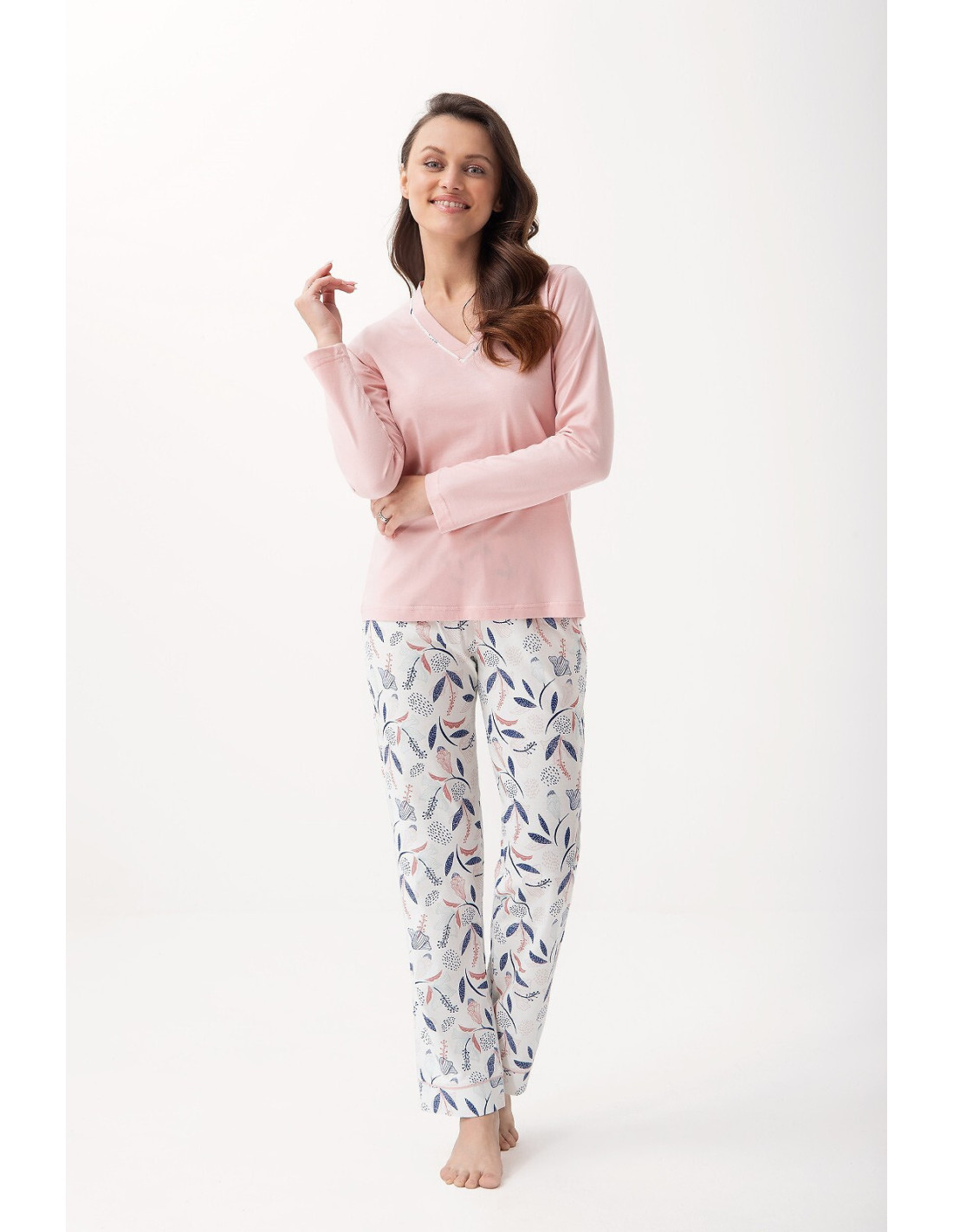 Moteriška medvilninė pižama - vienspalvis trikotažas ilgomis rankovėmis - v formos iškirptė - ilgos kelnės su ryškiu gėlių raštu - atlasinis lankelis ties juosmeniu - patogios kišenės ant klubų