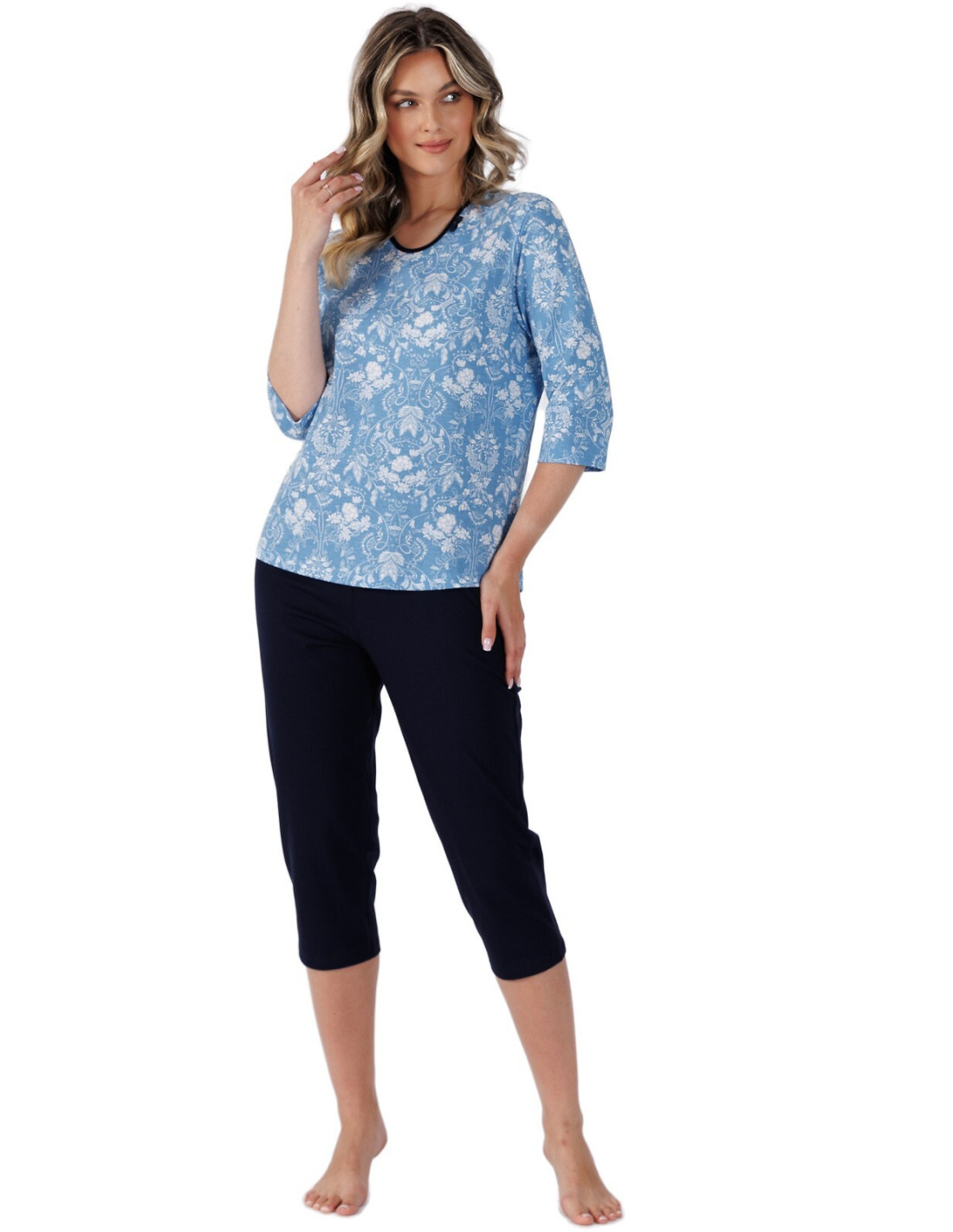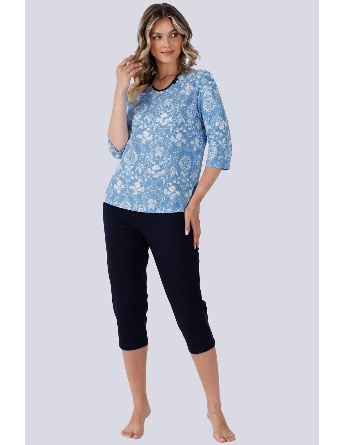 Moteriškos pižamos - aukštos kokybės švelni medvilnė - gėlių raštais dekoruota liemenėlė - apvali iškirptė - 3/4 ilgio rankovės - vienspalvės "žuvies uodegos" tipo kelnės - patogus elastinis juosmuo